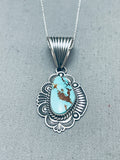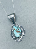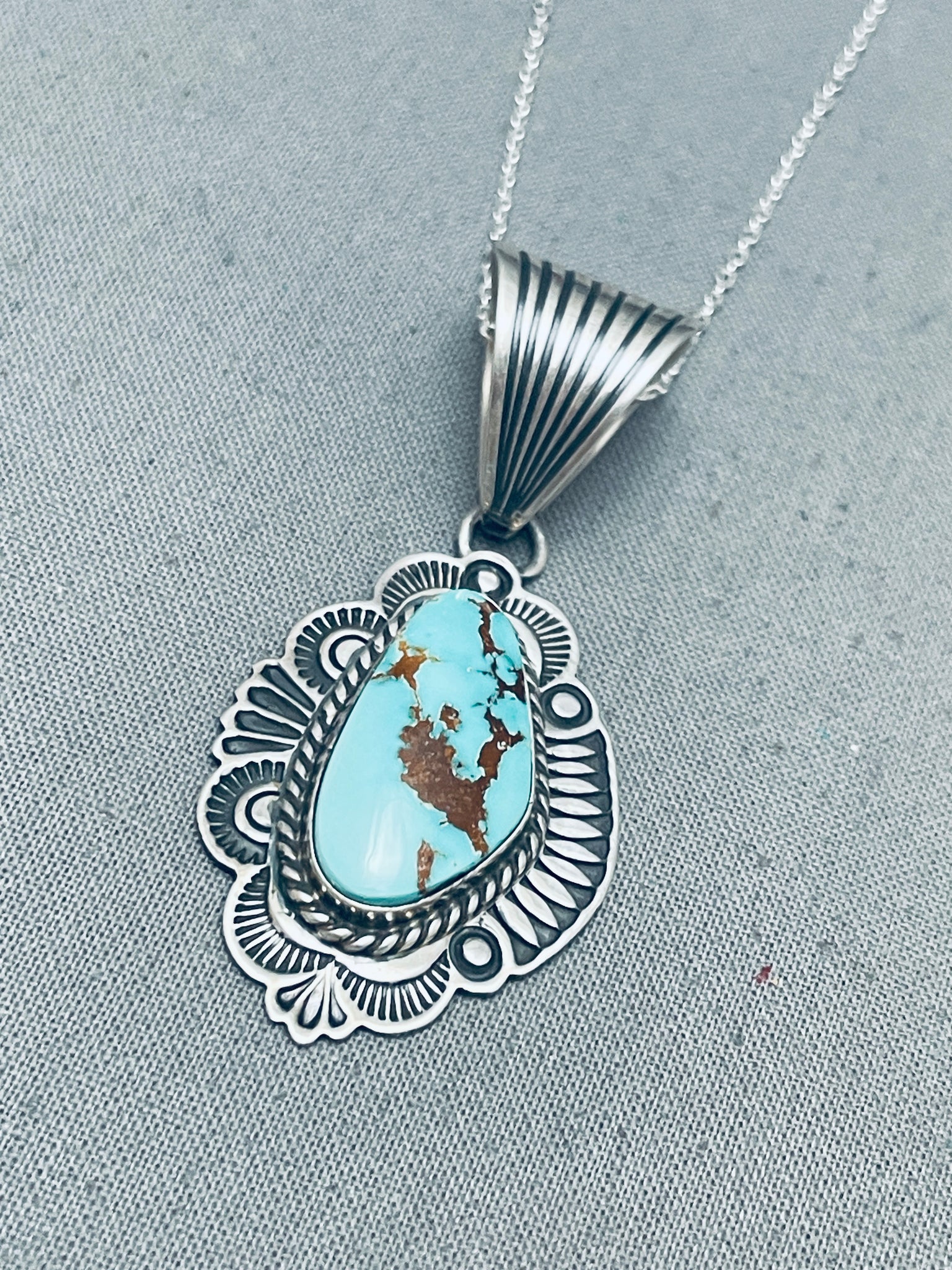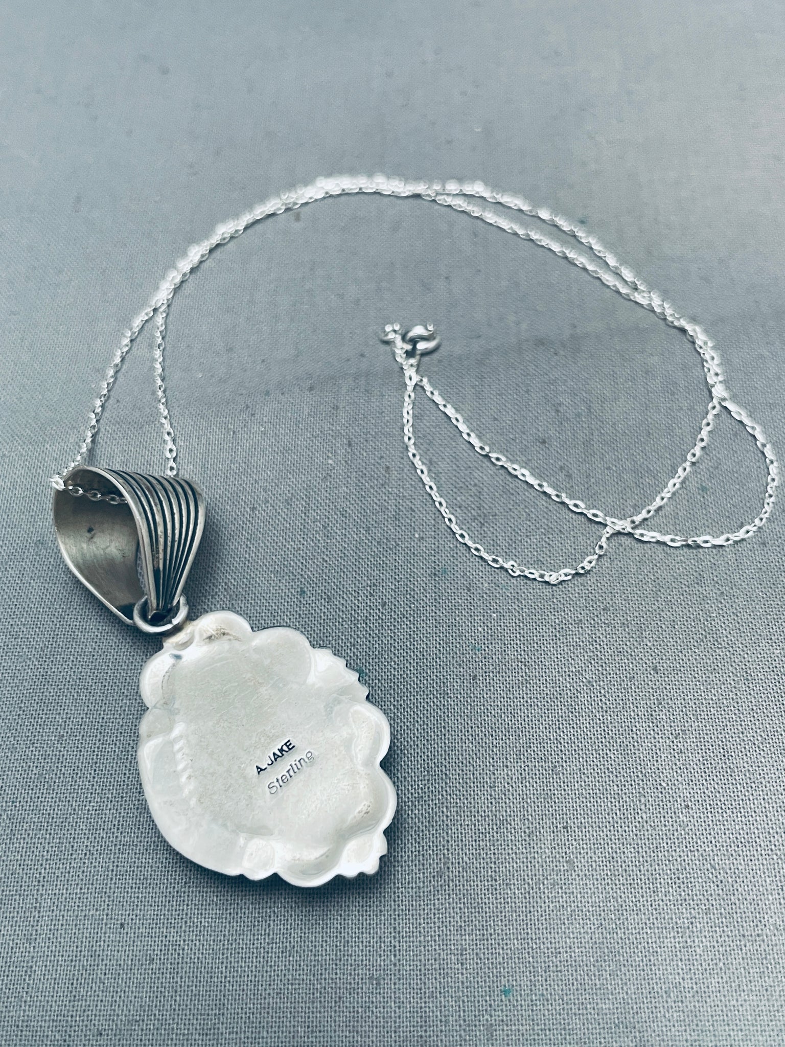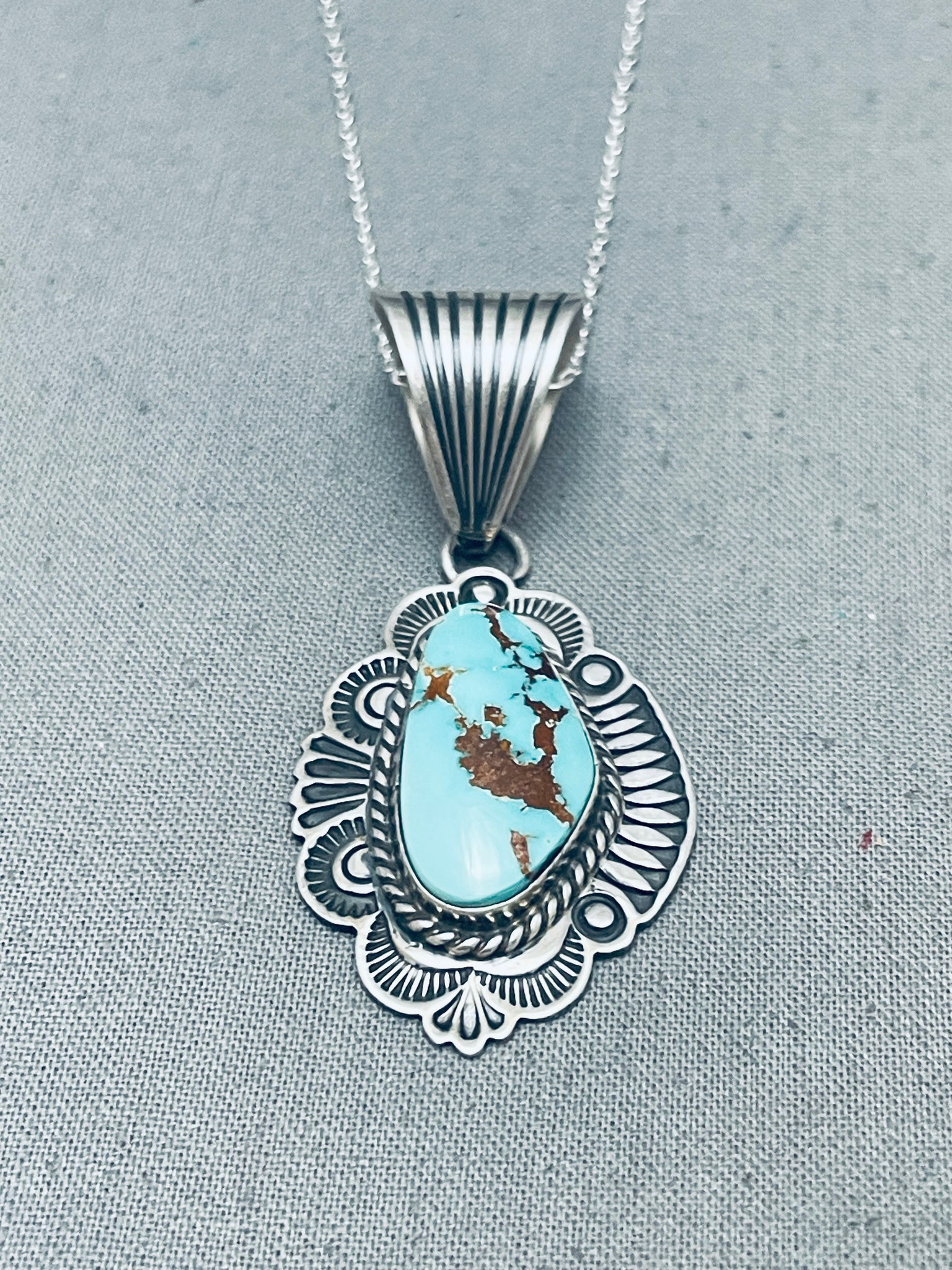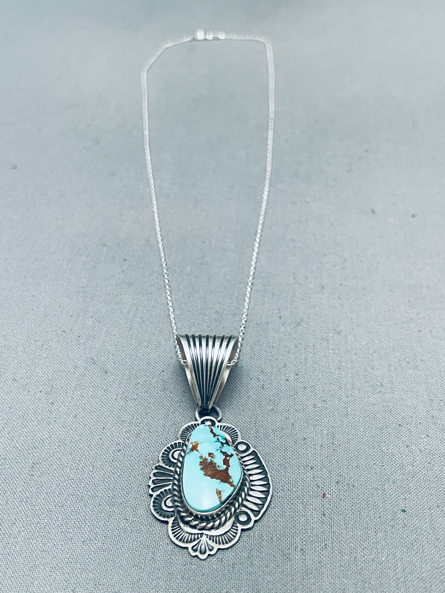 The Number 8 turquoise mine, located in Eureka County, Nevada, was discovered in 1925 and began operations in 1929. Renowned for producing high-quality turquoise, the mine is especially noted for its distinctive spiderweb matrix patterns, which range from golden brown to black, set against a backdrop of soft blue to blue-green stones. At its peak, the Number 8 mine yielded some of the largest turquoise nuggets ever found, including a remarkable 150-pound specimen. However, mining ceased in 1976, and the site is now primarily mined for gold. The turquoise extracted during its operational years remains highly prized among collectors and jewelers for its unique beauty and historical significance. Sterling silver, marked. Signed by Navajo artist, AL Jake. The length of the necklace measures around 21". Sturdy 10 grams.