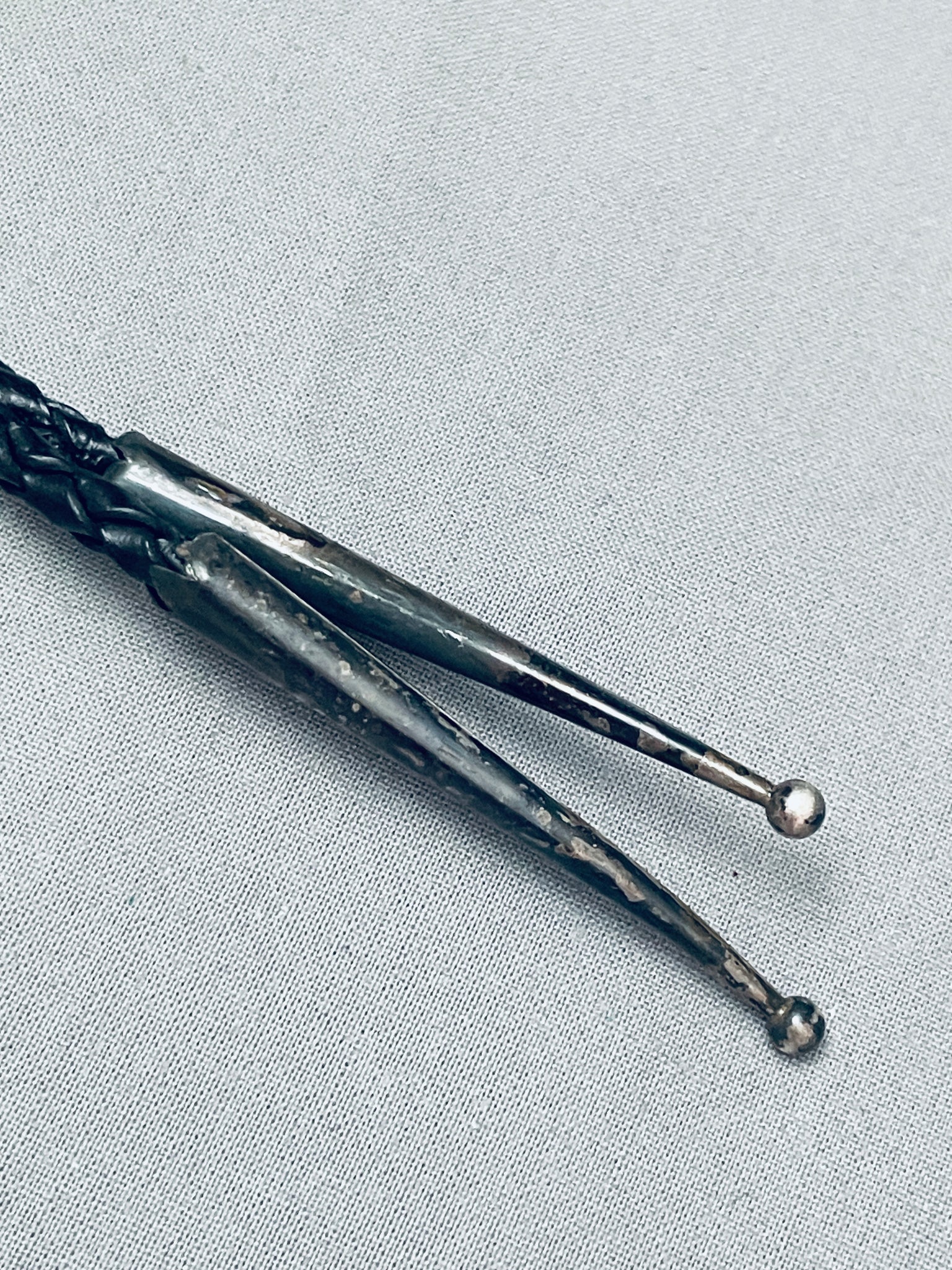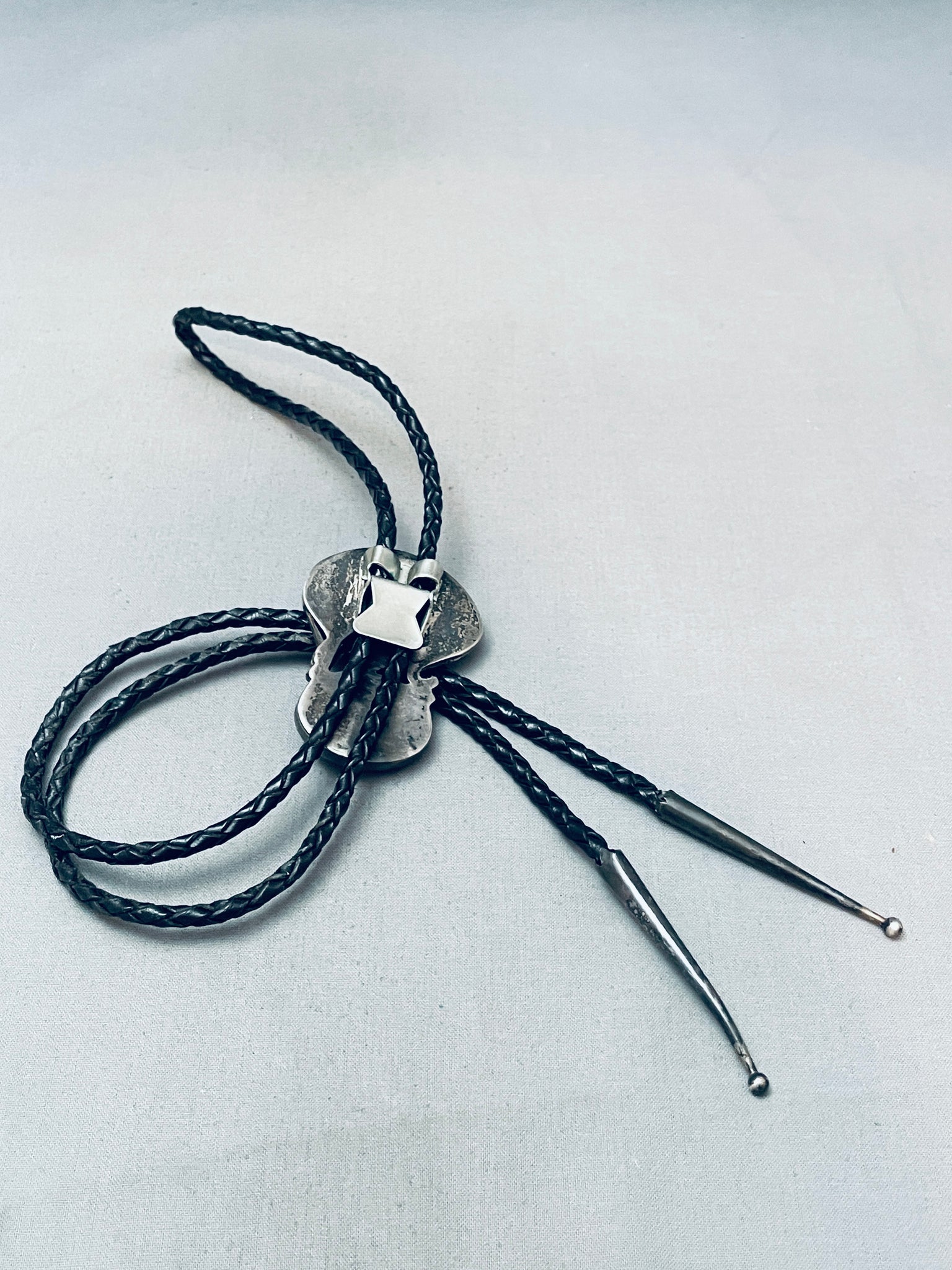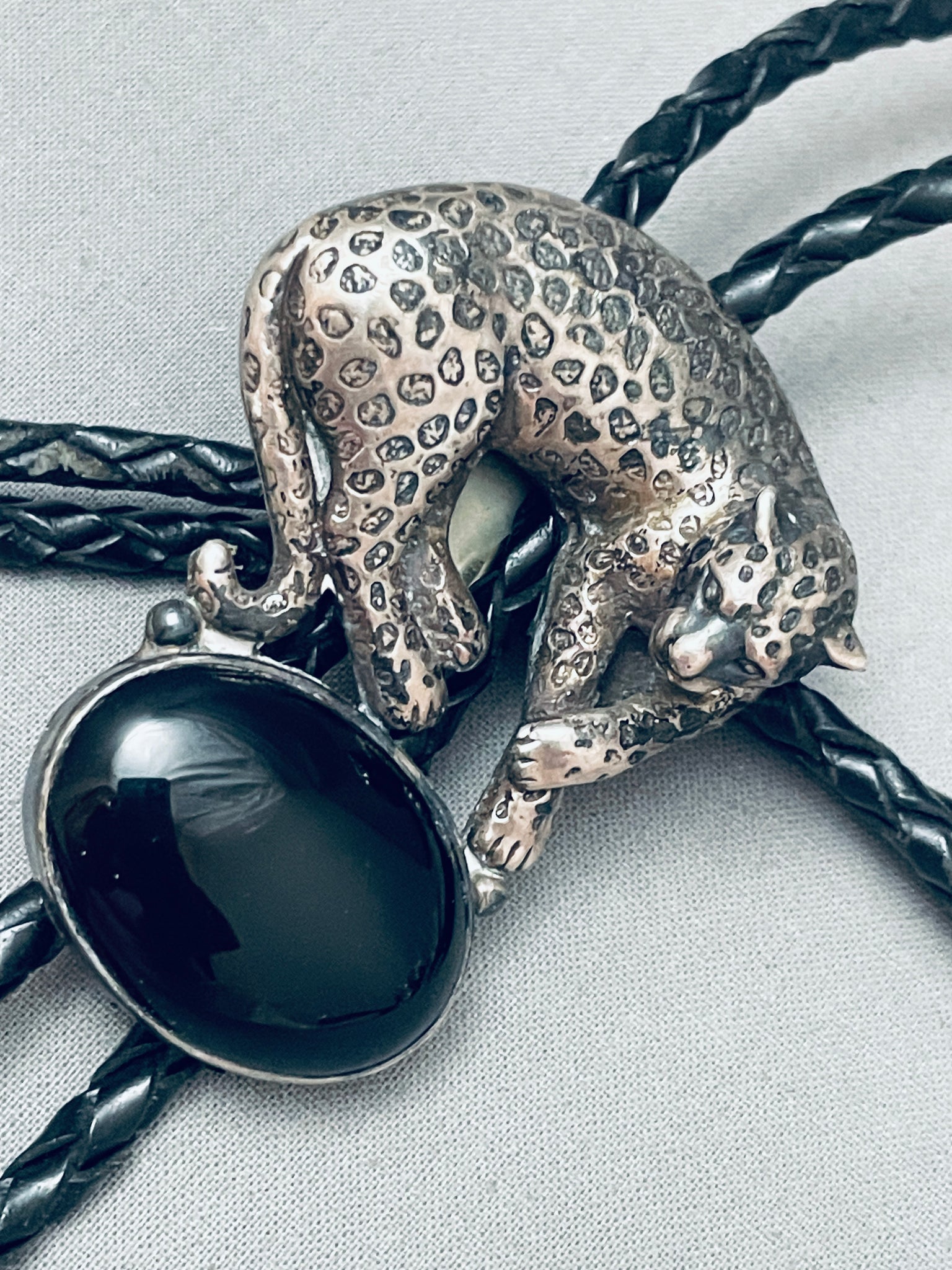 Detailed Vintage Native American Navajo Leopard Sterling Silver Jet Bolo Tie Old