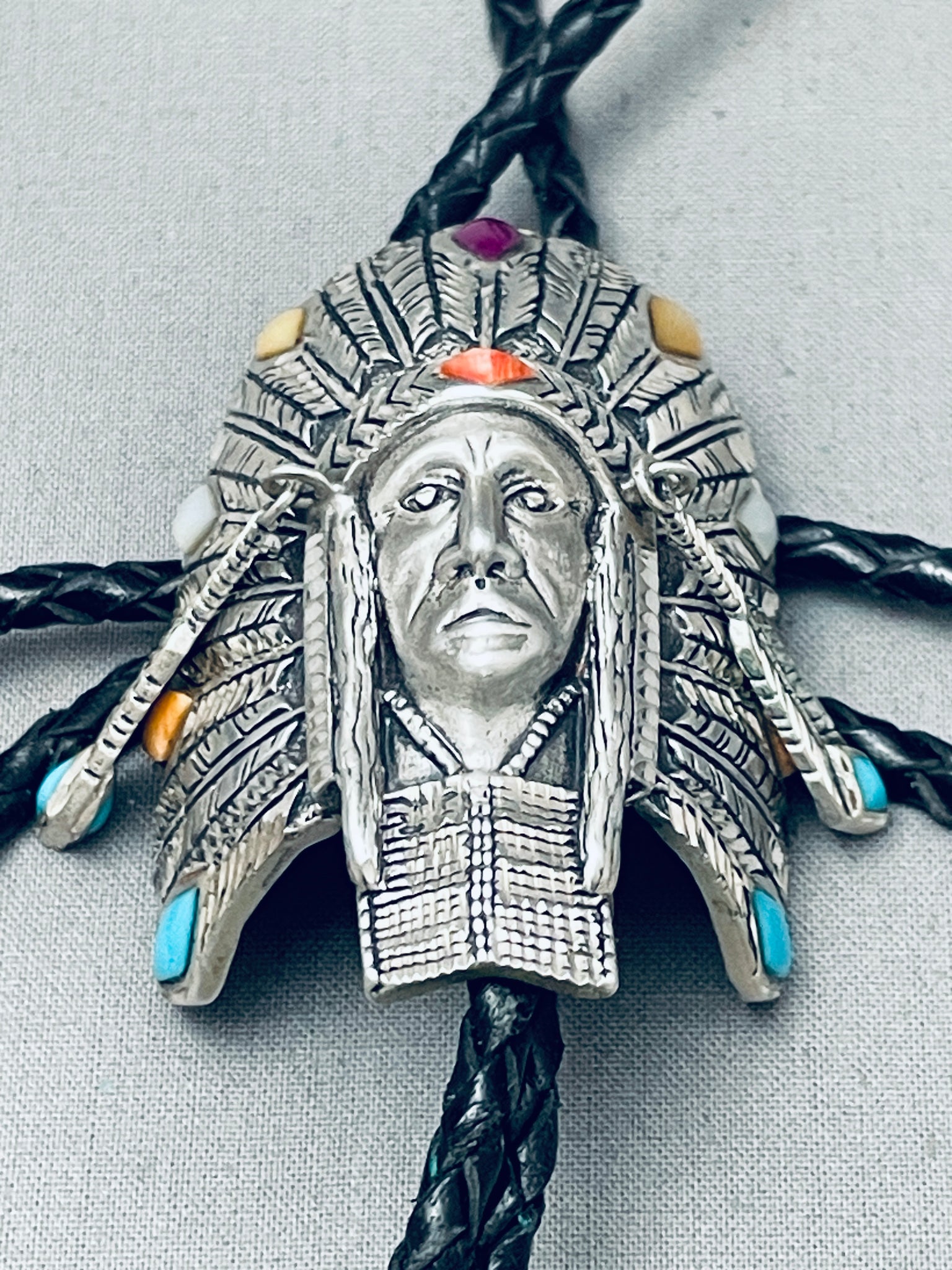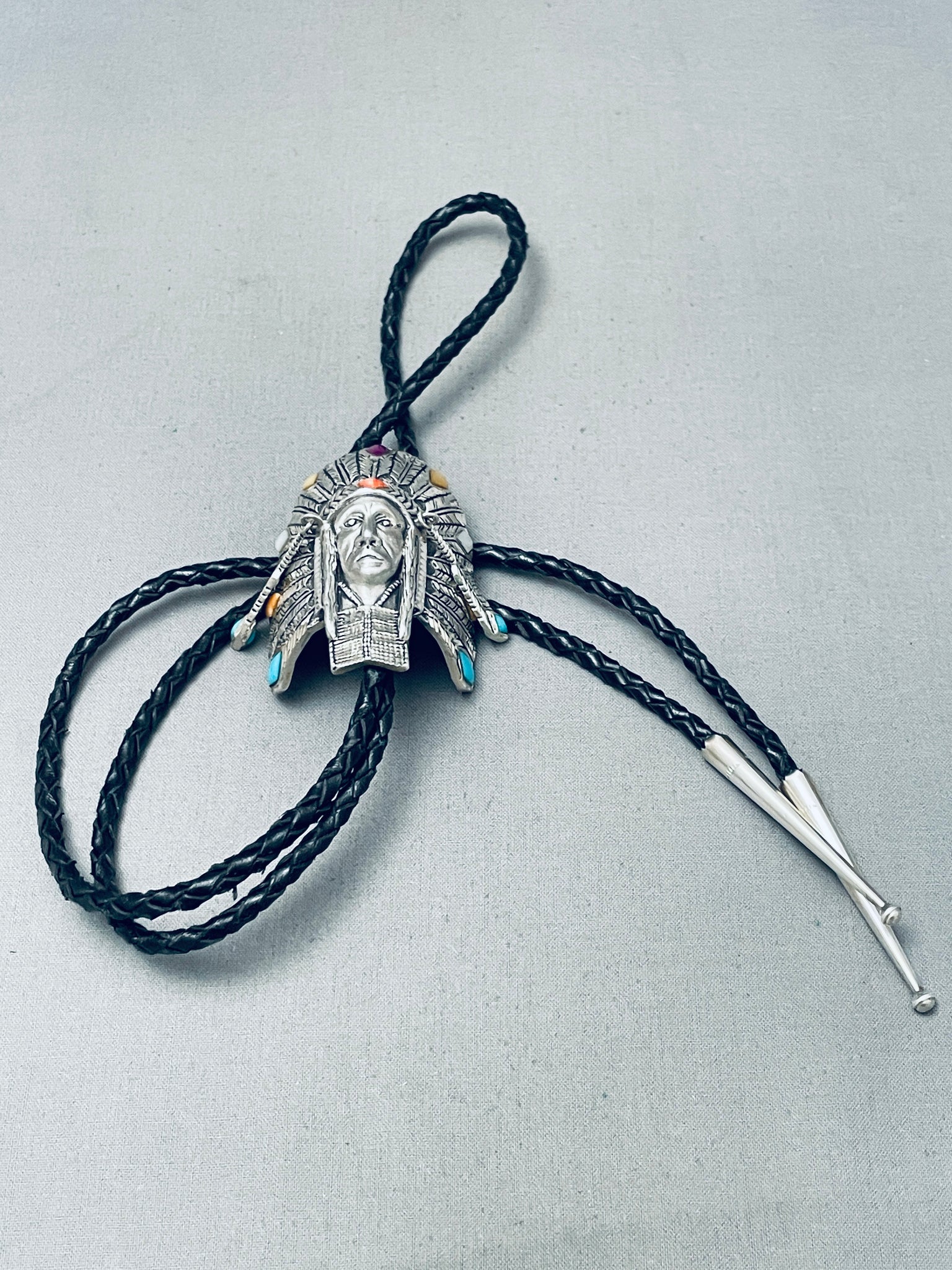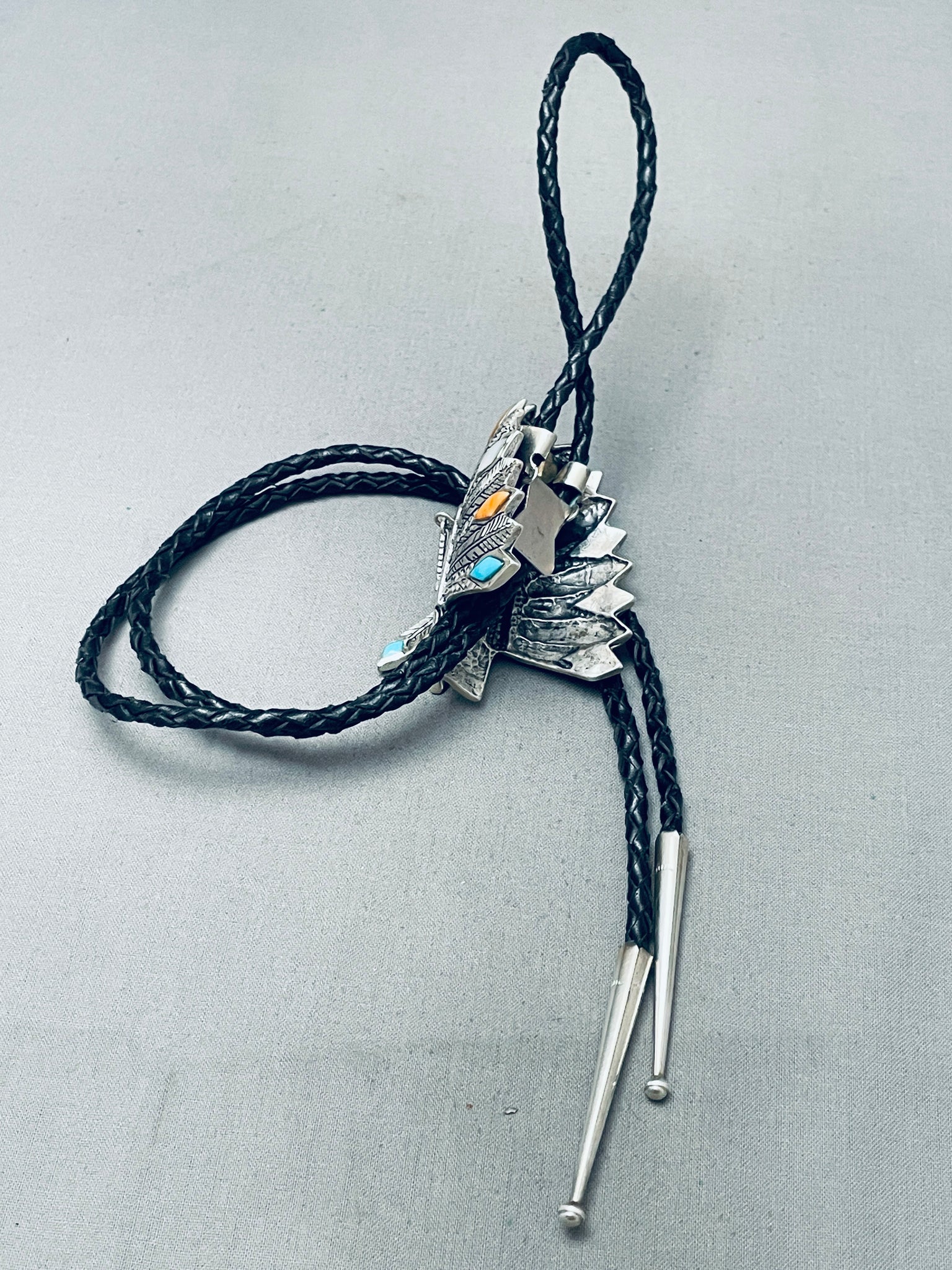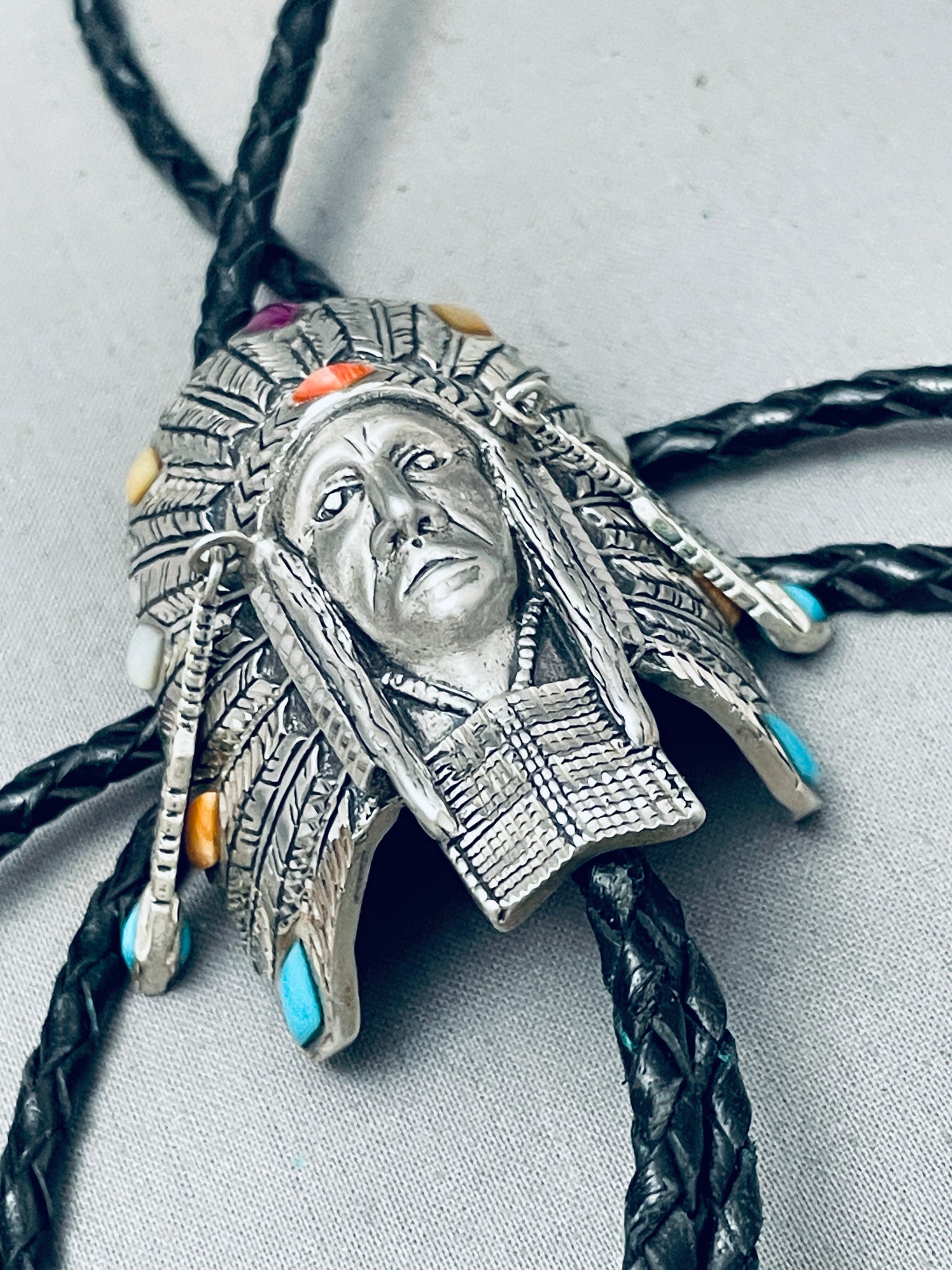 Detailed Vintage Southwest Sterling Silver Inlay Bolo Tie