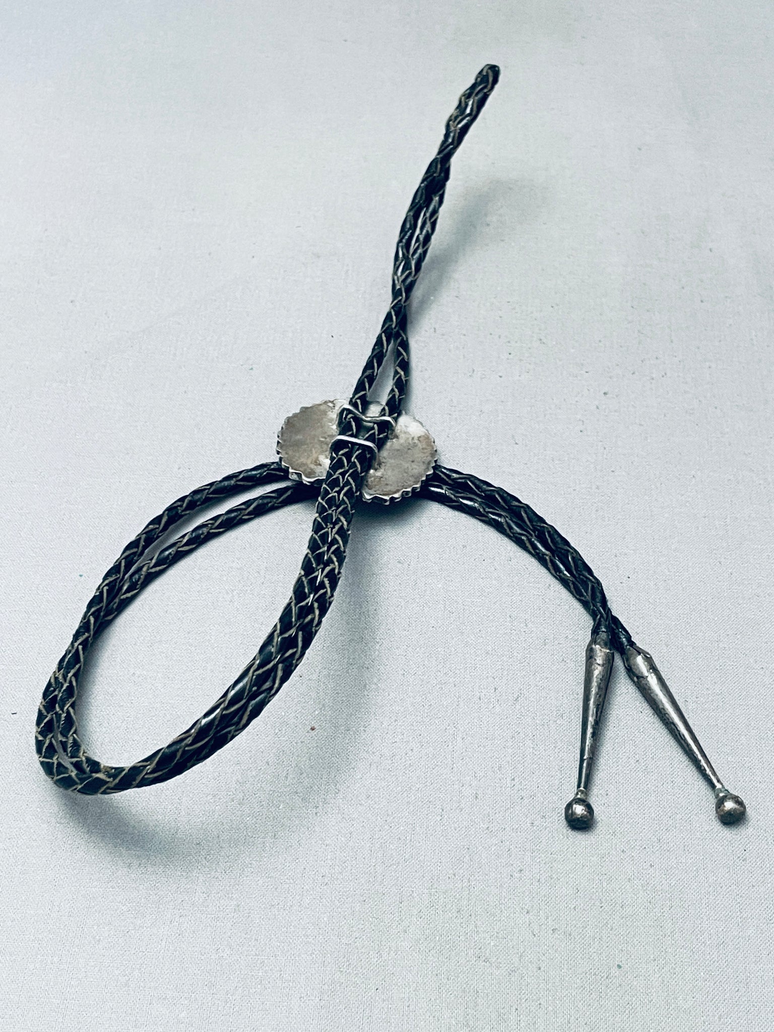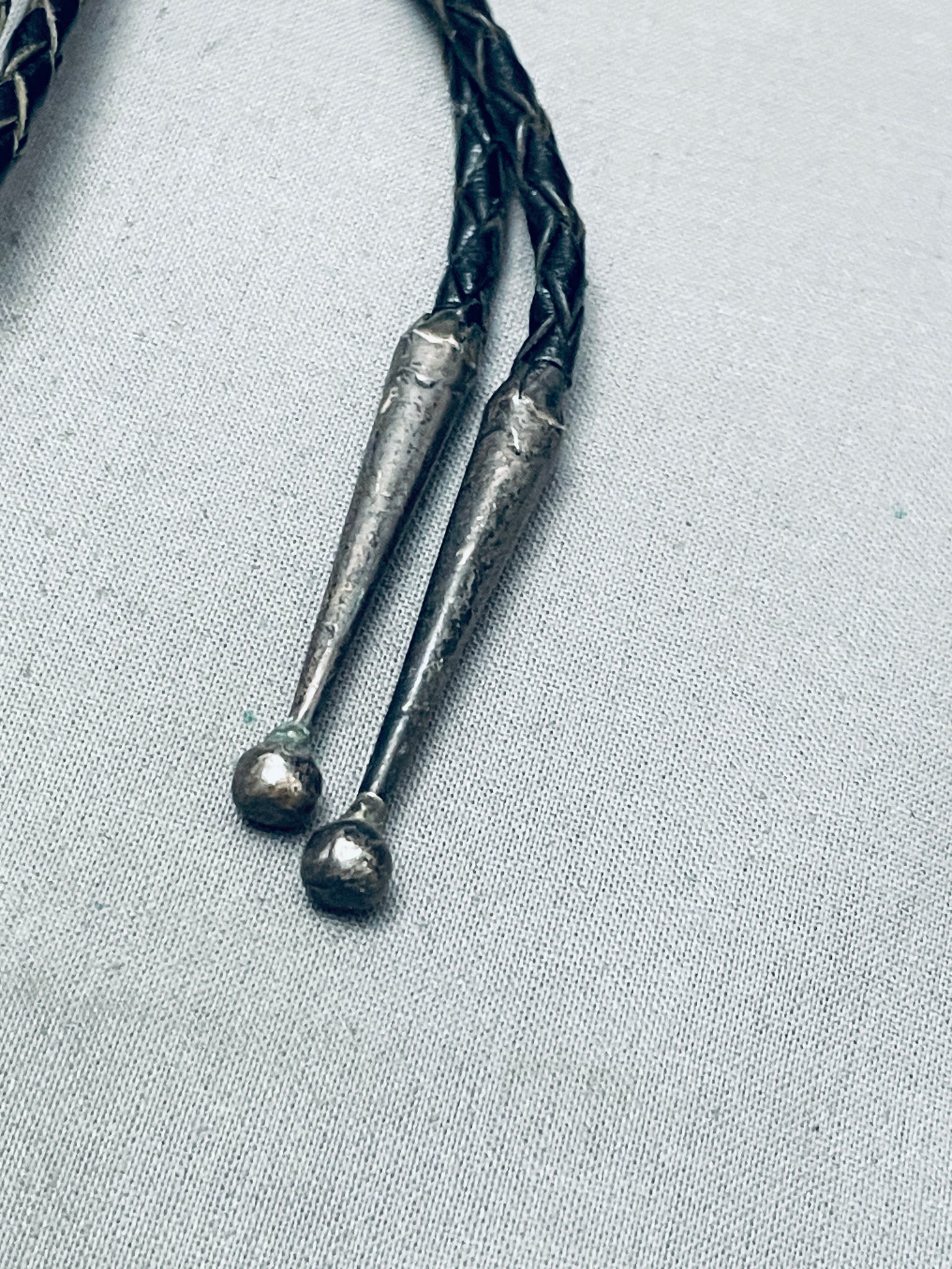 This is an incredible vintage Zuni inlaid silver bolo tie. This remarkable bolo contains a wonderful inlaid section that consists of a Native woman. The inlay consists of Royston turquoise, onyx, white stone, and coral. Surrounding the bolo on the edges are silver raindrops. The bolo measures around 1-1/2" in diameter. Resting at the bottom of the 40" black leather tie are long silver cones with silver beads. Sterling silver. Cir. Mid century+. Sturdy 28 grams.