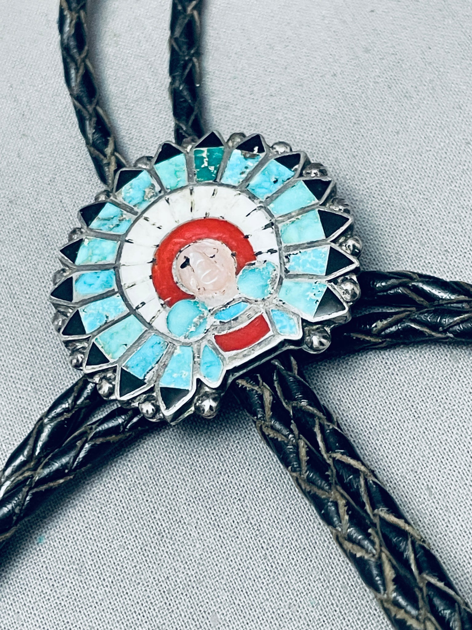 Early 1900's Vintage Native American Zuni Turquoise Inlay Chief Sterling Silver Bolo Tie