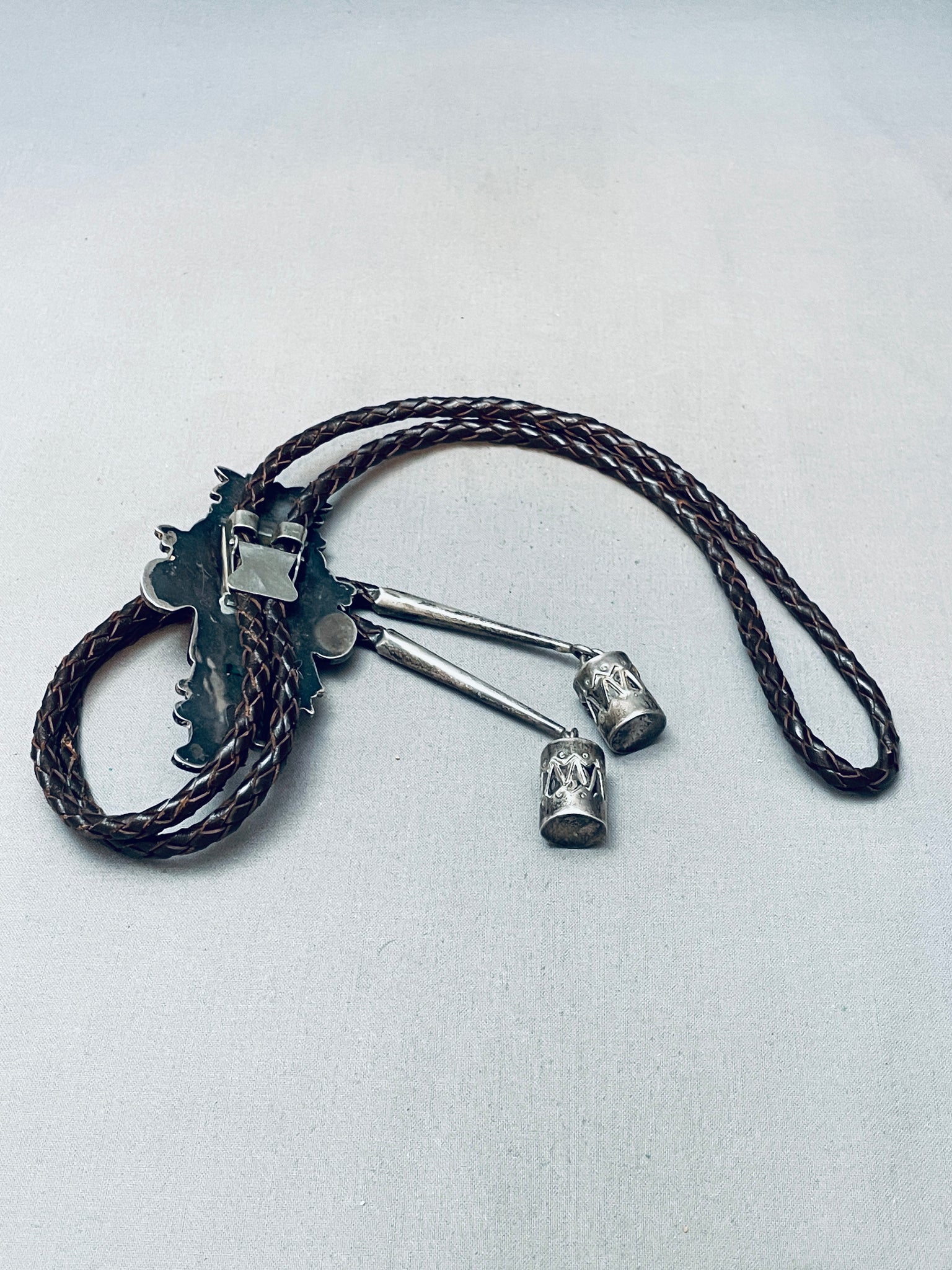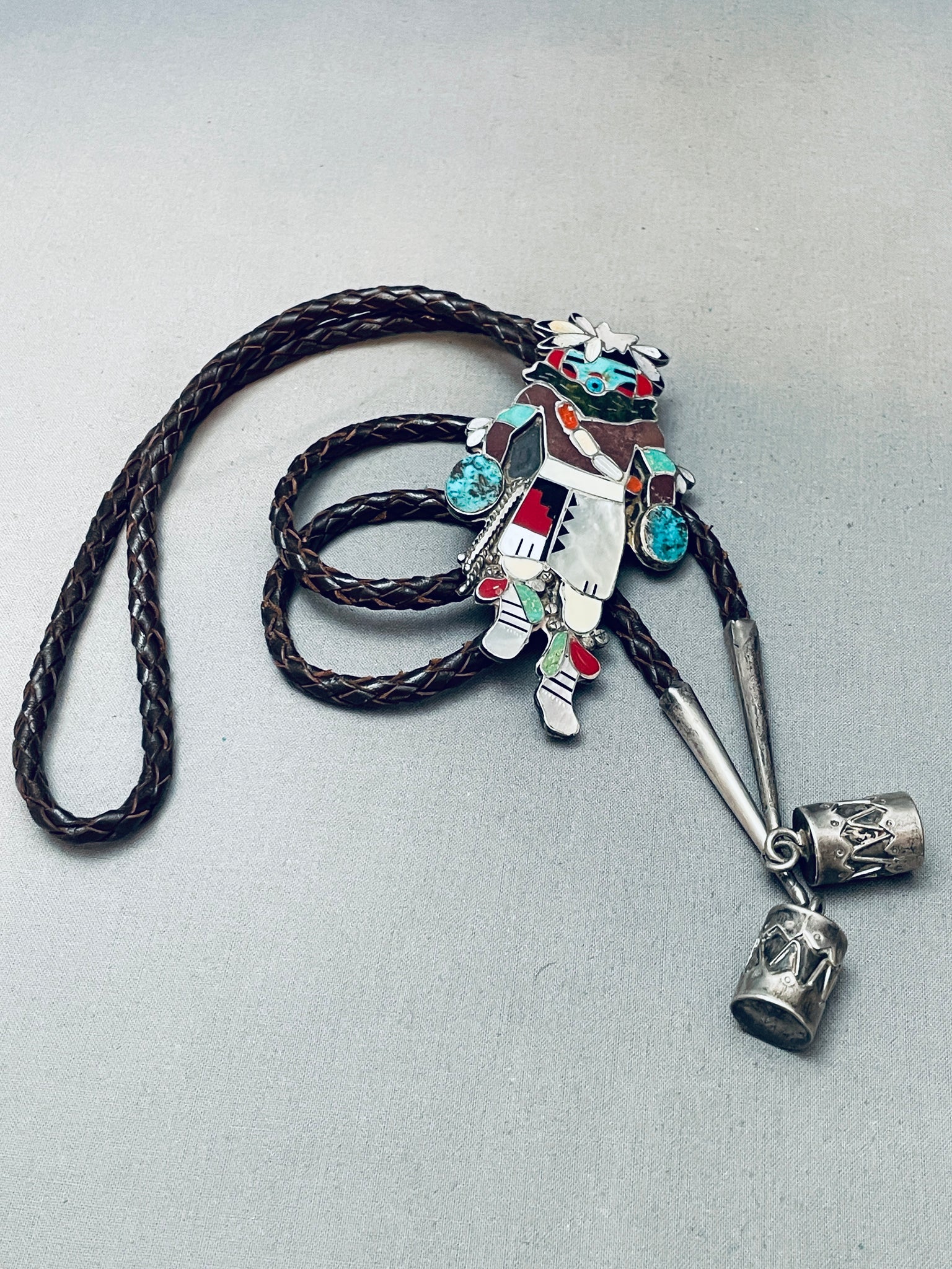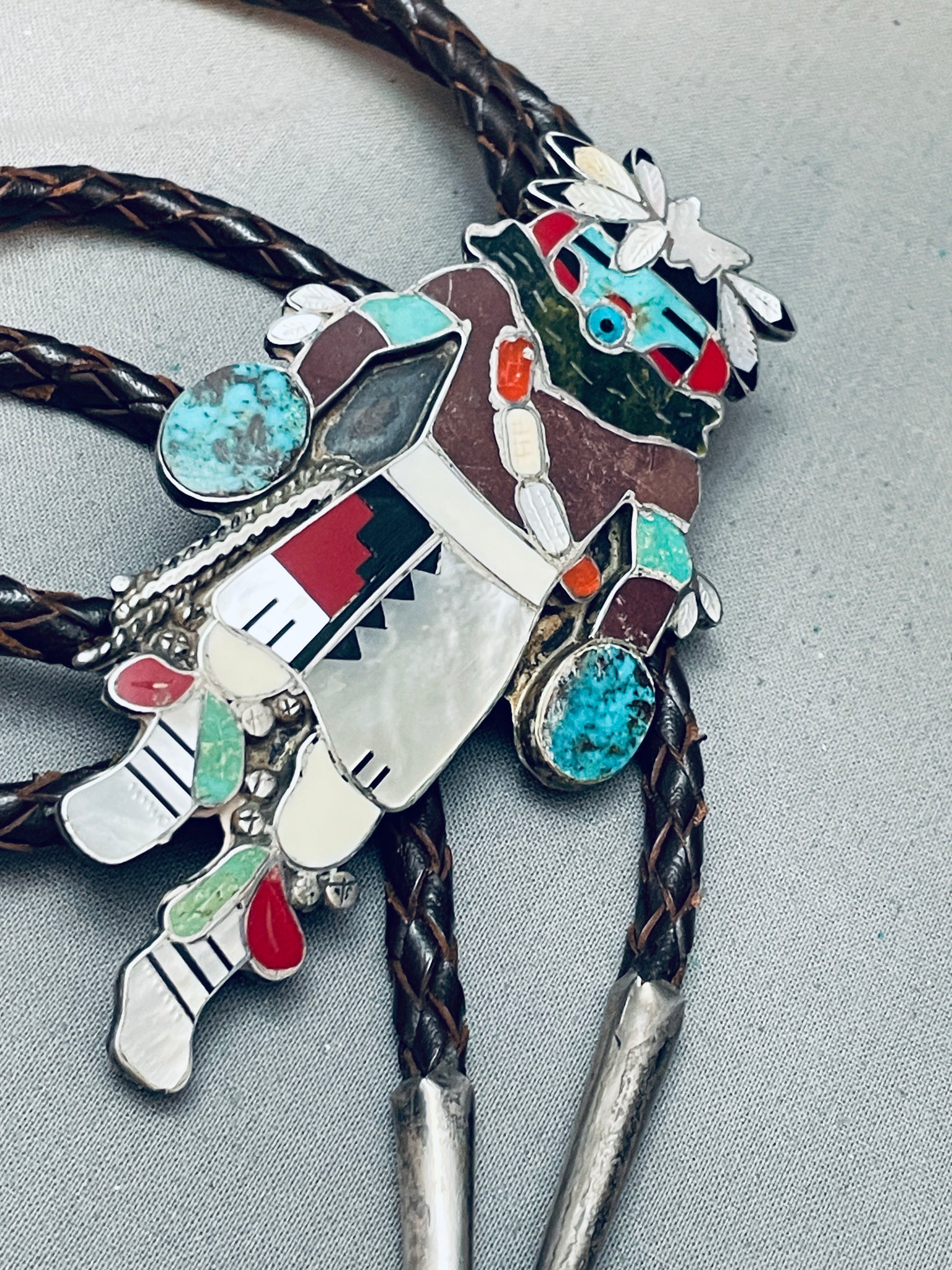 Huge One Of Best Vintage Native American Zuni Inlay Turquoise Sterling Silver Dance Bolo Tie
