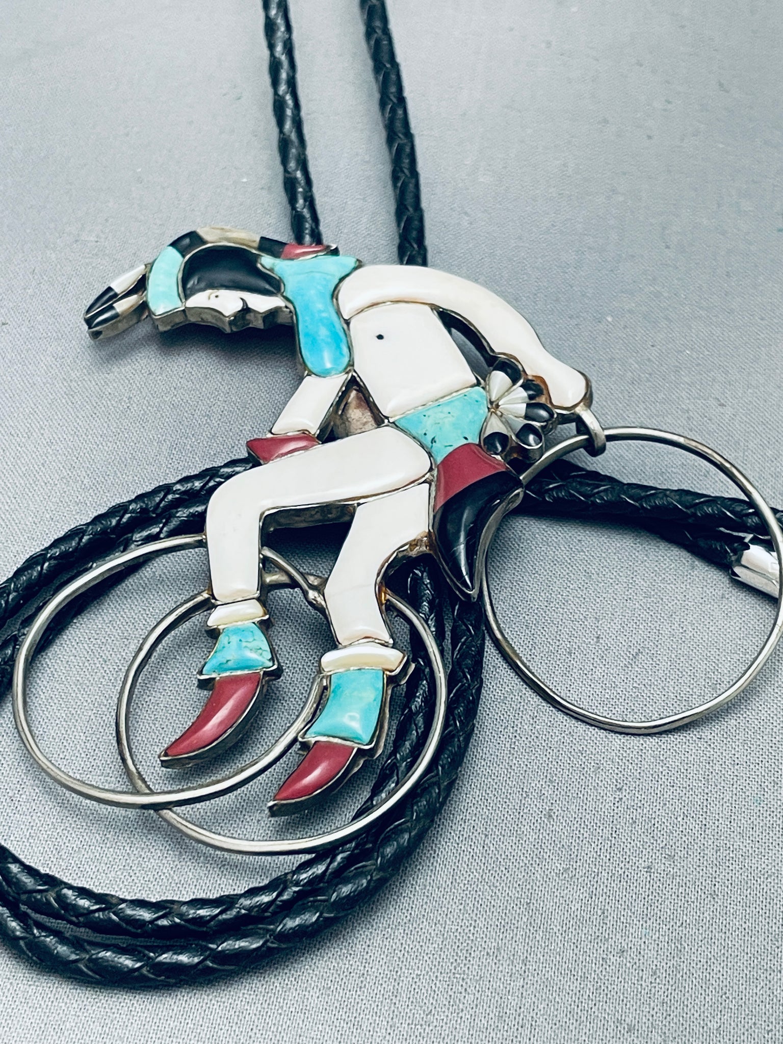 This is a striking vintage Zuni inlaid dancer silver bolo tie. The bolo is absolutely amazing as the intricacy is just remarkable consisting of white stone, turquoise, pipestone, onyx, and mother of pearl. The dancer measures around 3-1/2" X 2". Resting at the ends of the 35" are long silver cones with end silver hogan beads. Sterling silver. Cir. 1970's+. Sturdy 46 grams.