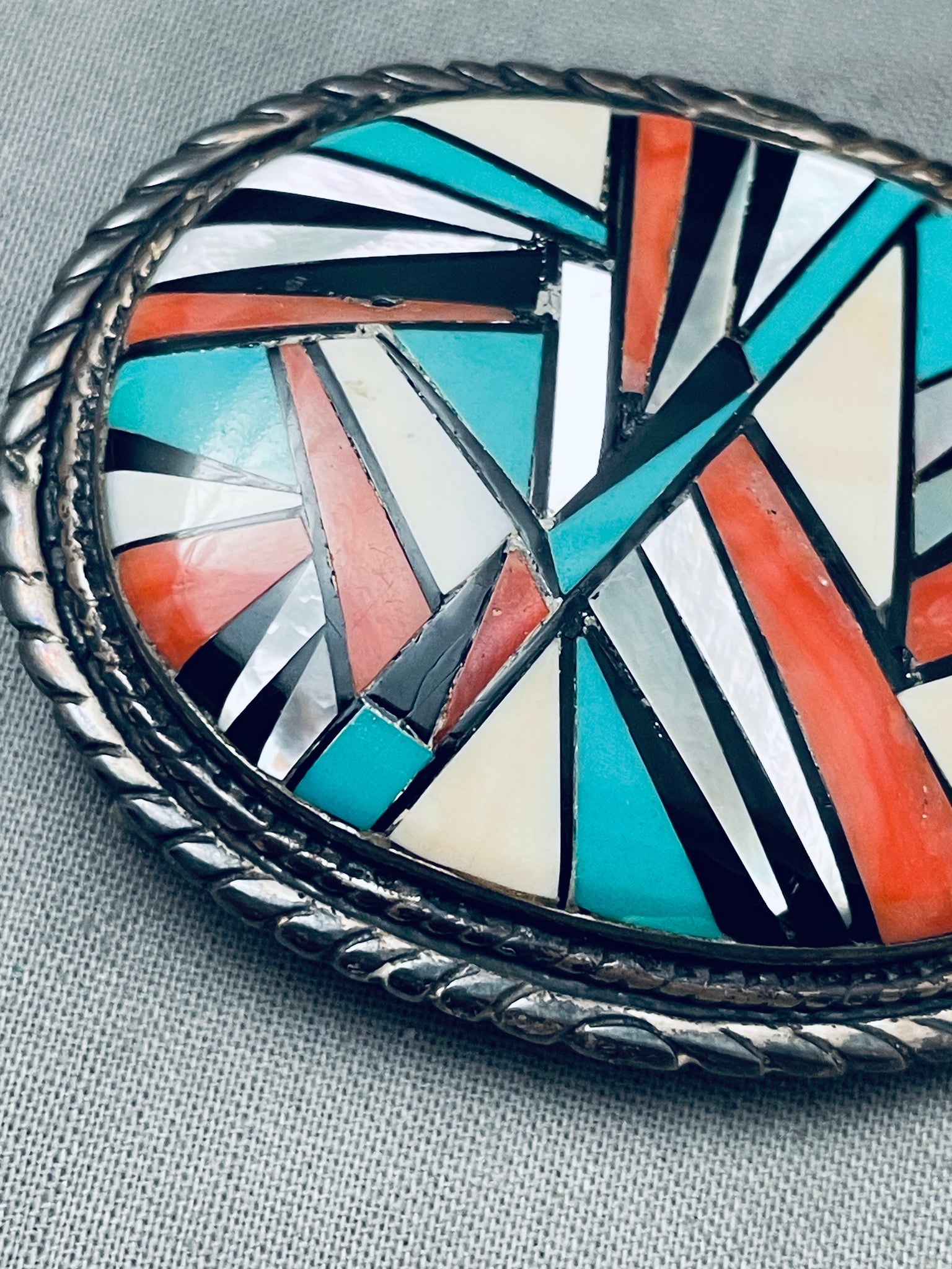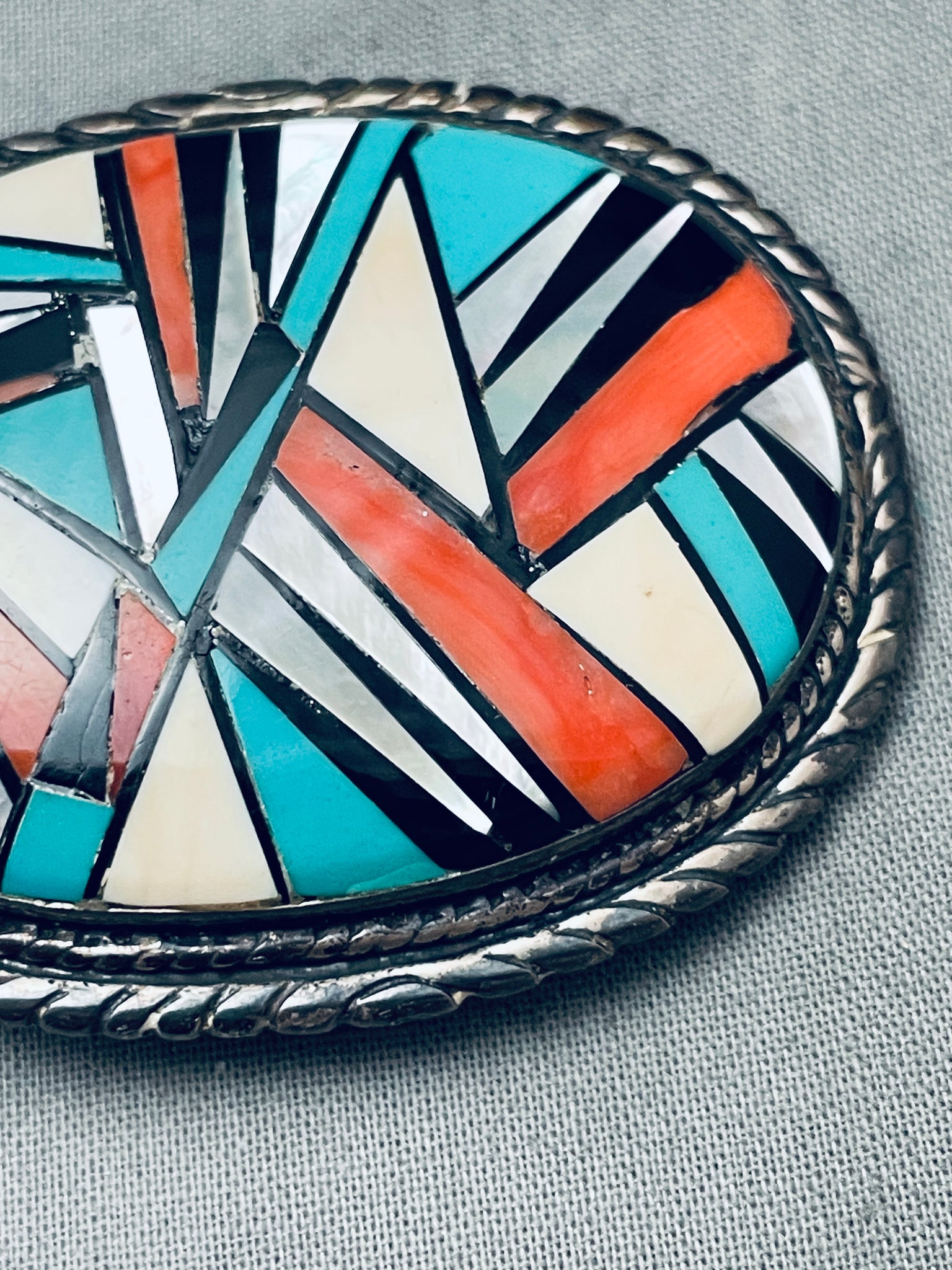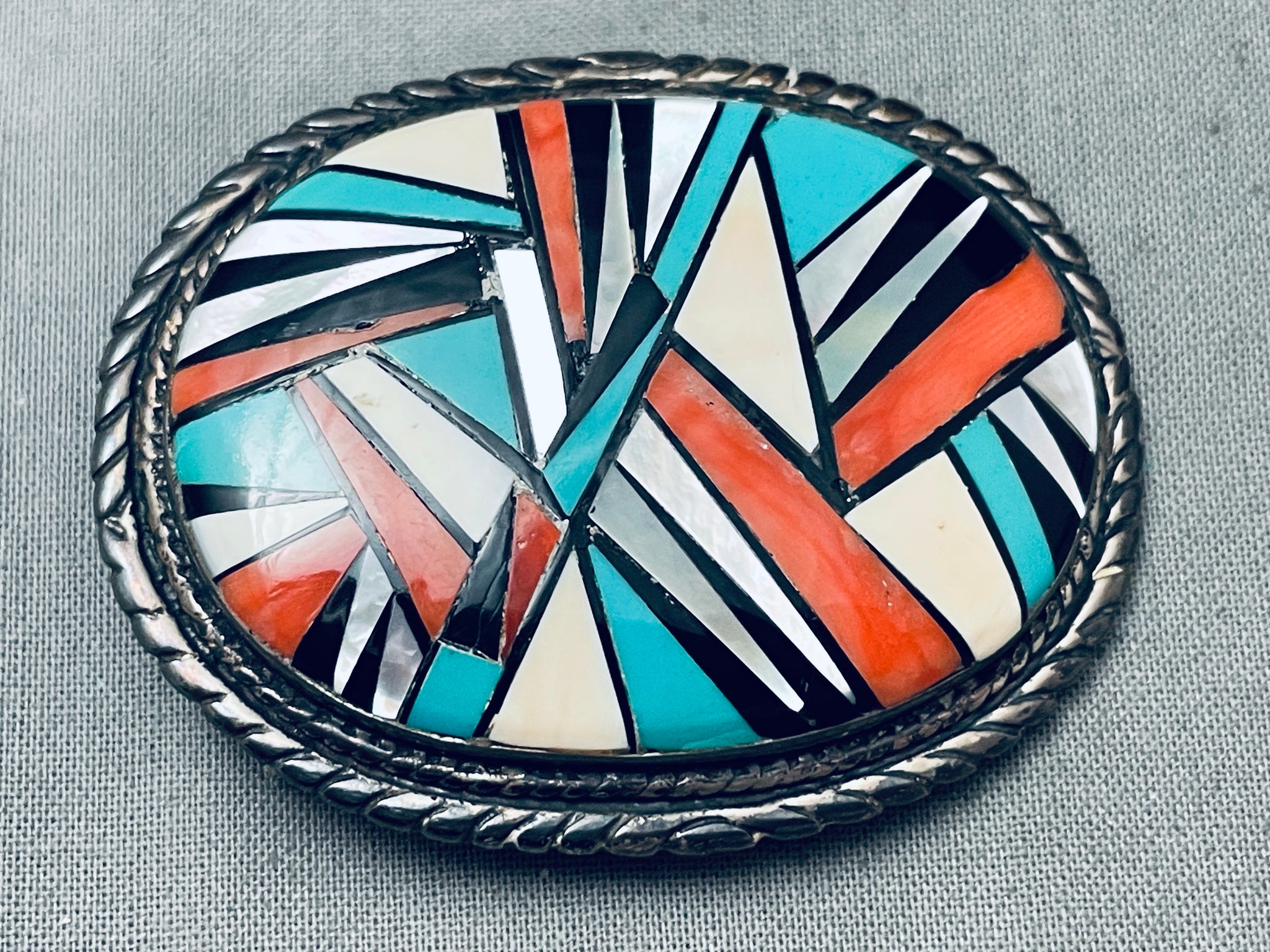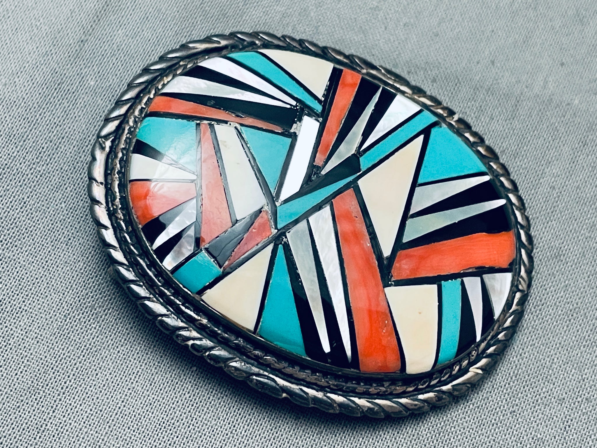 This is an amazing vintage Navajo inlaid thick silver buckle. This remarkable buckle contains a unique mosaic inlaid section that consists of onyx, mother of pearl, turquoise and coral. Bordering the thick silver buckle are amazing silver ropes and coiled patterns. This buckle measures around 2-1/4" X 1-3/4" and can fit a belt width of about 1" or less. The entire inlaid section measures a stunning 1-7/8" X 1-3/8" Sterling silver. Cir. Mid century+. Sturdy 40 grams.