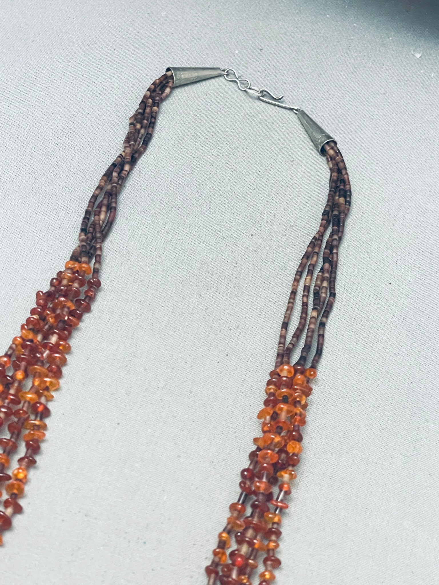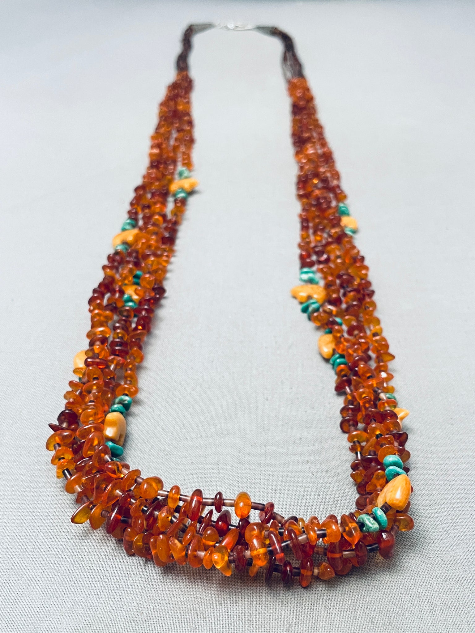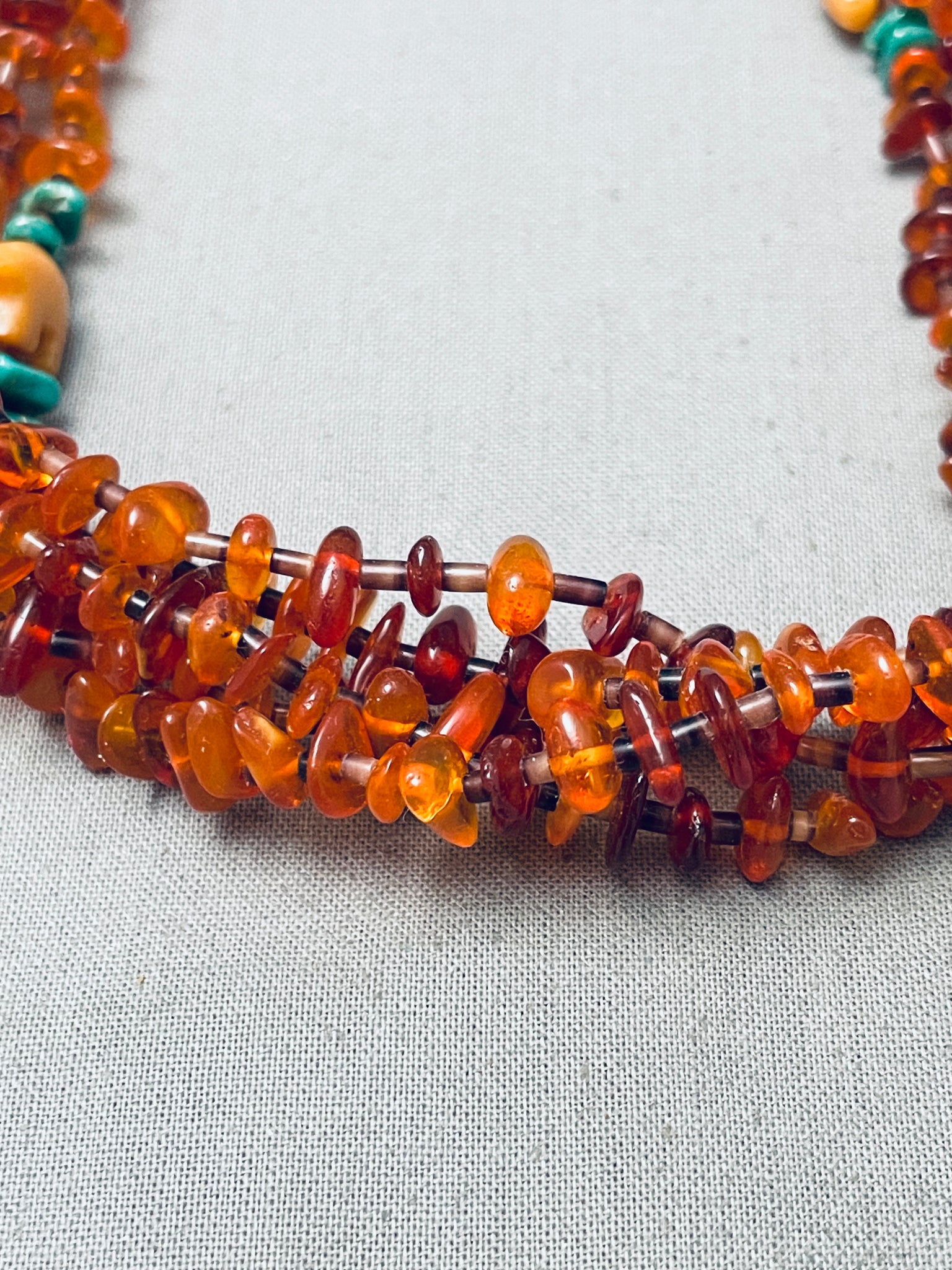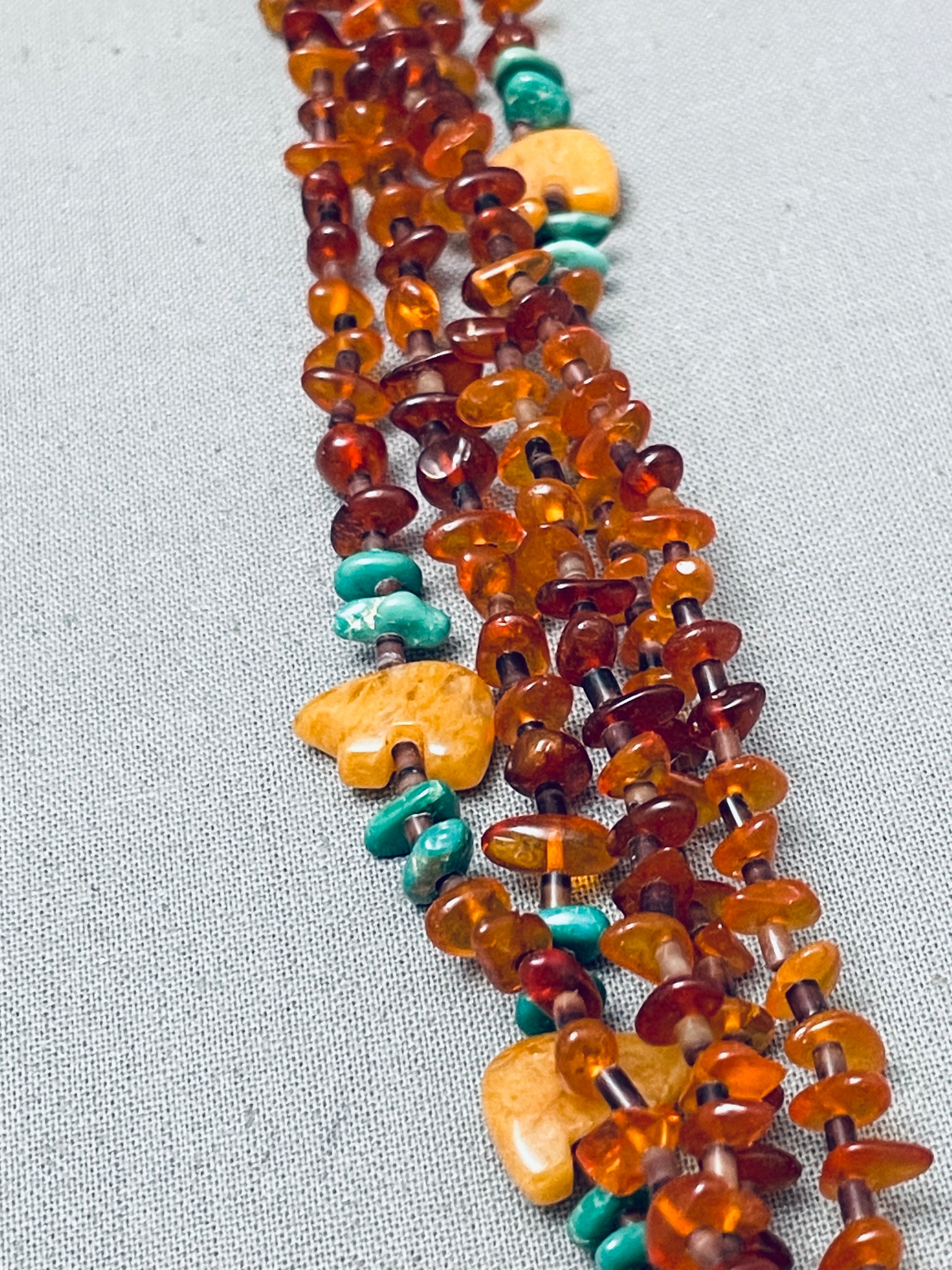 This is a marvelous vintage Navajo multiple strand necklace. This wonderful necklace contains 5 outstanding strands that consist mostly of amber stones. Situated throughout the very long strands are impressive Royston turquoise stones along with bear fetishes and hand cut brown shell heishi. Resting at the ends are silver cones with a traditional silver clasp. Sterling silver. Cir. Mid century+. The length of the necklace measures around 34". Sturdy 48 grams.