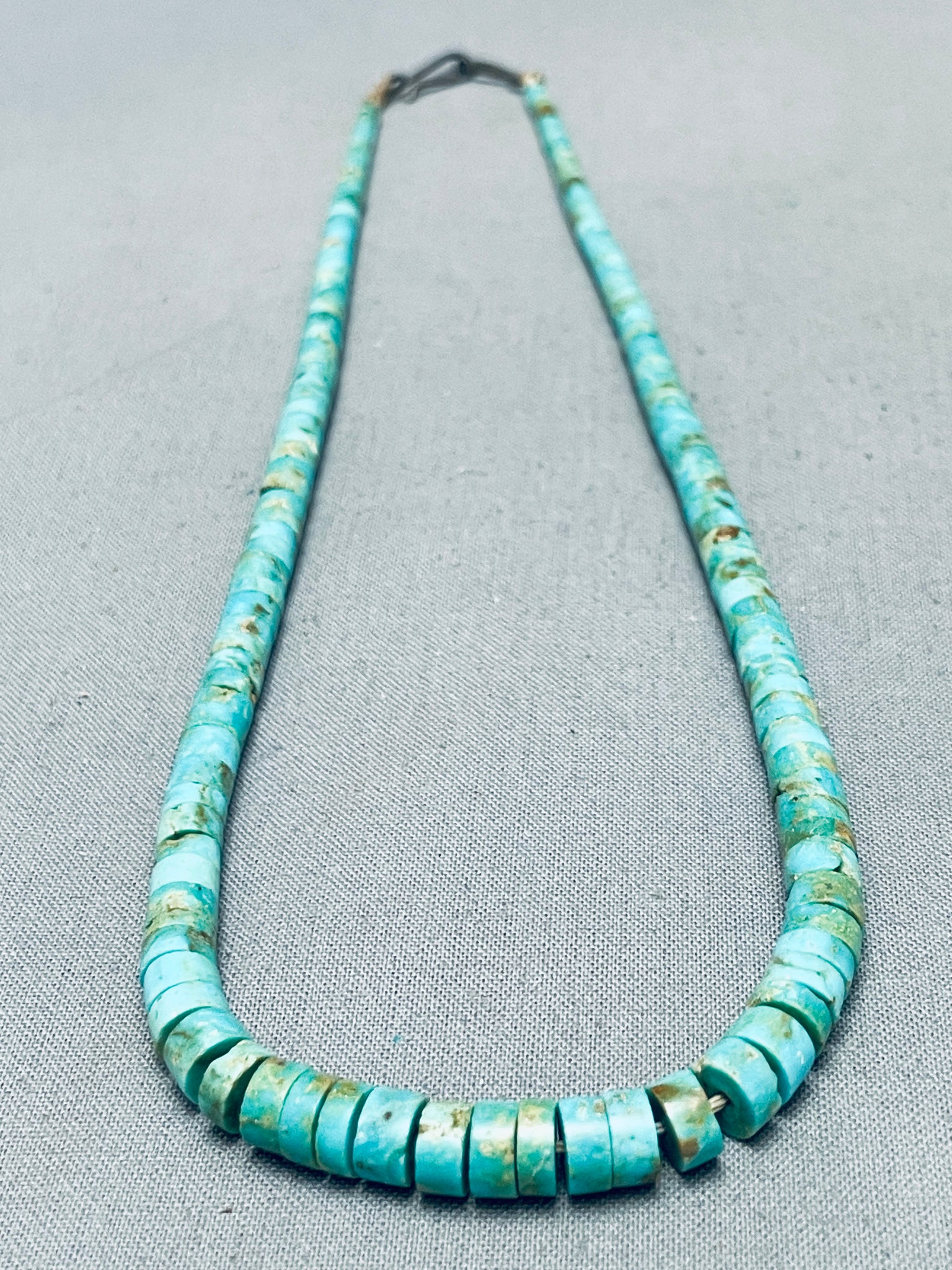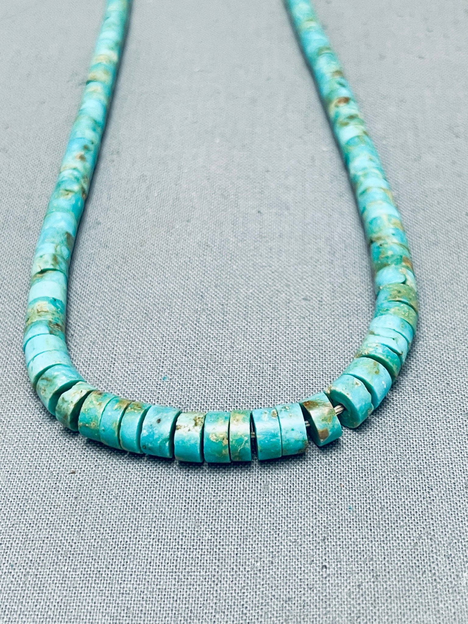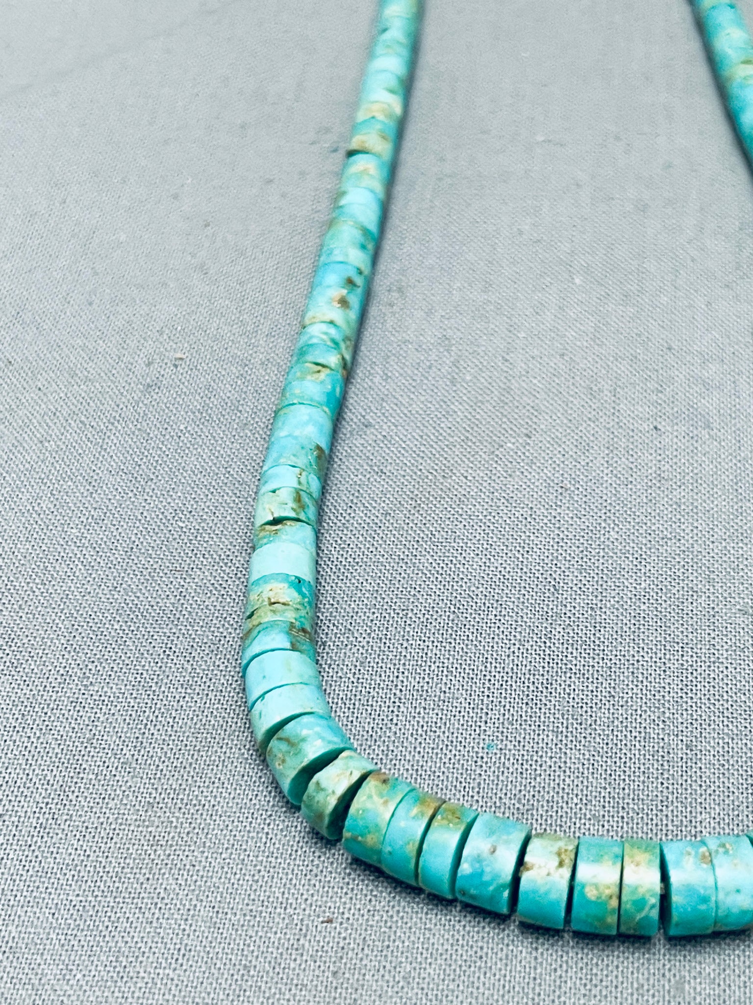 This is a striking vintage Navajo single strand turquoise necklace. This wonderful necklace contains a beautiful plethora of hand cut graduating Royston turquoise heishi stones. The largest turquoise stone measures around 1/4" in diameter. Located at the end is a stunning traditional silver clasp. Cir. Early 1900's. The length of the necklace measures around 16". Sturdy 16 grams.
