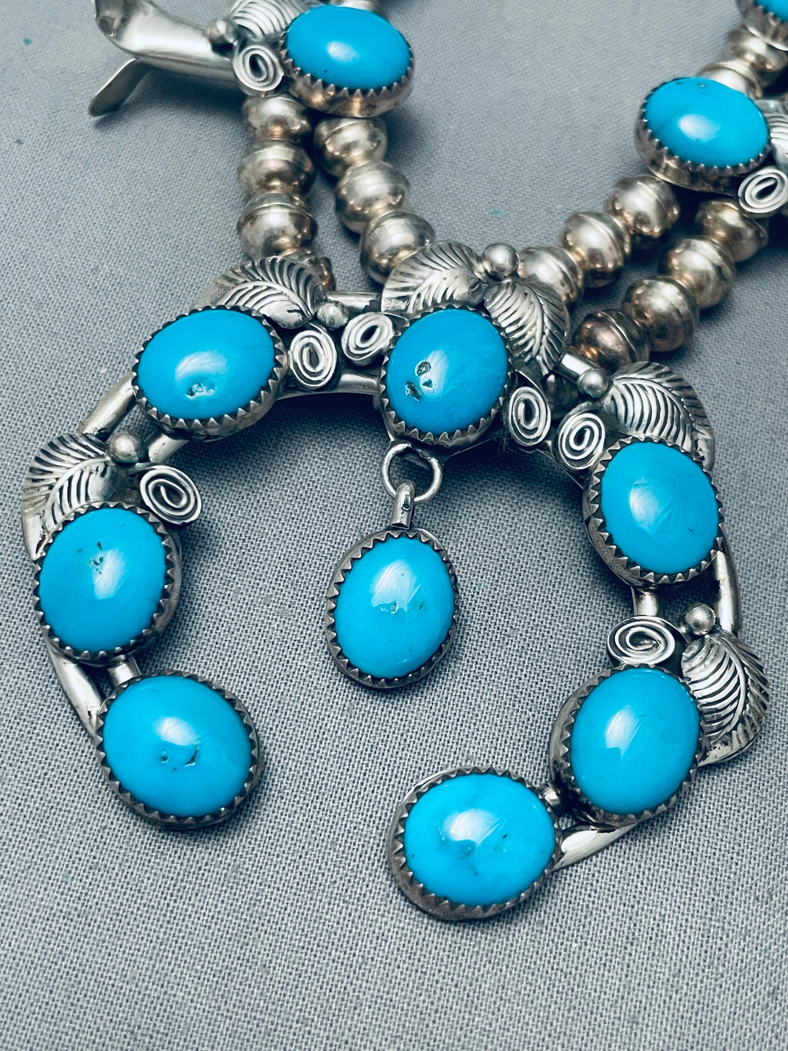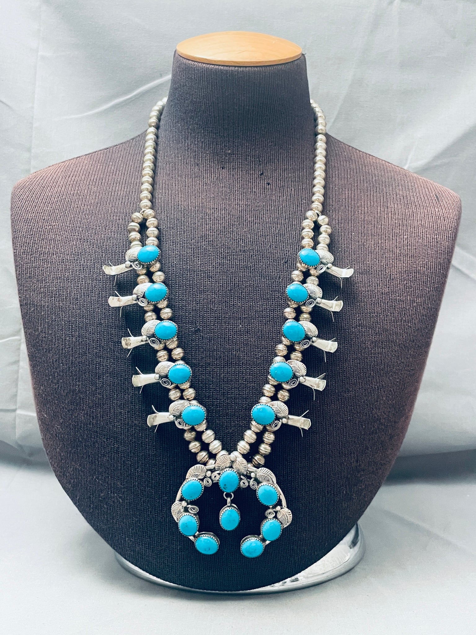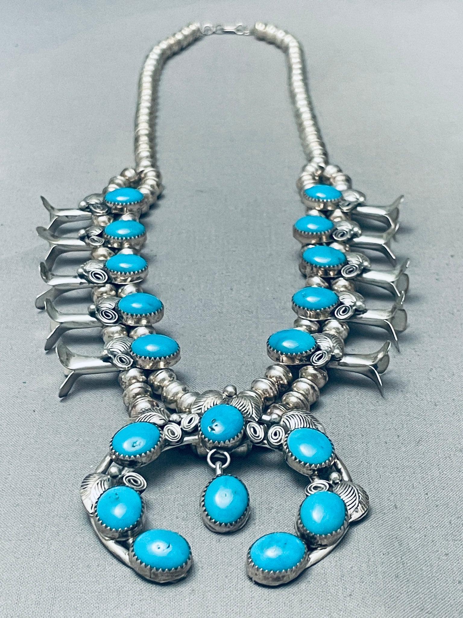 This is an impressive vintage Navajo large turquoise silver squash blossom necklace. This fascinating necklace contains 18 outstanding oval shaped Sleeping Beauty turquoise stones with each stone measuring around 1/2" X 3/8". Situated around each stone are marvelous silver works that consists of detailed leaves, raindrops, and swirling stems. The bottom double silver shank naja pendant measures around 2-1/4" X 2-1/2". This necklace contains a fascinating plethora of handmade round all silver beads with a traditional silver clasp. Sterling silver, marked. Cir. 1970's+. Signed by Navajo artist, Wayne Etsitty . The length of the necklace measures around 28". Sturdy 98 grams.