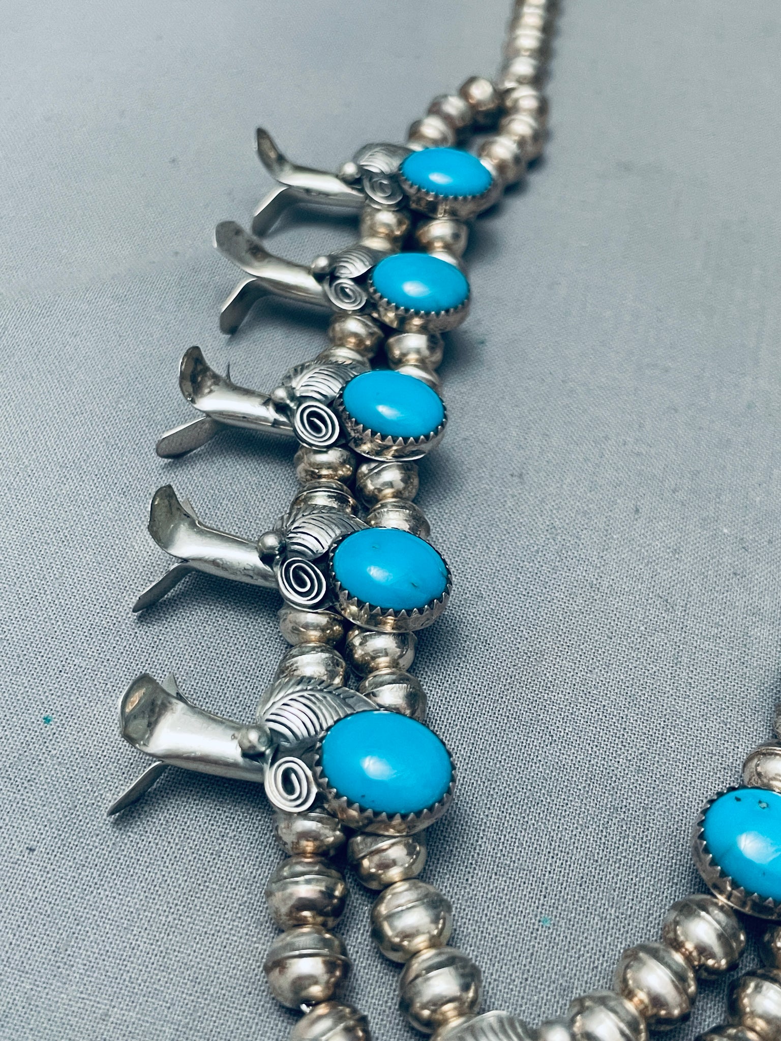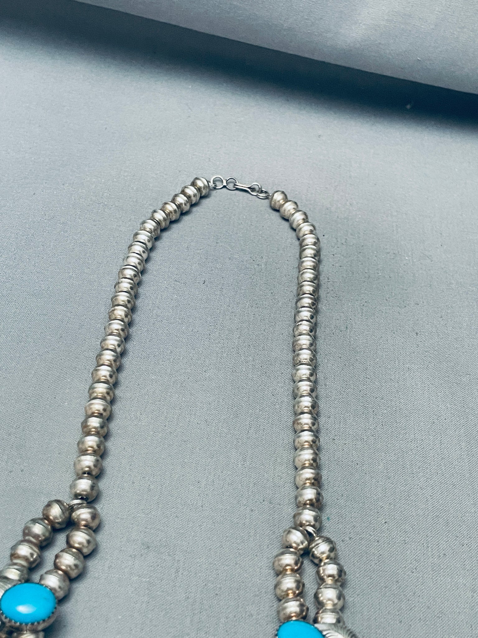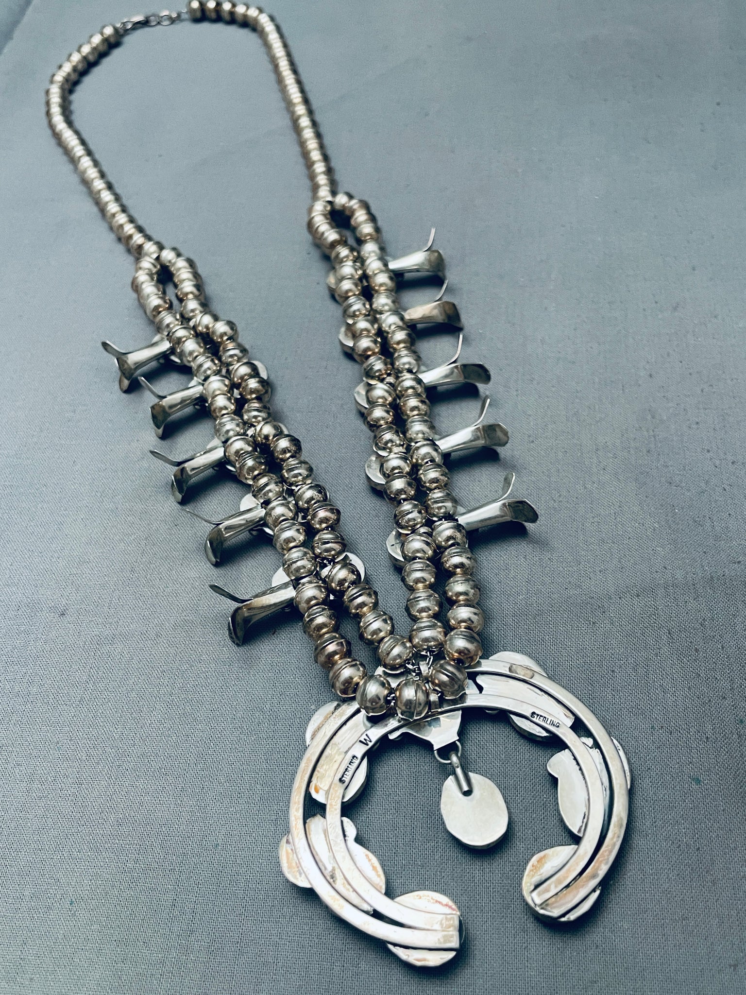 This is an impressive vintage Navajo large turquoise silver squash blossom necklace. This fascinating necklace contains 18 outstanding oval shaped Sleeping Beauty turquoise stones with each stone measuring around 1/2" X 3/8". Situated around each stone are marvelous silver works that consists of detailed leaves, raindrops, and swirling stems. The bottom double silver shank naja pendant measures around 2-1/4" X 2-1/2". This necklace contains a fascinating plethora of handmade round all silver beads with a traditional silver clasp. Sterling silver, marked. Cir. 1970's+. Signed by Navajo artist, Wayne Etsitty . The length of the necklace measures around 28". Sturdy 98 grams.