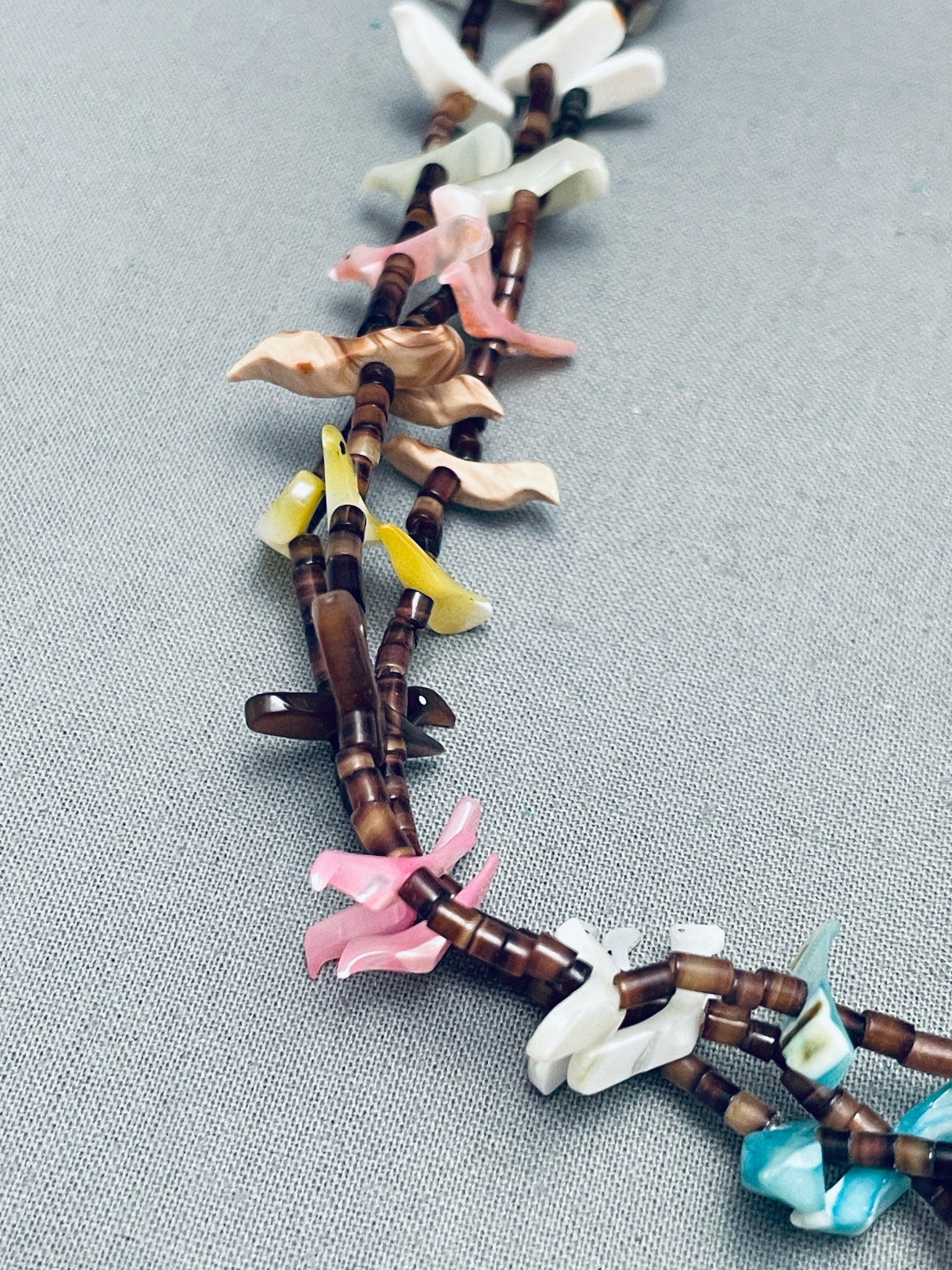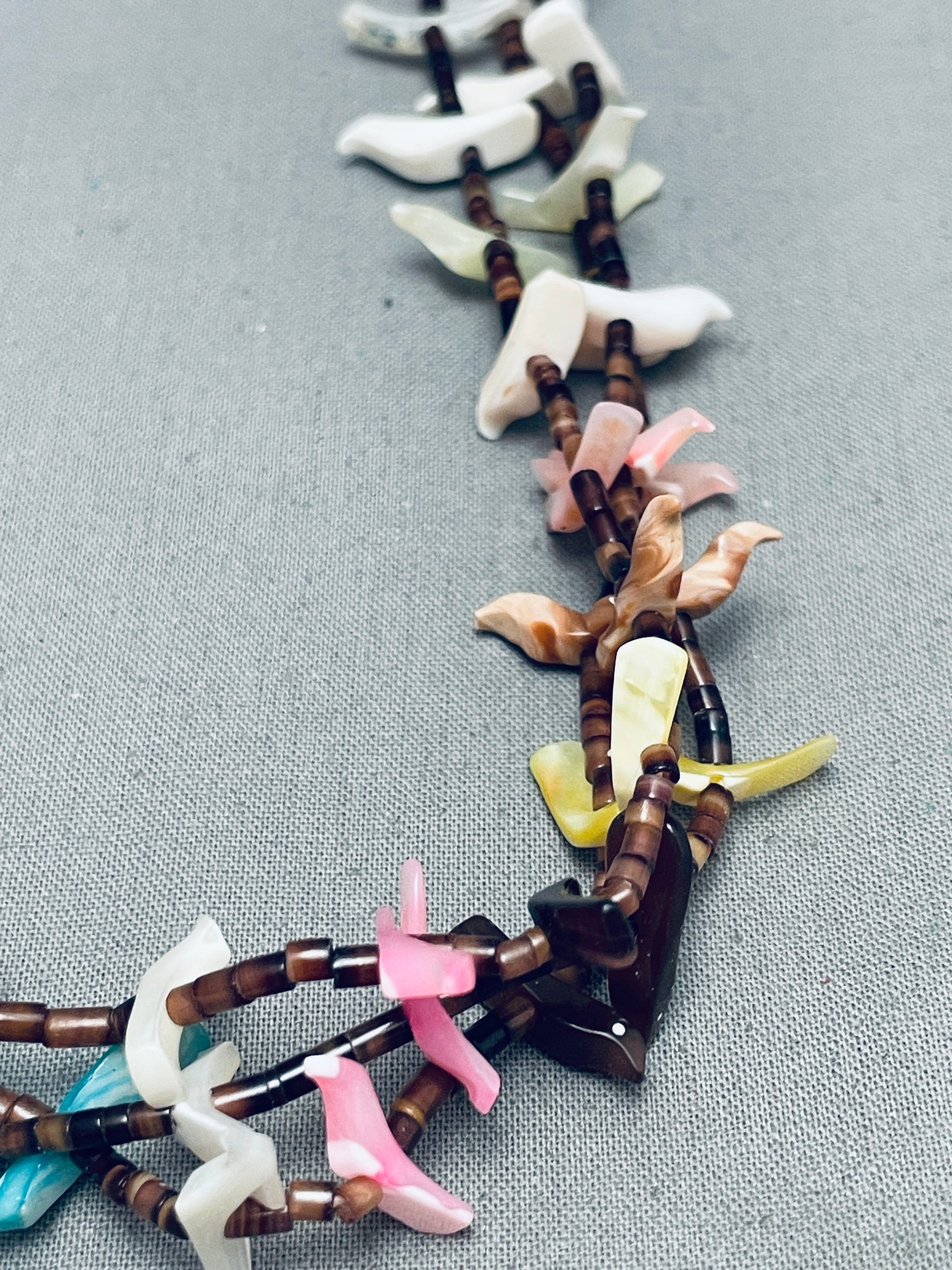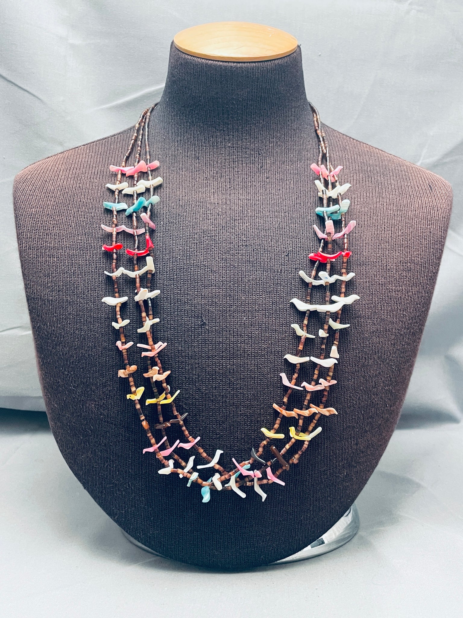 This is a breathtaking vintage Santo Domingo three strand rainbow bird fetish necklace. This outstanding necklace contains three beautiful strands that include a mind blowing plethora of hand carved brown shell heishi. Located throughout the strands is a wonderful amount of hand carved shell bird fetishes. The shells are a beautiful pink, white, teal, purple, red, brown and black colors. Sterling silver. Cir. 1970's+. The length of the necklace measures around 26". Sturdy 37 grams.