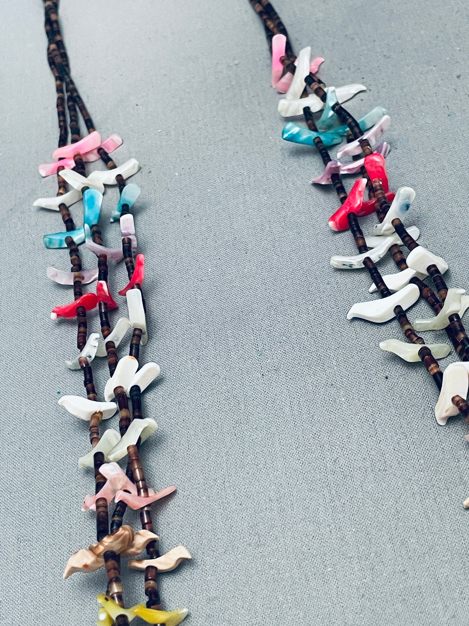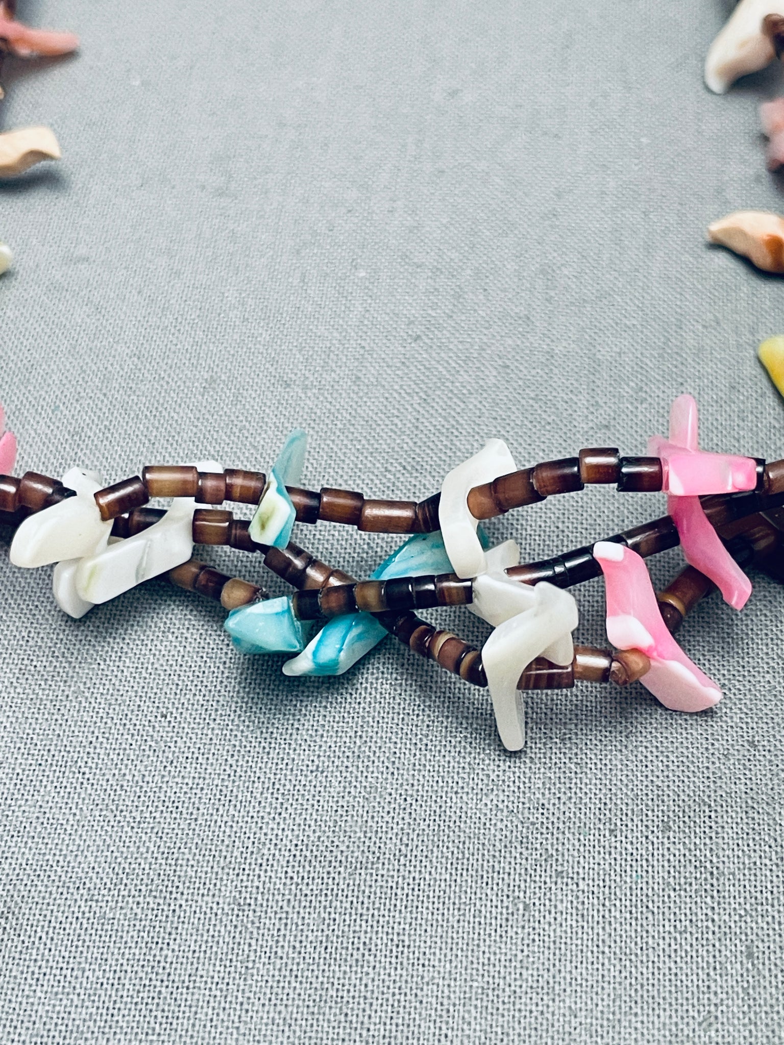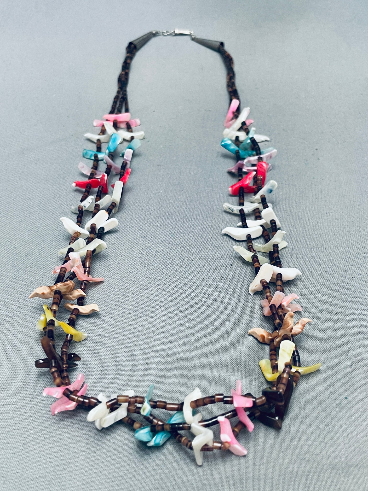This is a breathtaking vintage Santo Domingo three strand rainbow bird fetish necklace. This outstanding necklace contains three beautiful strands that include a mind blowing plethora of hand carved brown shell heishi. Located throughout the strands is a wonderful amount of hand carved shell bird fetishes. The shells are a beautiful pink, white, teal, purple, red, brown and black colors. Sterling silver. Cir. 1970's+. The length of the necklace measures around 26". Sturdy 37 grams.