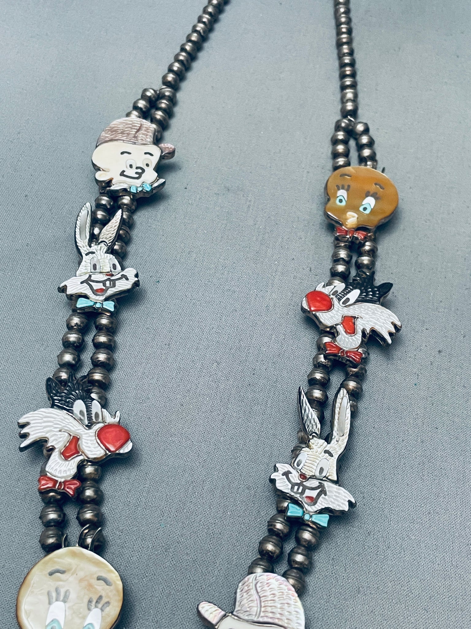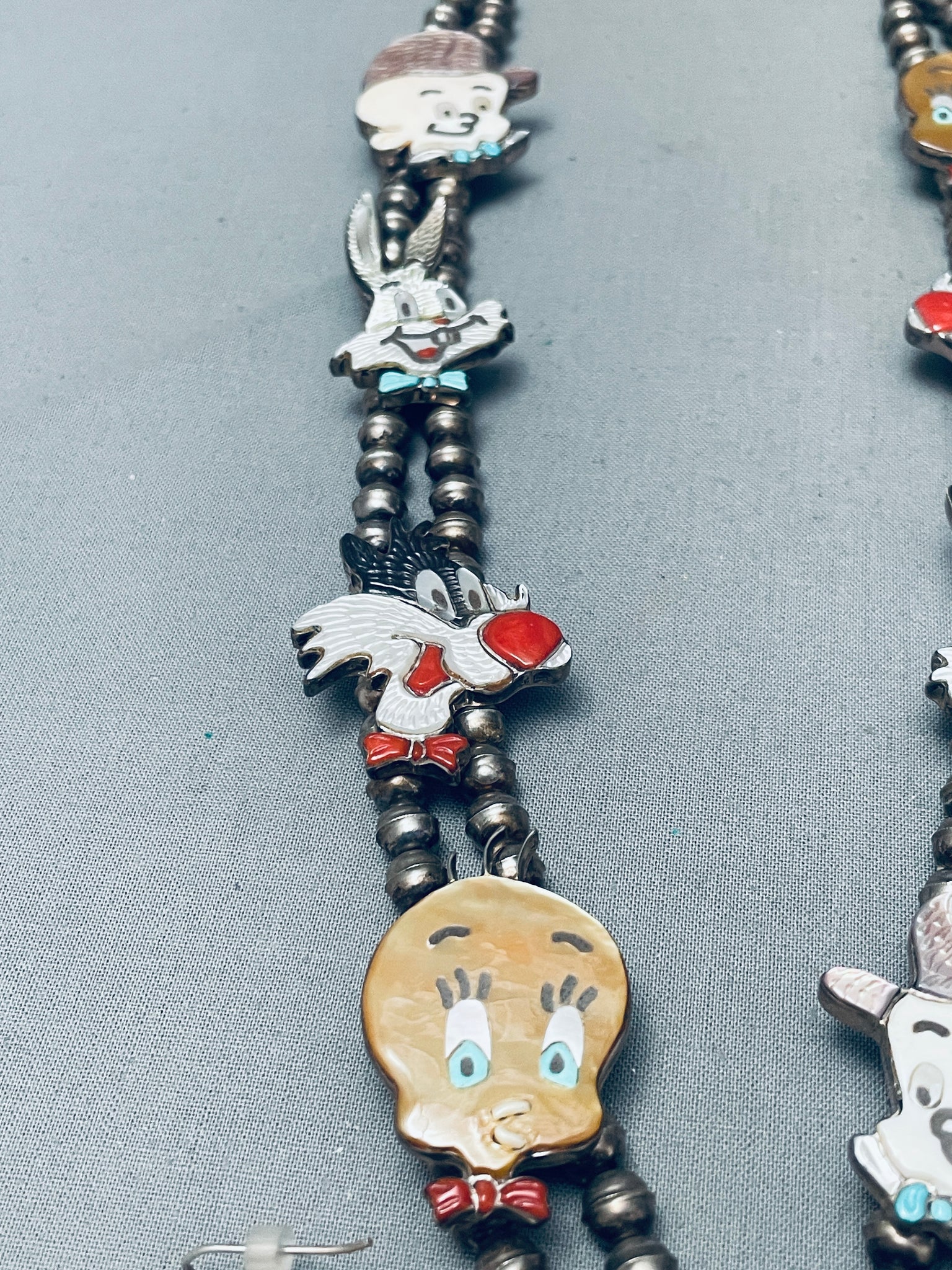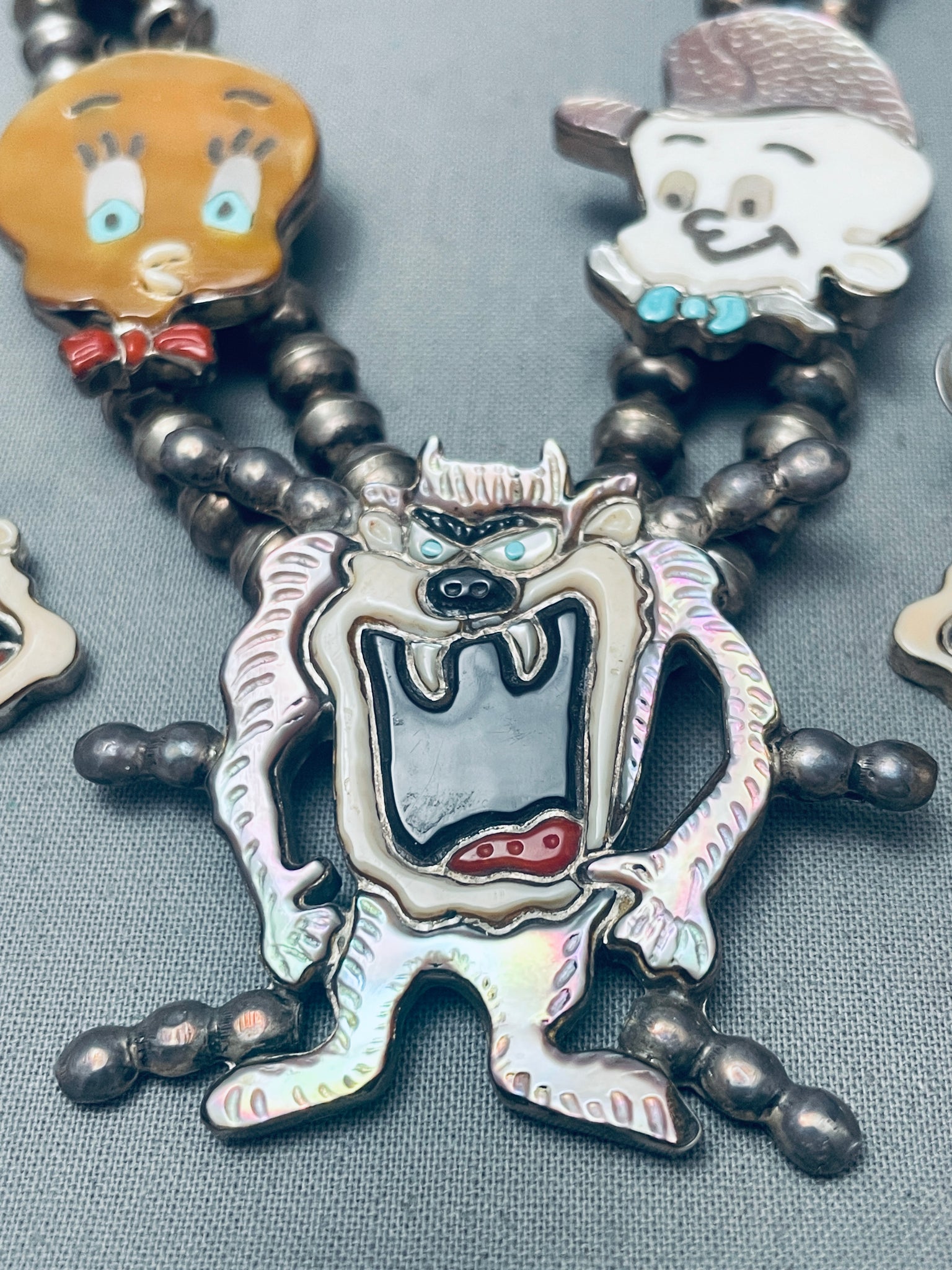 Looney Tunes Old Zuni Turquoise Sterling Silver Inlay Squash Blossom Necklace