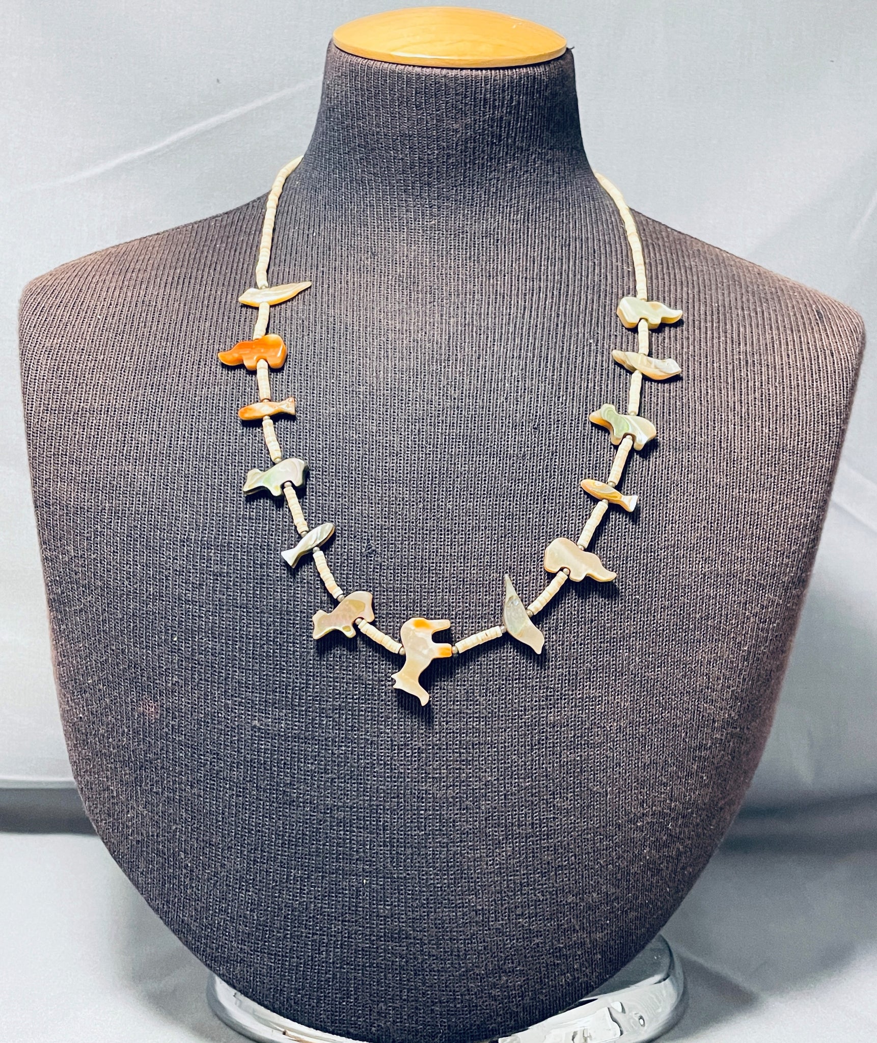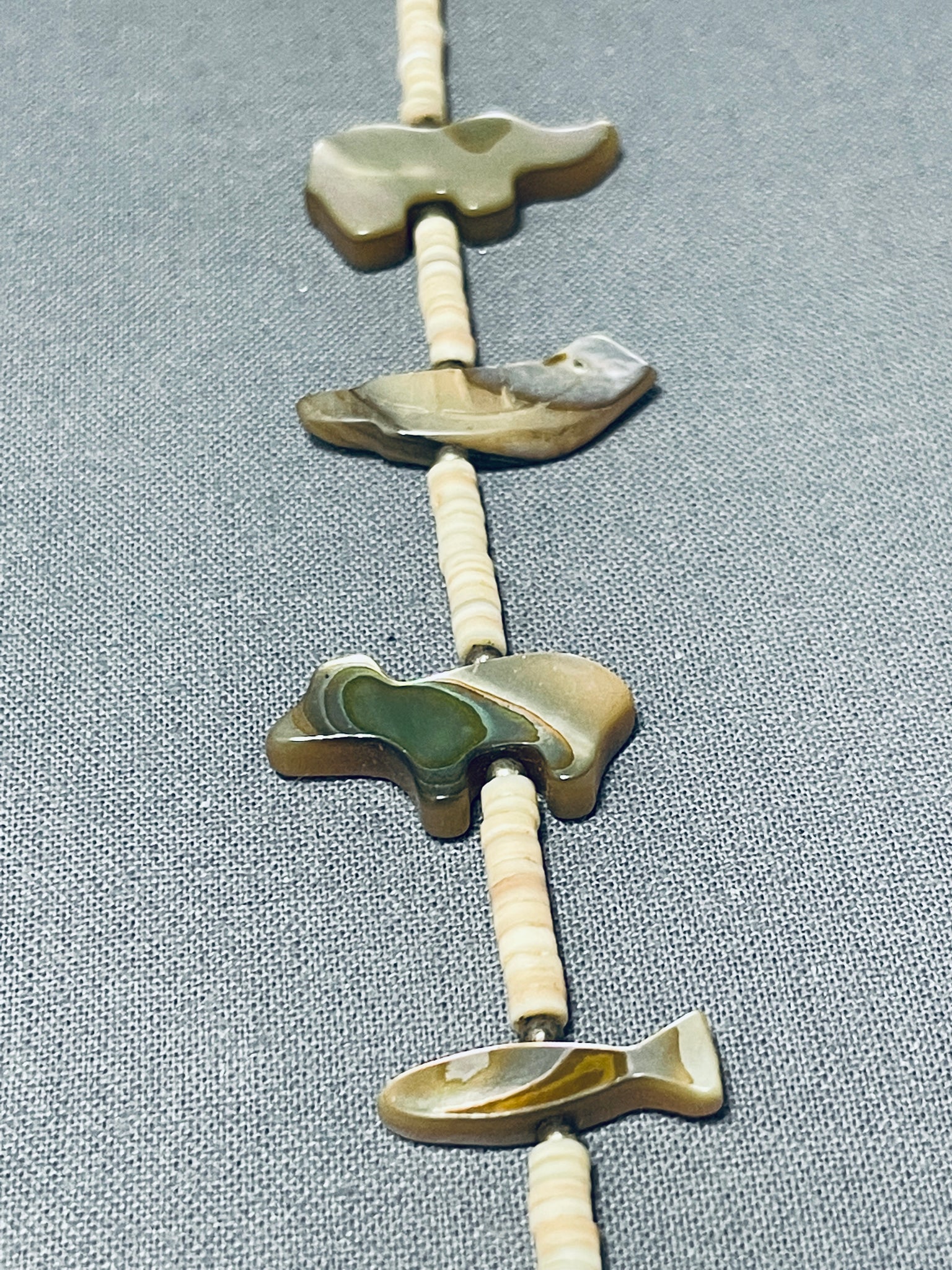 This is an exquisite vintage Santo Domingo shell fetish necklace. This remarkable necklace contains 13 outstanding hand carved shell fetishes that include animals and feather patterns. The intricacy of the carvings of the shells is just astonishing with the bottom largest fetish measuring around 1" X 1/2". Resting throughout the fetishes and towards the top of the necklace are wonderful hand cut tan shell heishi with accenting round silver beads. The necklace includes end silver cones with a traditional silver clasp. Sterling silver. Cir. 1970's+. The length of the necklace measures around 22". Sturdy 25 grams.