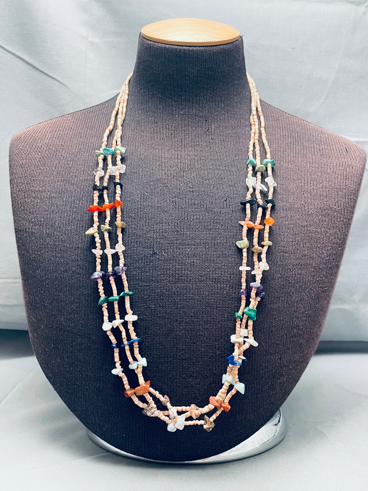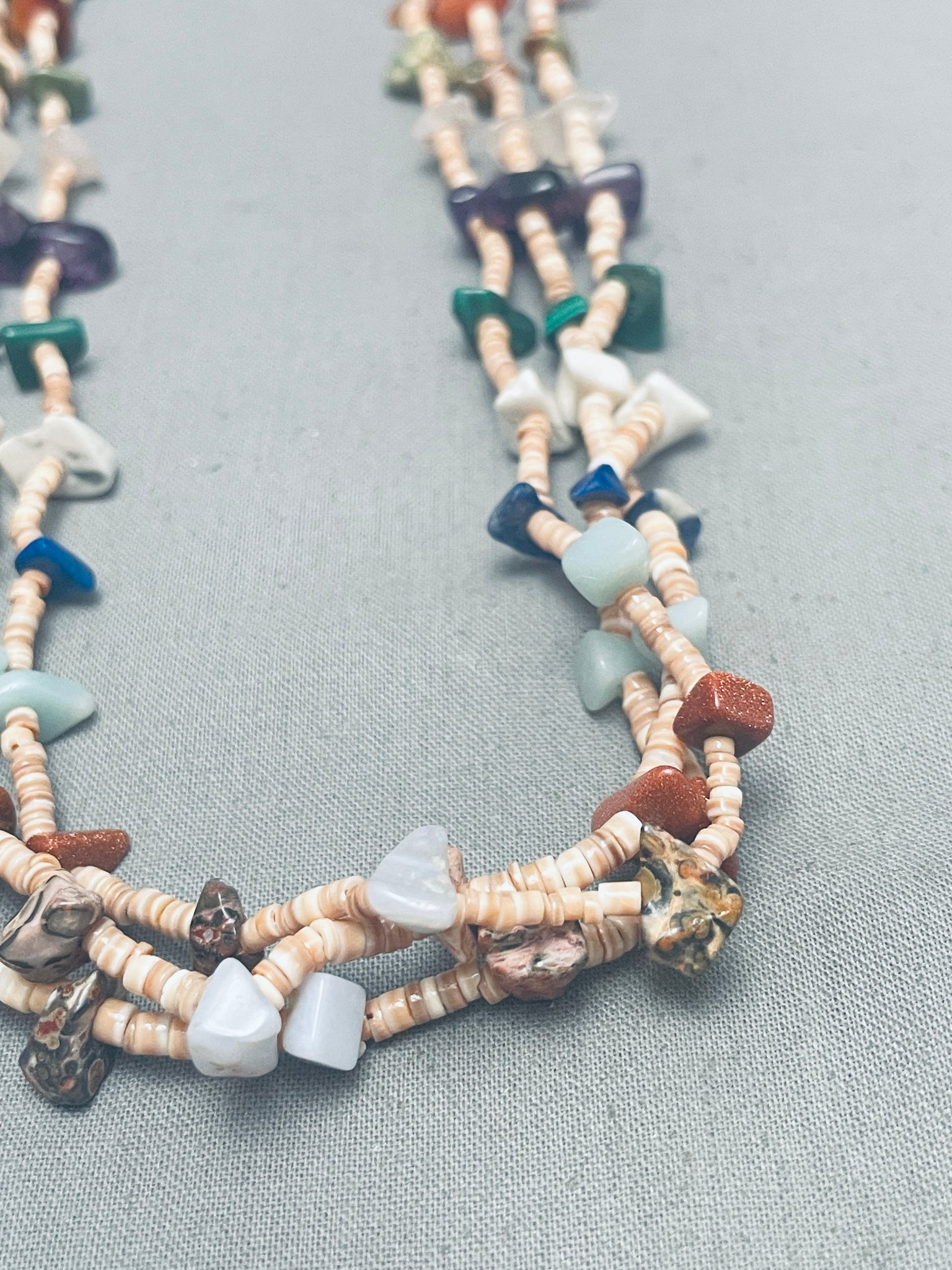 This is a superior vintage Navajo multiple strand necklace. This remarkable necklace contains three strands that consist of Royston turquoise, clear stone, onyx, jasper, sugulite, malachite, white stone, lapis, pipestone, and agate stones. The way the artist situated the stones and shells on the strands is just impeccable and so beautiful. Resting throughout the stones and shells and on both ends are wonderful tan shell heishi, end silver cones and a traditional silver clasp. Sterling silver. Cir. 1970's+. The length of the necklace measures around 28". Sturdy 47 grams.