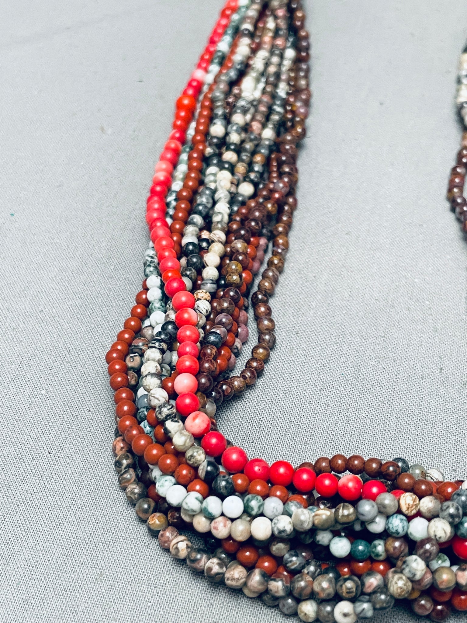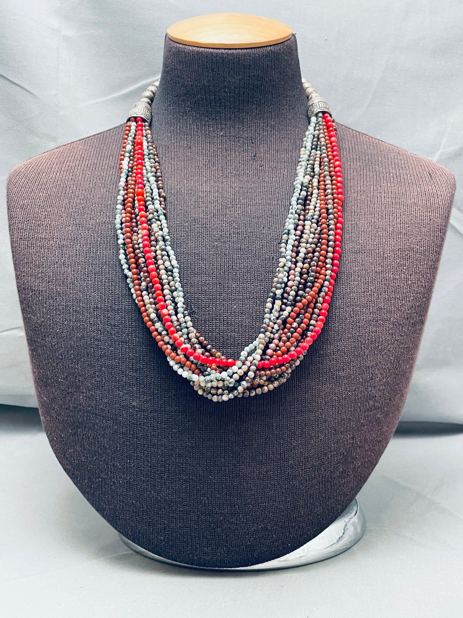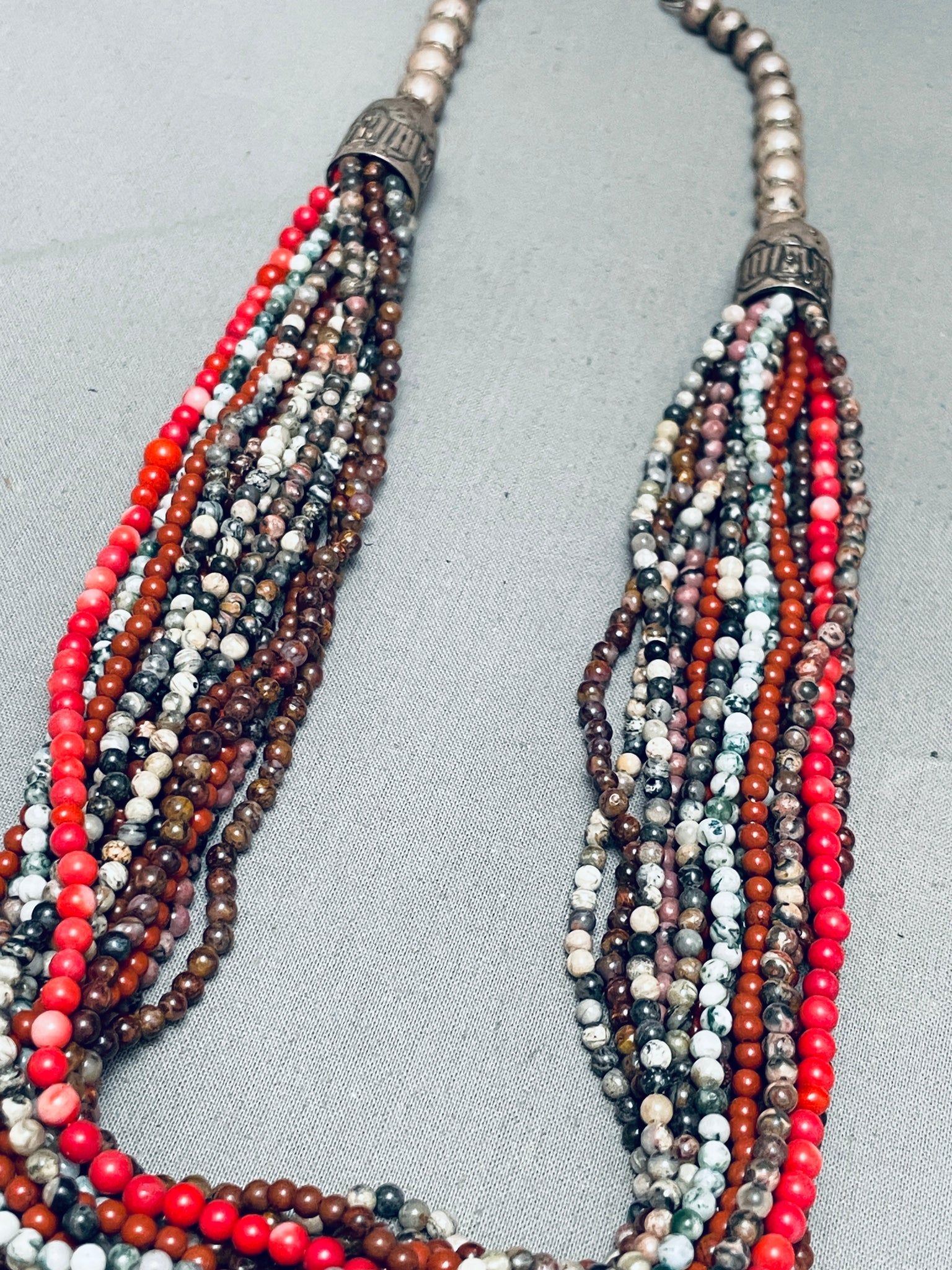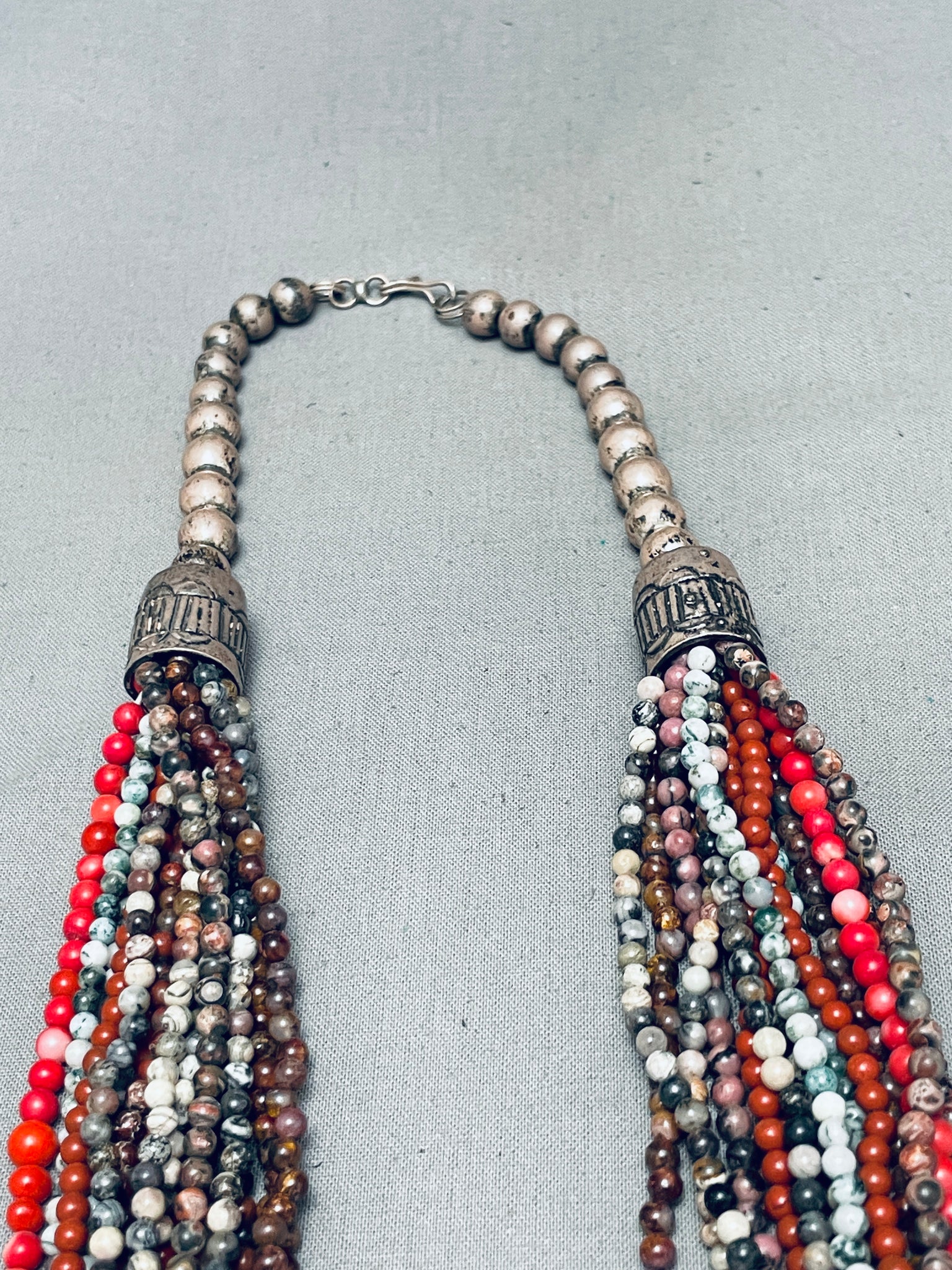 This is an impressive vintage Santo Domingo multiple strand necklace. This incredible necklace contains a fascinating plethora of strands, a total of 15 wonderful strands. The strands consist of a beautiful plethora of rounded hand carved stones. The stones consist of brown stones, tan stones, mauve colored stones, coral, and pipestone. Resting at the ends are amazing large silver rounded cones with striking stamp patterns. The end of the necklace contains stunning rounded silver beads with a traditional silver clasp. Sterling silver. Cir. 1970's+. The length of the necklace measures around 23". Sturdy 114 grams.