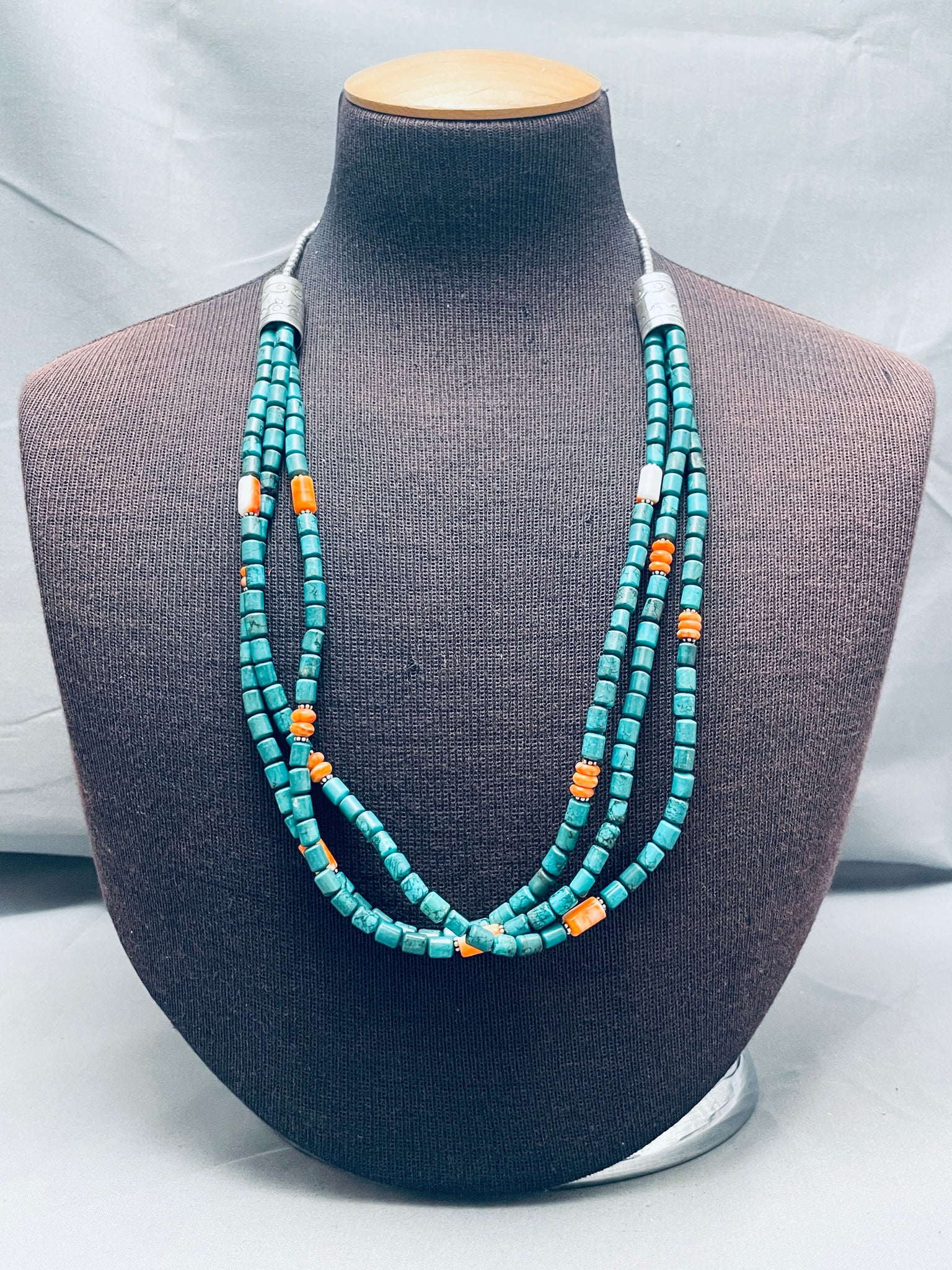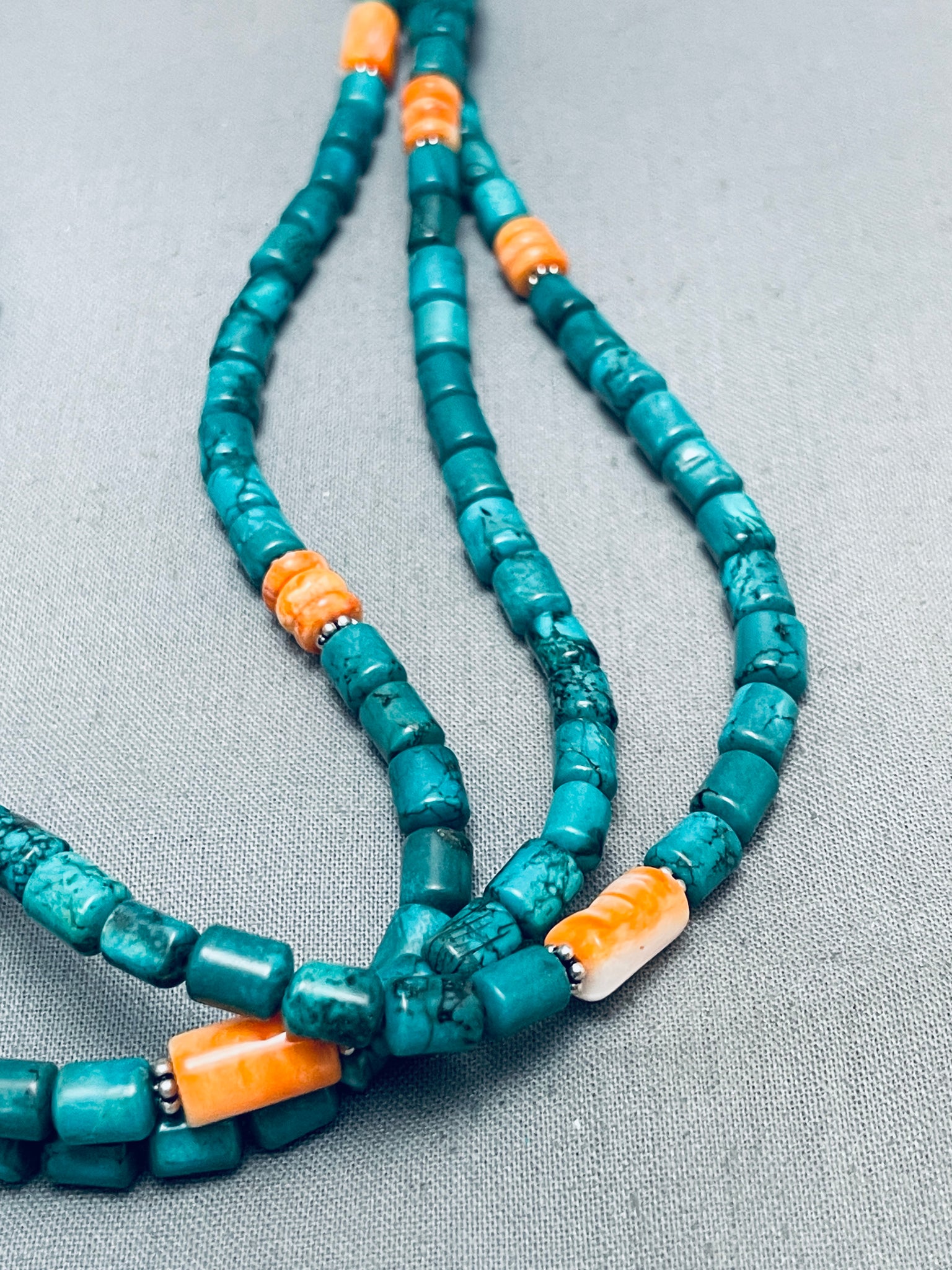 This is an exquisite Navajo three strand turquoise silver bead necklace. This wonderful necklace contains three bottom strands that consist of chunky cylindar shaped turquoise stones. Accenting the stones are beautiful cylindar shaped orange spiny oyster shells with accenting silver flower beads. Resting near the ends seperating te three strands from the single strand are large silver drum beads with end round silver beads. The stamp works on the beads are amazing and stunning. Sterling silver, marked. The length of the necklace measures around 25". Sturdy 76 grams.