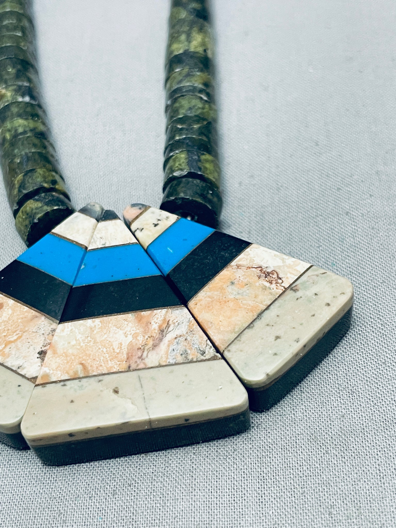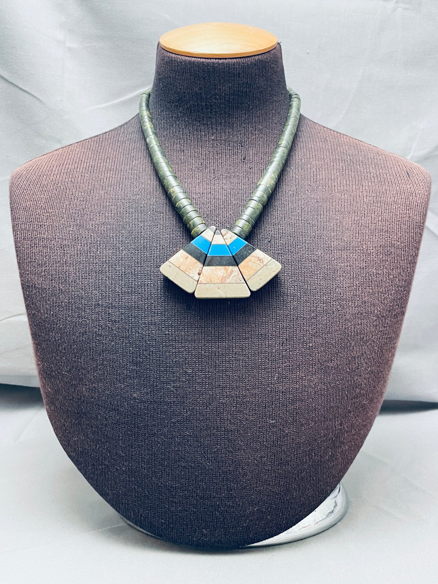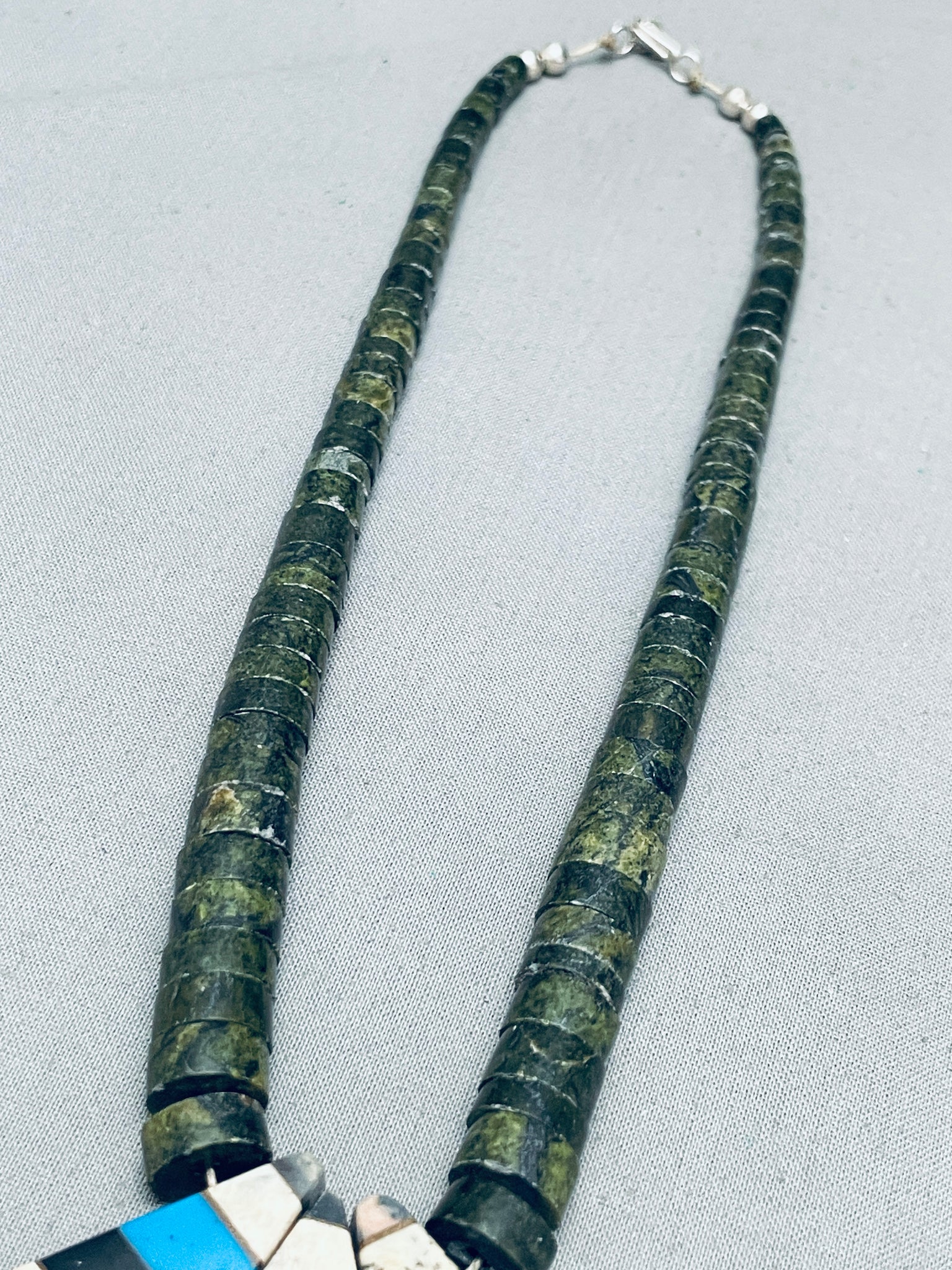 Native American Intricate Vintage Santo Domingo Inlay Pendant Sterling Silver Necklace