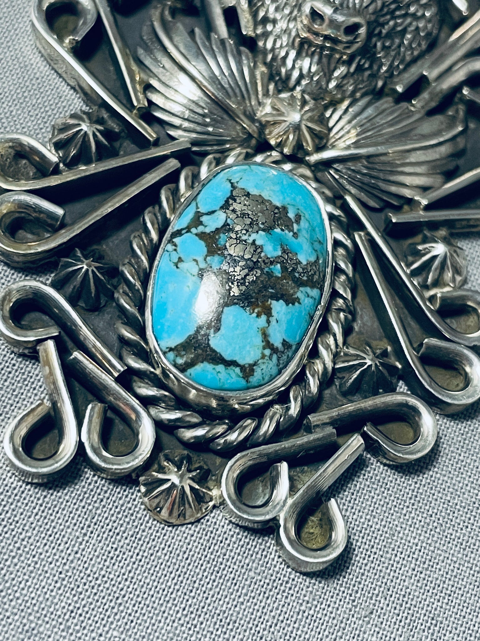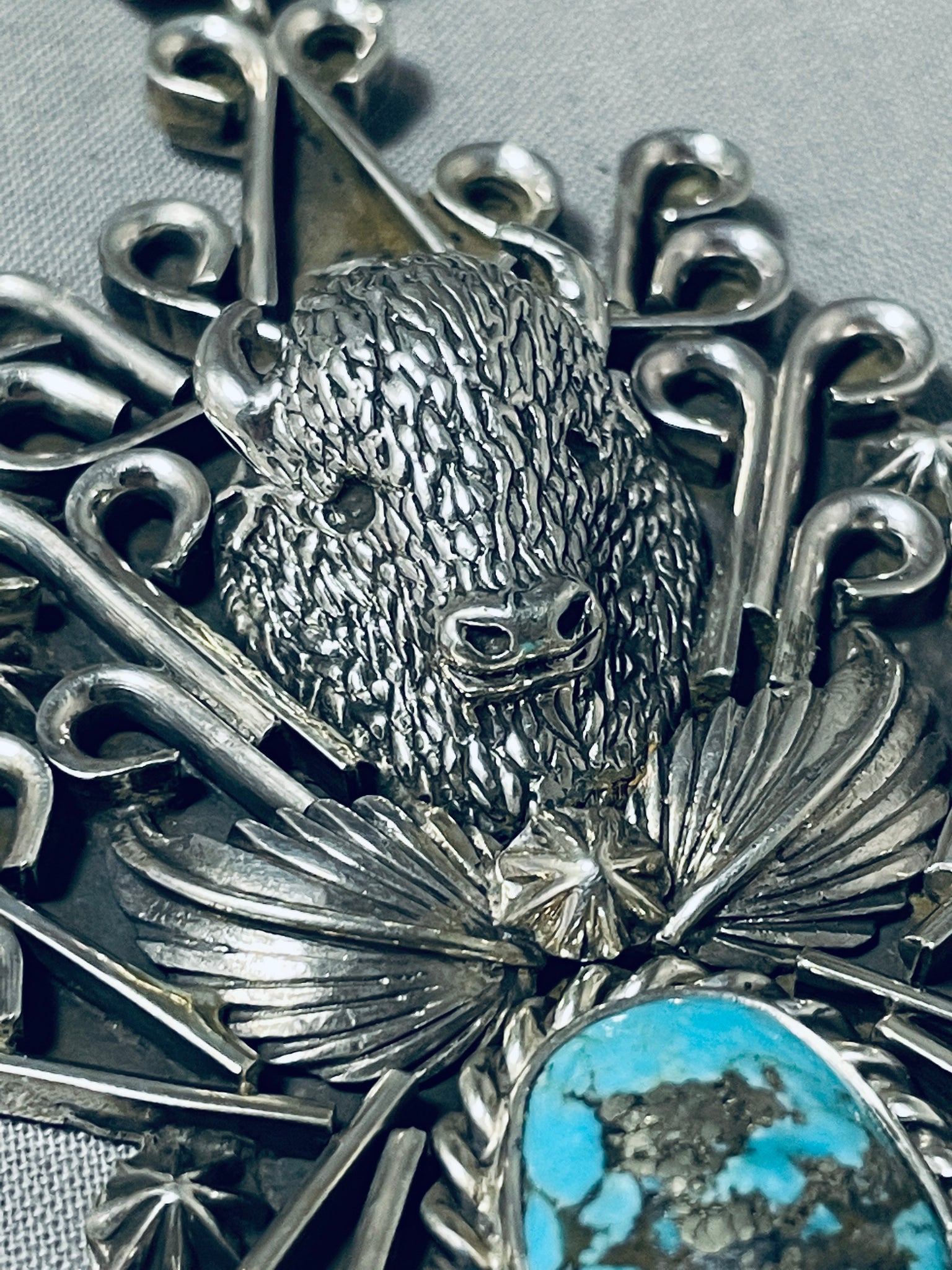 Ornate Native American Navajo Old Kingman Turquoise Sterling Silver Buffalo Pendant