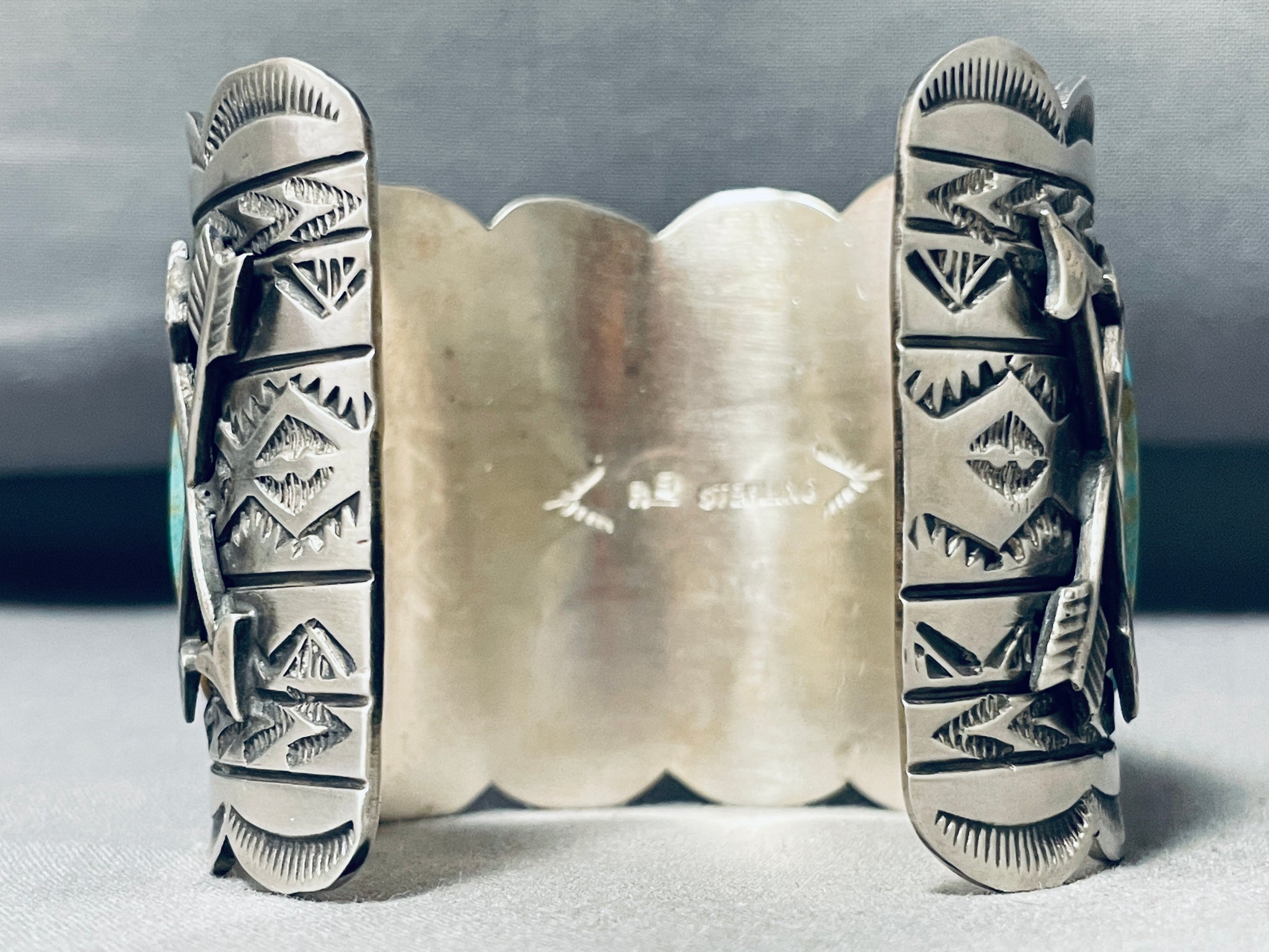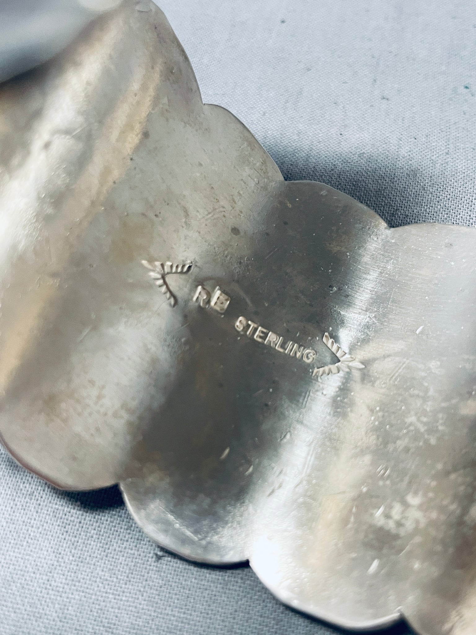 The Royston Turquoise Mine, located in the rugged and picturesque Royston Hills of Nevada, is renowned for producing some of the most stunning and sought-after turquoise in the world. This historic mine has been a source of the prized gemstone for over a century, with its turquoise coveted for its exceptional color and unique matrix patterns. What sets Royston turquoise apart is its remarkable spectrum of hues, ranging from vibrant blues and deep greens to striking combinations of both. Miners have extracted turquoise from various deposits within the Royston mine complex, including the Royal Blue, Bunker Hill, and Oscar Wehrend veins, each offering its distinct character and beauty. Royston turquoise is highly regarded by jewelry makers, collectors, and artisans who appreciate its distinctive quality and the legacy of this iconic American gem. The center stone measures around 1-1/4" x 3/8". The width of the bracelet measures around 2". Signed by Navajo artist, R.E. Sterling silver, marked. The inside end to end measures around 5-3/4" with an additional 1-1/4" gap. Sturdy 140 grams.