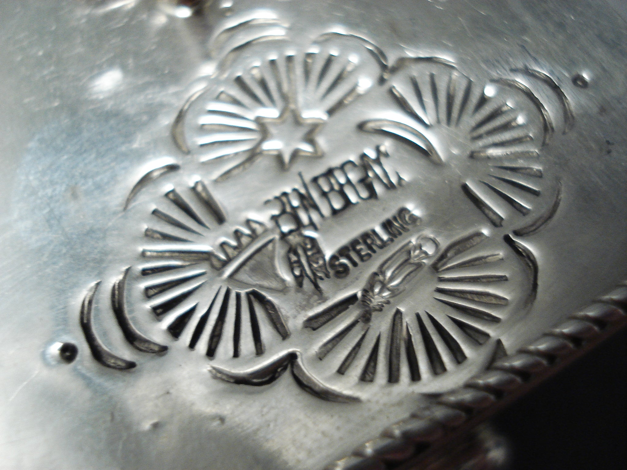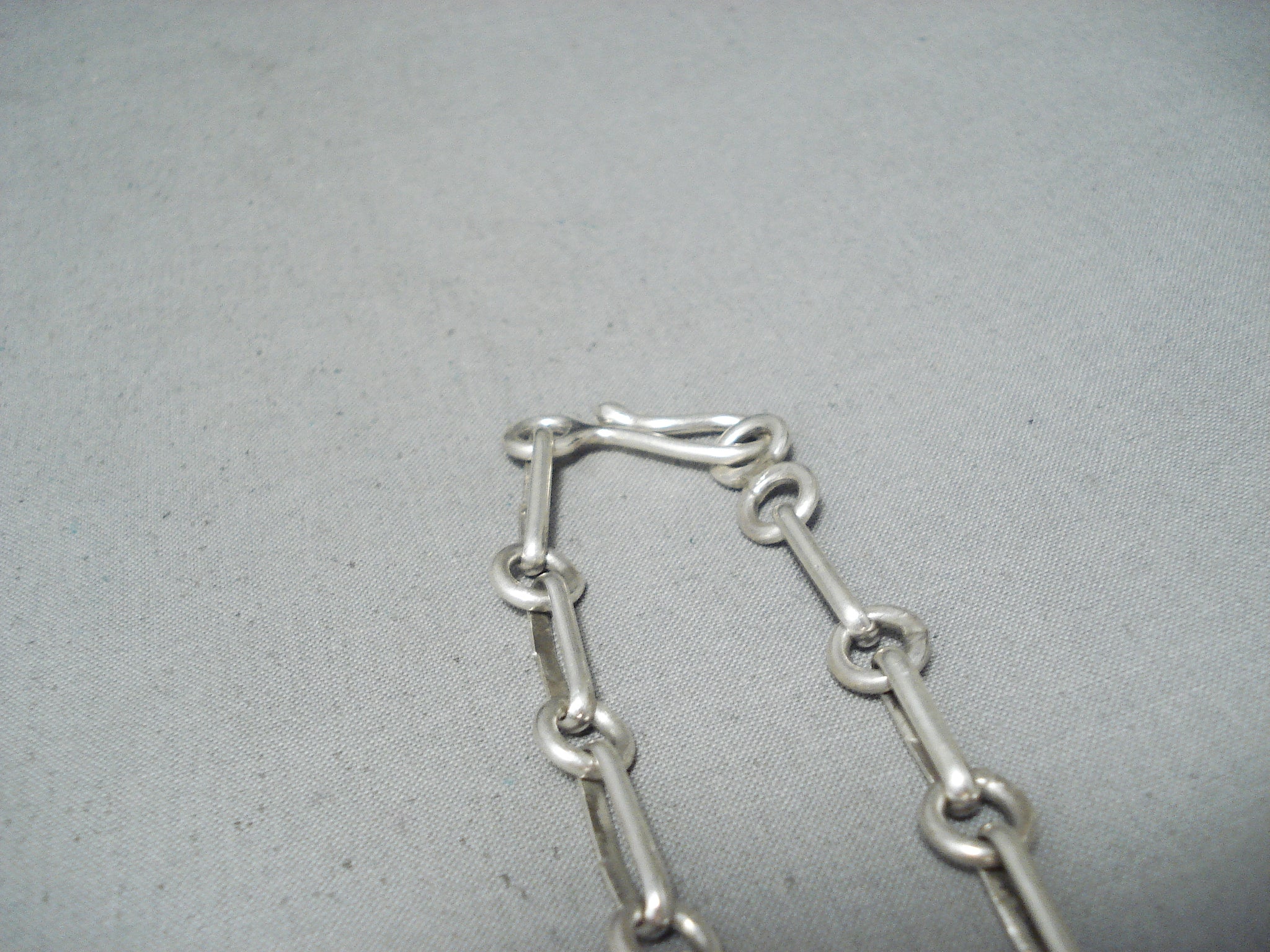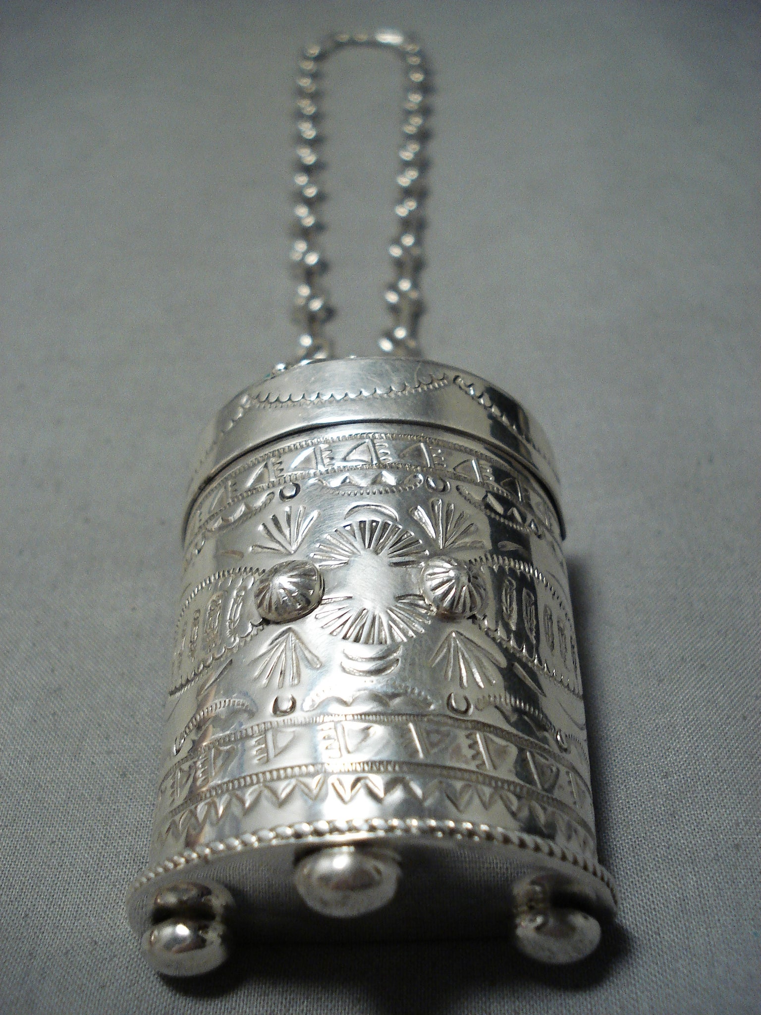 Here we have an impressive Navajo silver necklace having a large handcarved silver pillbox pendant with a Royston turquoise stone, silver florals, silver swirls, silver stars and silver fans on the handcarved removable silver lid! The silver pillbox pendant has 3 large handcarved silver bead feet and silver handstampings all around! The necklace has thick handcarved oblong and round silver links and a silver hook and eye clasp! Absolutely Magnificent! The silver pillbox pendant measures about 2-3/8" x 1-3/4". Royston turquoise stone measures about 3/4" x 5/8". Sterling silver, marked. Signed by Navajo artist, Ben Begaye. The length of the necklace measures around 24". Sturdy 118 grams.