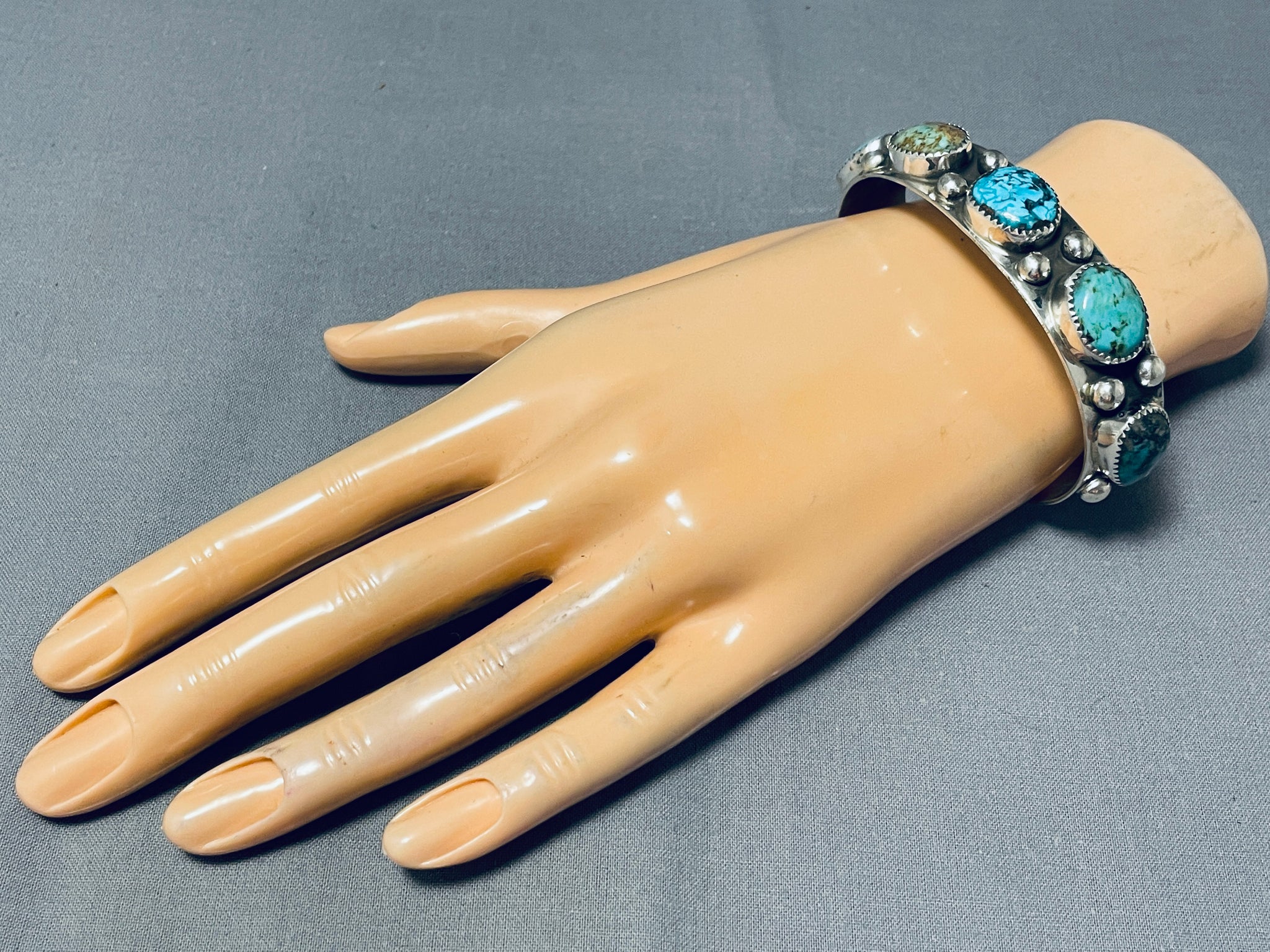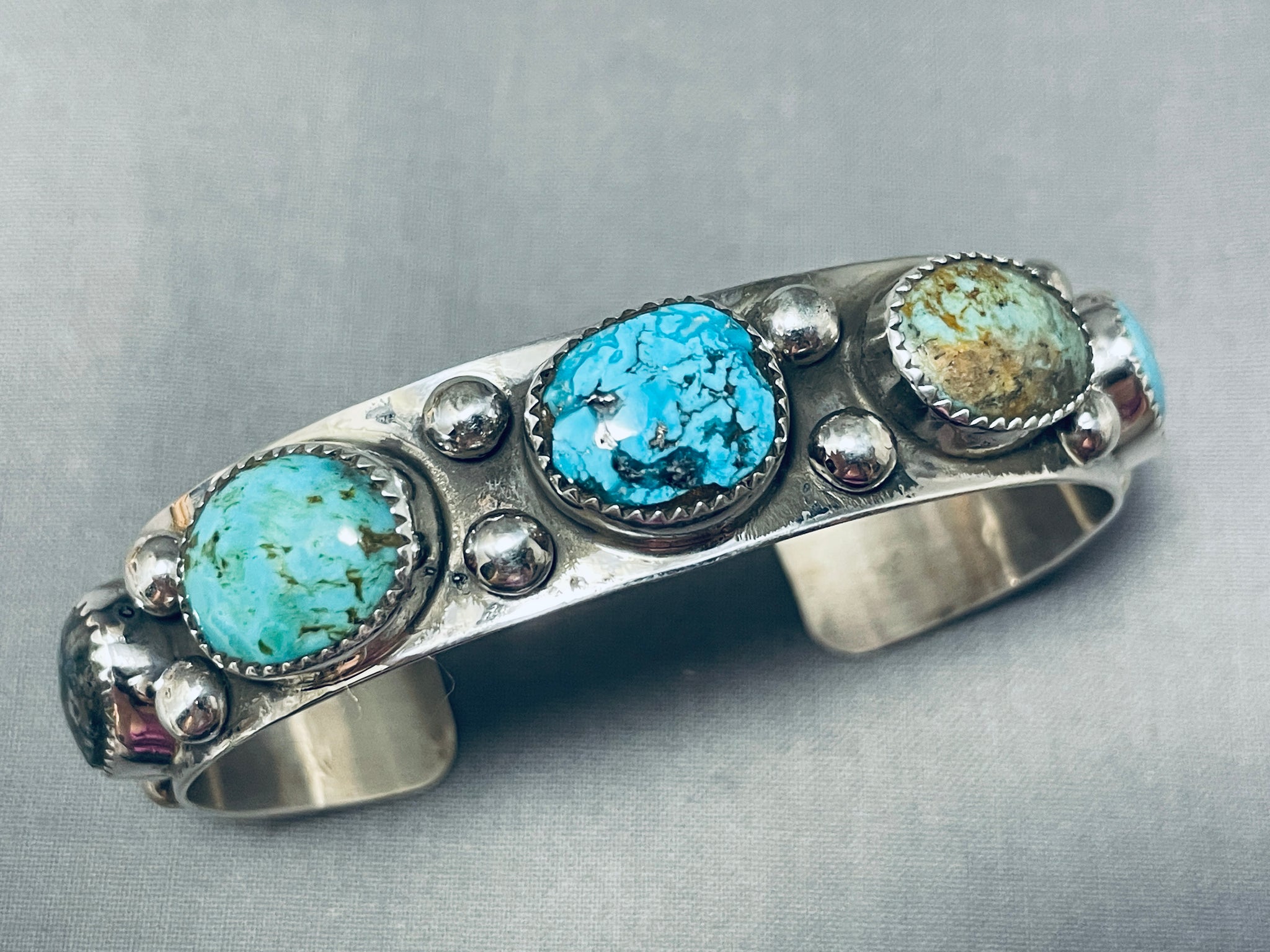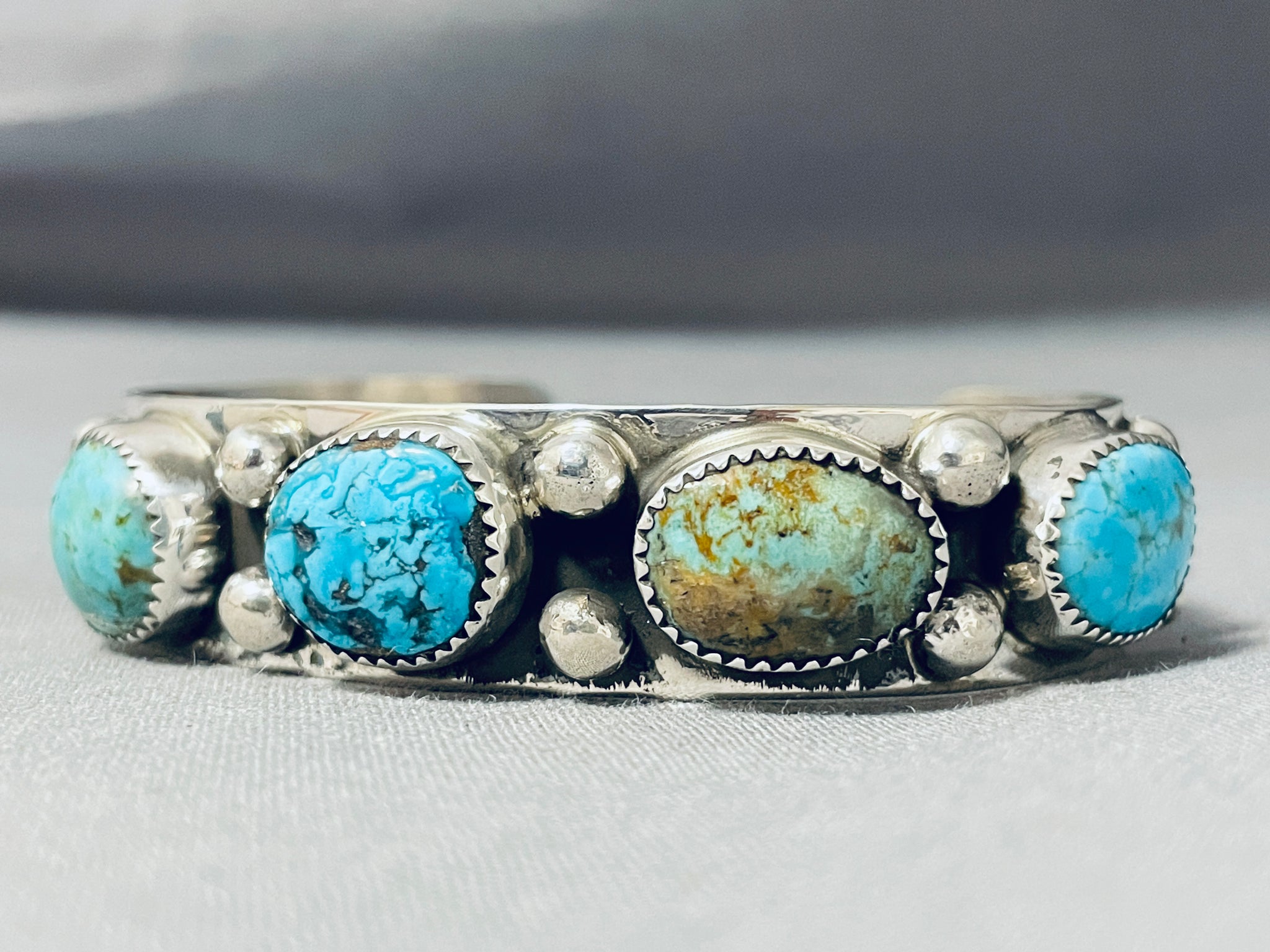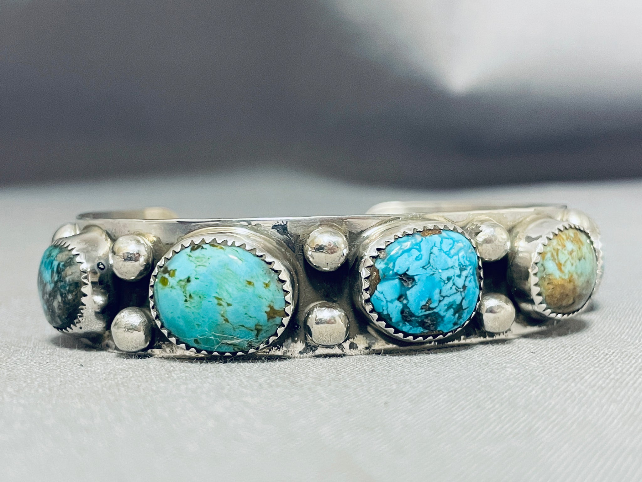 This is a striking Native American multiple turquoise stone silver bracelet. This amazing bracelet contains 5 beautiful turquoise stones that appear to be from both the Royston and Blue Gem turquoise mines. Situated throughout the stones are wonderful silver raindrops. Located at the ends of the bracelet are impeccable silver stampings. The center stone measures around 5/8" x 1/2". The width of the bracelet measures around 5/8". Signed by artist, Jake Troncosa. Sterling silver, marked. The inside end to end measures around 6" with an additional 1" gap. Sturdy 34 grams.