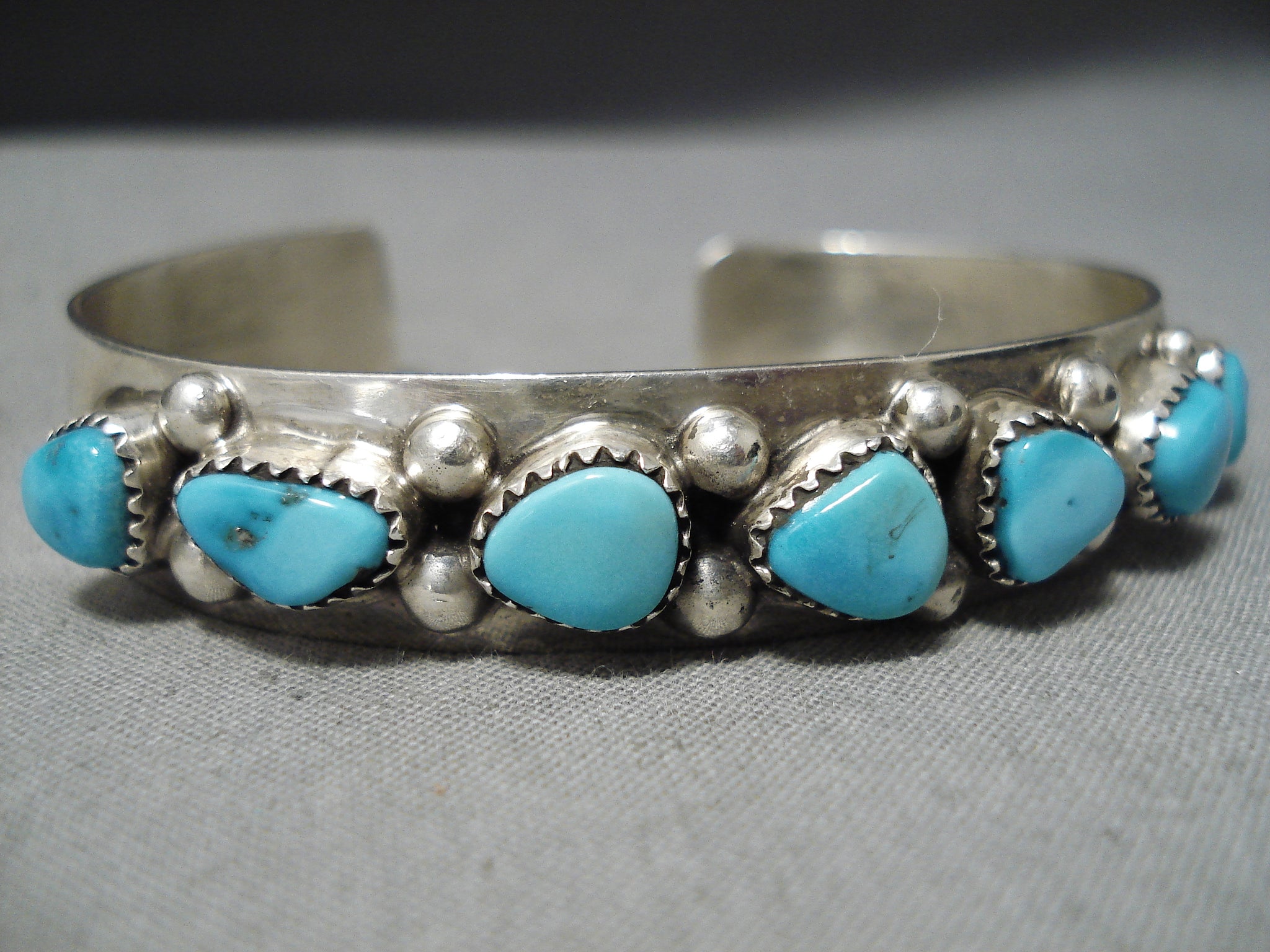 A magnificent vintage Navajo silver bracelet. Separated with dual silver beads, the face of the bracelet boasts 7 southwestern sky blue Pilot Mountain turquoise stones – one more impressive than the next! The center stone measures around 1/4" x 1/4". The width of the bracelet measures around 1/2". Signed by Navajo artist, Les Craig. Sterling silver, marked. The inside end to end measures around 5-3/4" with an additional 1" gap. Sturdy 26 grams.