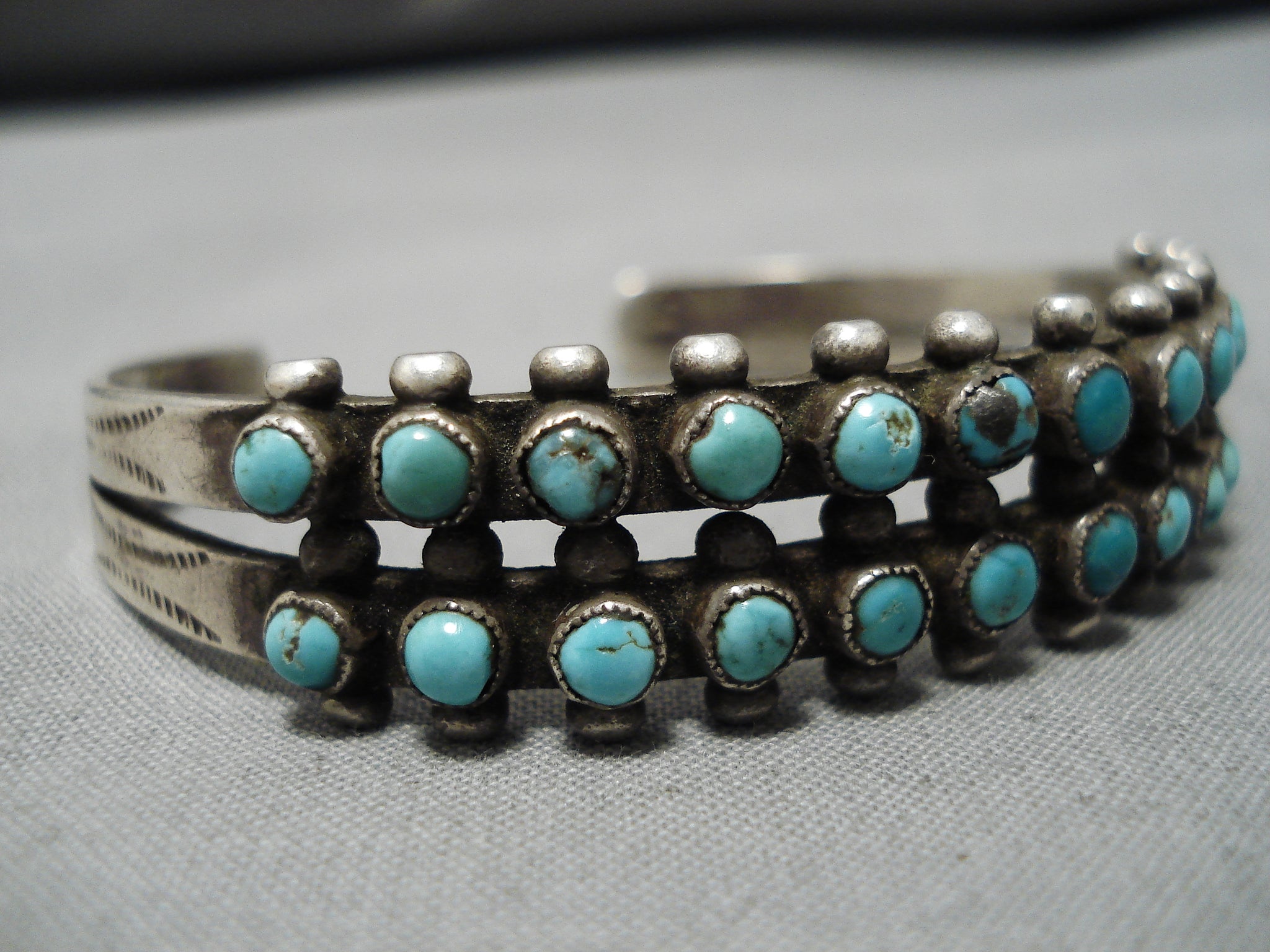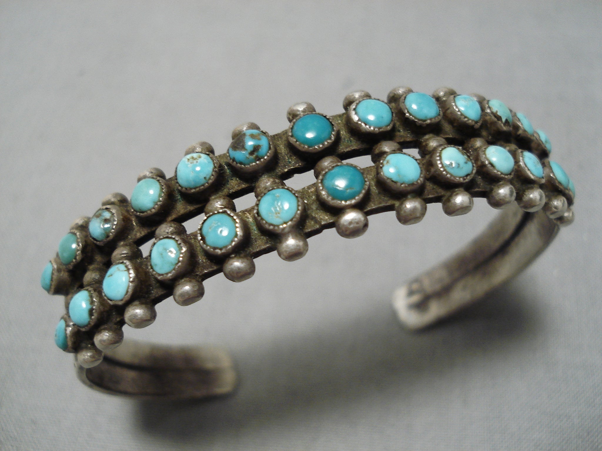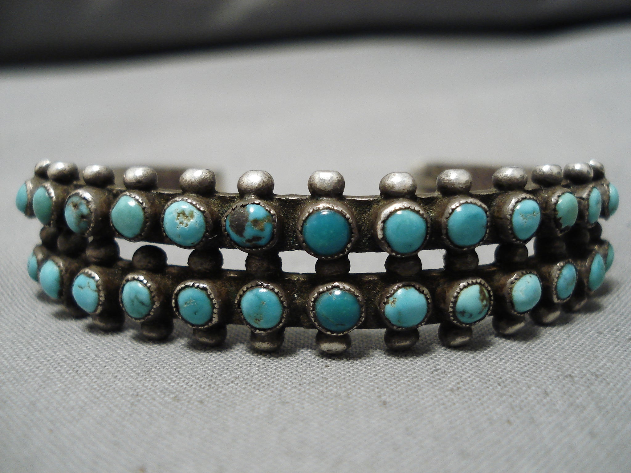 This is an amazing vintage Navajo silver bracelet. Each of the split dual rails of this marvelous bracelet is home to 13 turquoise rounds as silver beads simply separate and accent these 26 wonderful little gems! The width of the bracelet measures around 5/8". Sterling silver. The inside end to end measures around 5-1/2" with an additional 1" gap. Sturdy 26 grams.