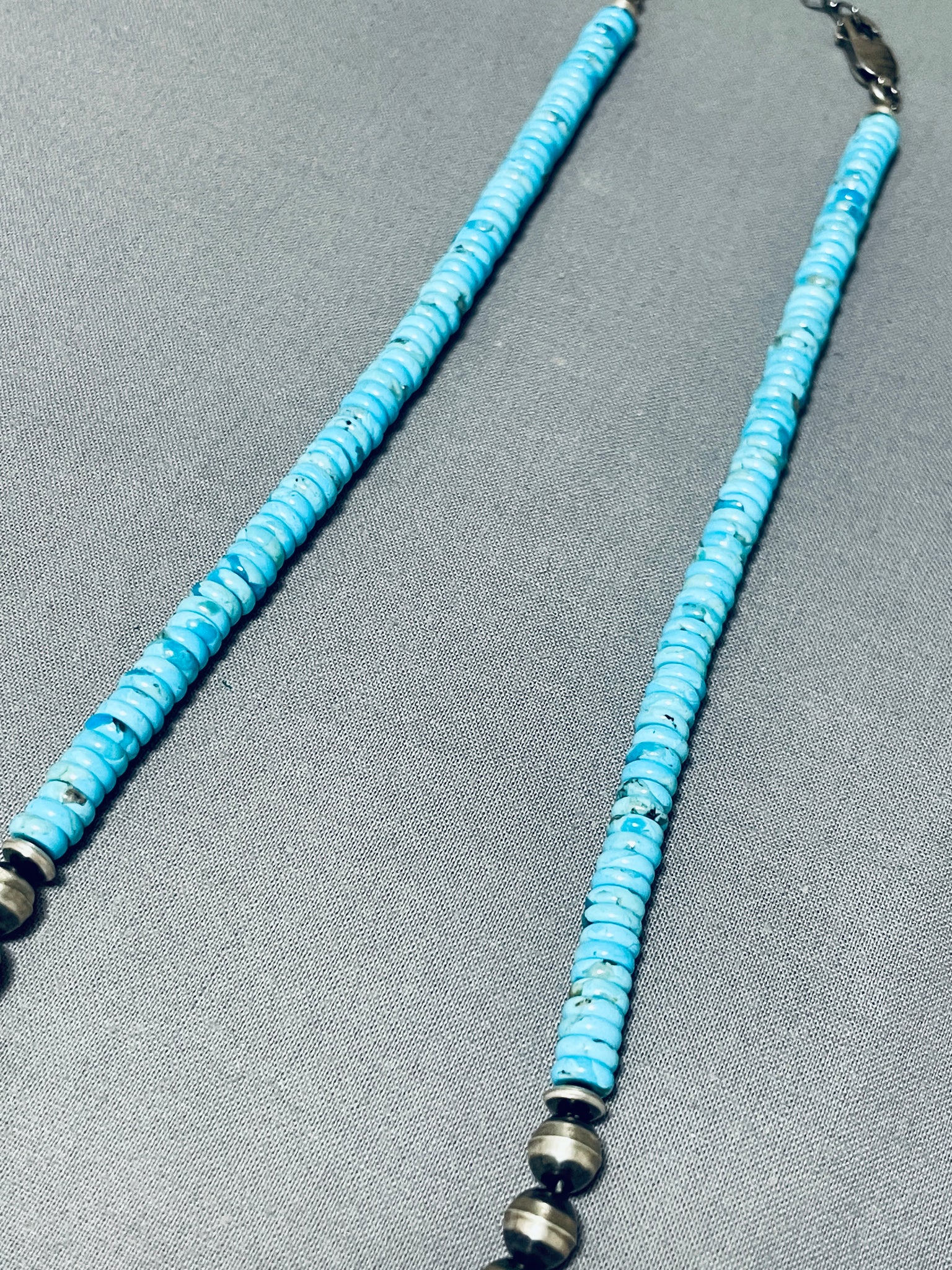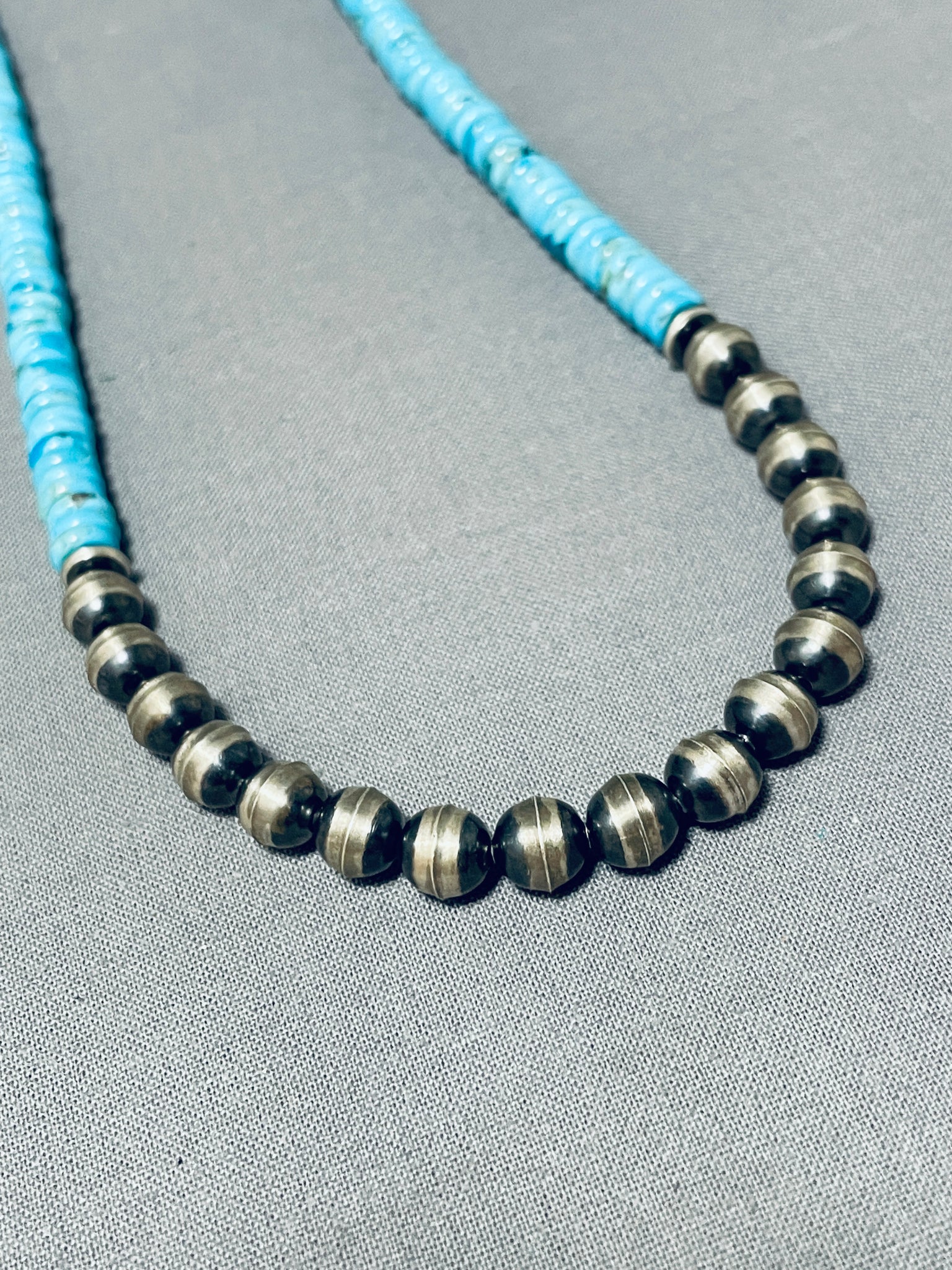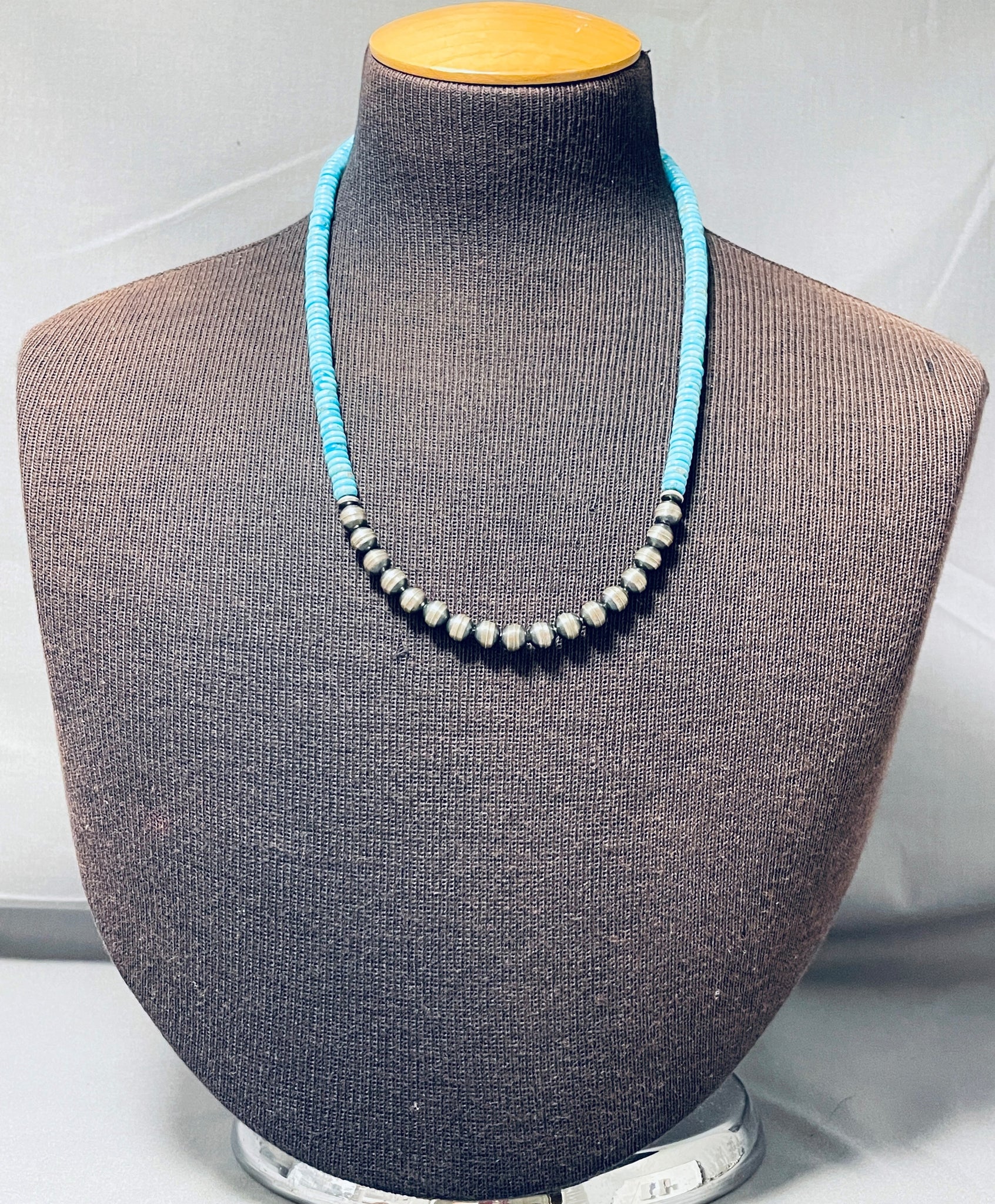 Up for sale is this striking vintage Navajo necklace having Kingman turquoise heishi, handcarved silver beads and an adjustable silver chain with a handmade silver clasp! Truly Remarkable Piece! Silver beads measure about 1/4" x 1/4". Sterling silver. The length of the necklace measures around 20". Sturdy 25 grams.