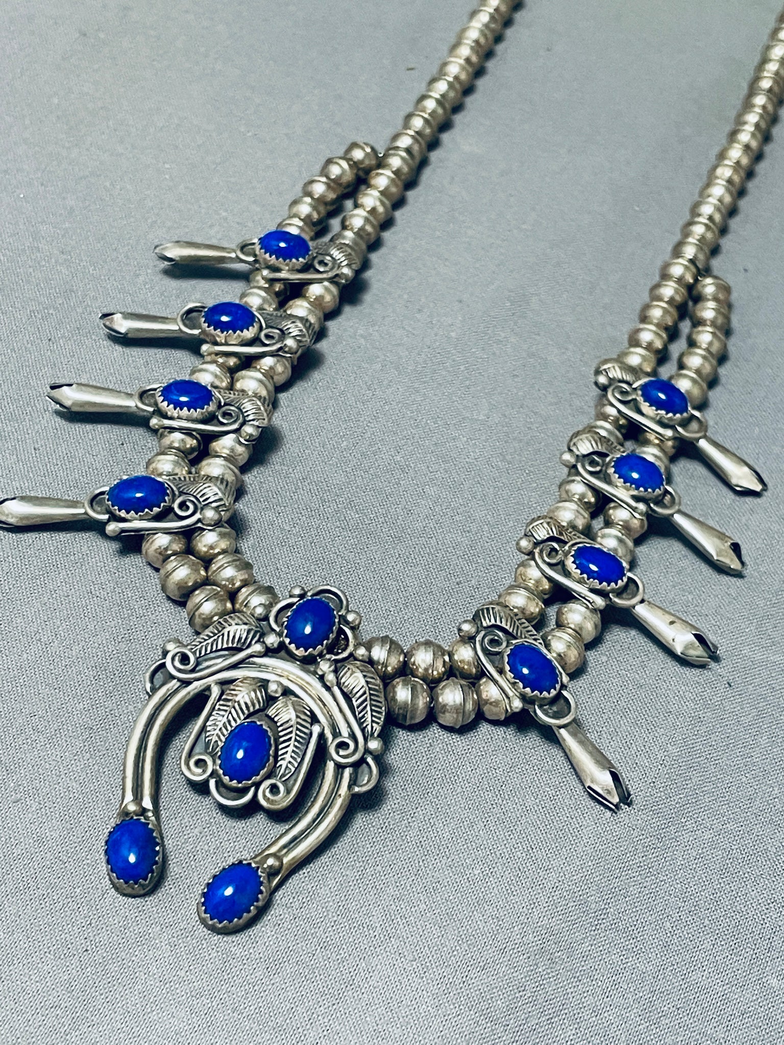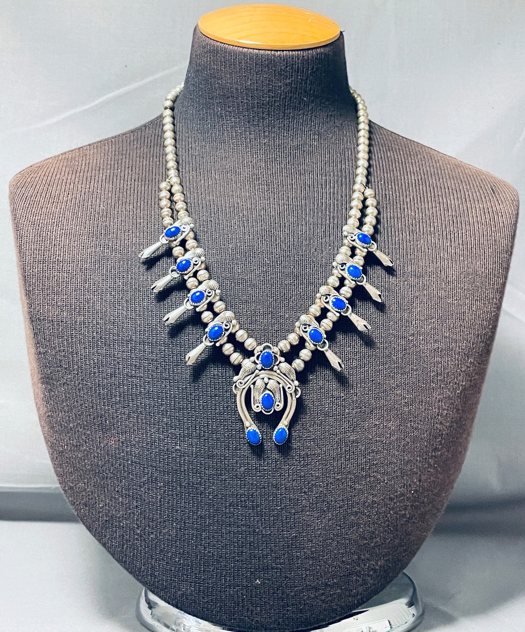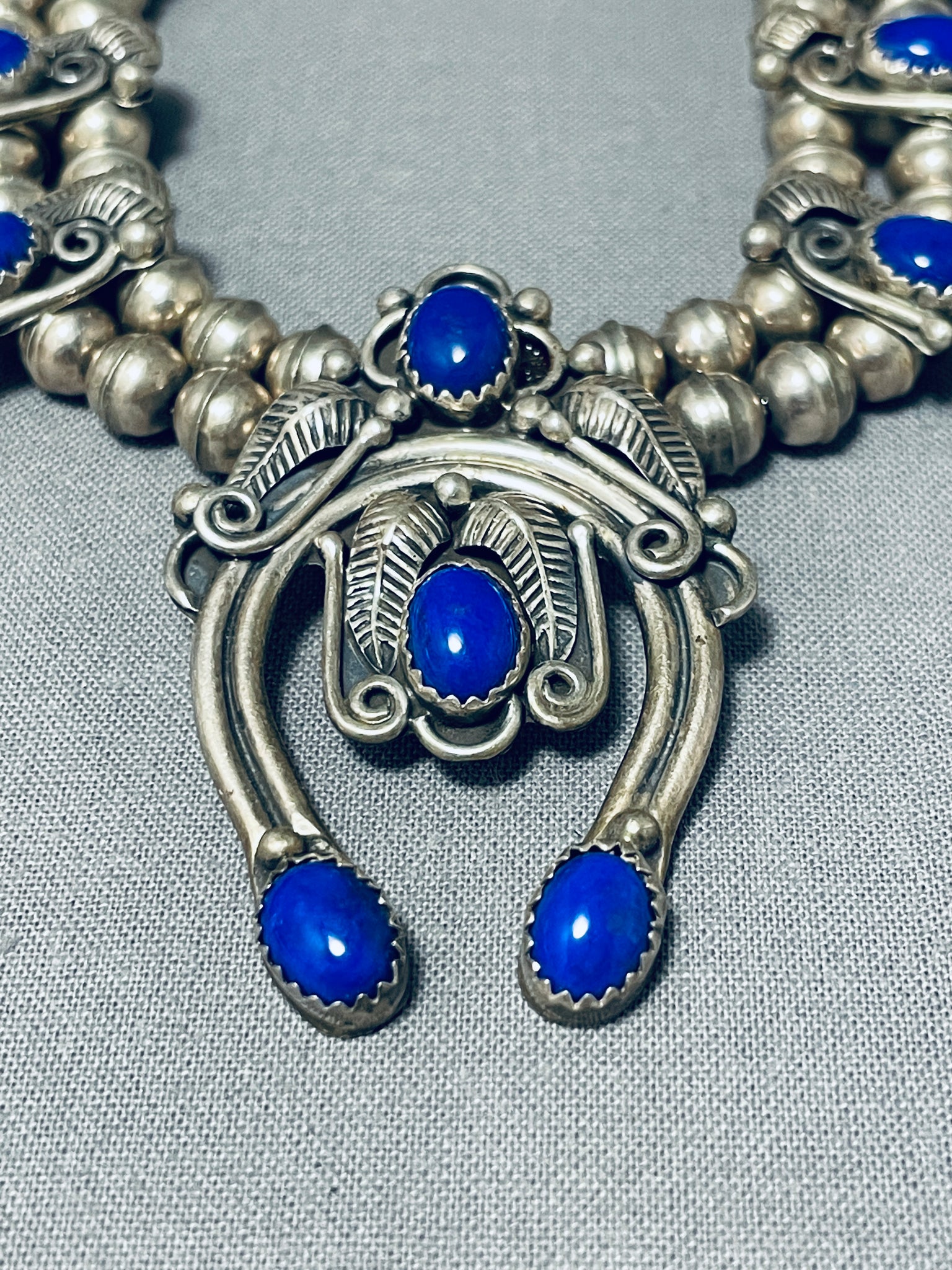 Astonishing Vintage Native American Navajo Lapis Sterling Silver Squash Blossom Necklace Signed