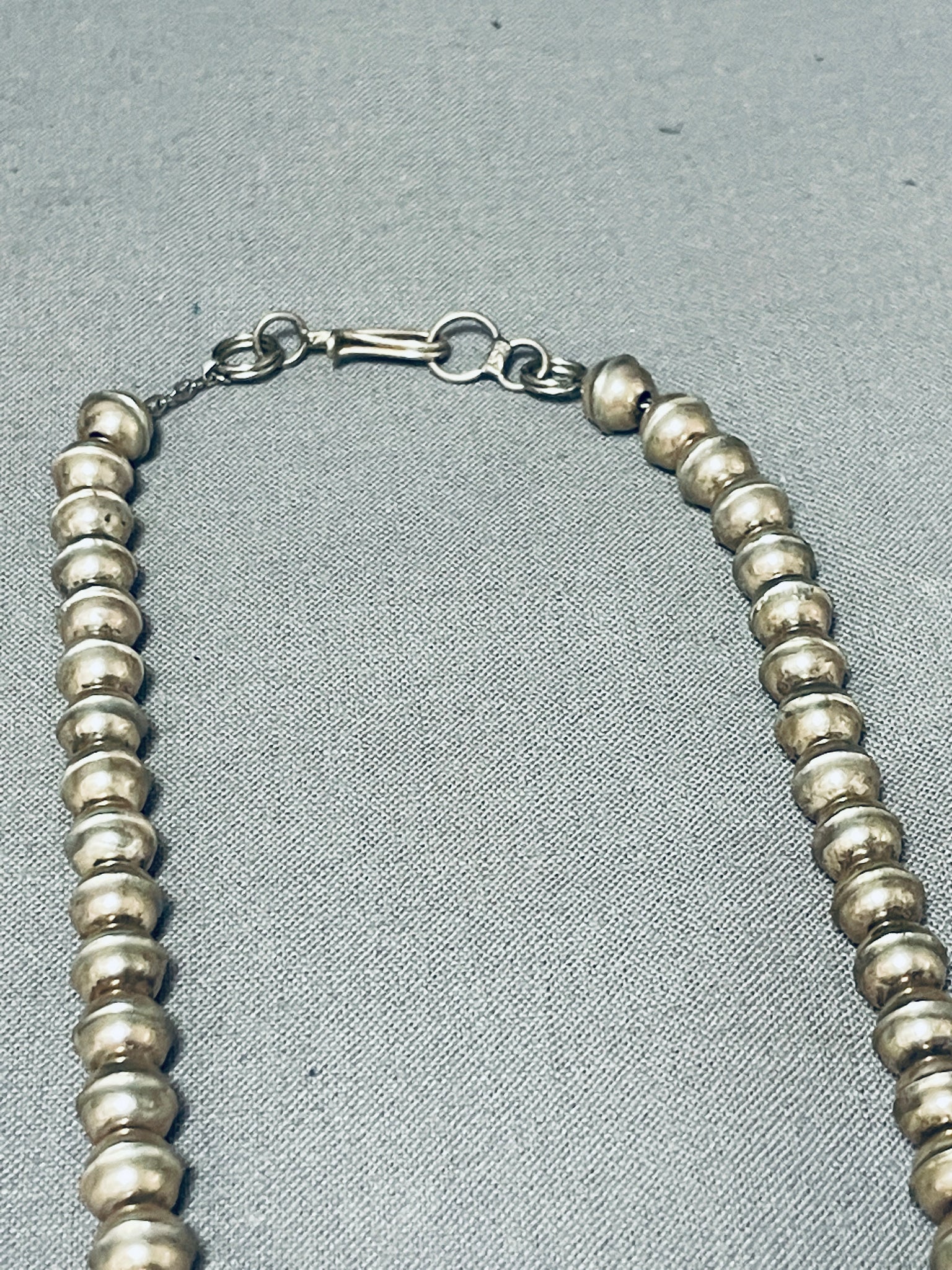 This is an exquisite vintage Navajo silver squash blossom necklace. Here we have a fabulous ¼' silver bead squash blossom necklace, hosting twelve impressive ¼" x 3/16" lapis stones! Each of the 8 blossoms measure about 1-1/4" x 3/8" and the incredible naja measures 1-7/8" x 1-1/2". Sweet! Sterling silver, marked. Cir. 1970's+. Signed by Navajo artist, Arthur J. Williams. The length of the necklace measures around 23". Sturdy 46 grams.