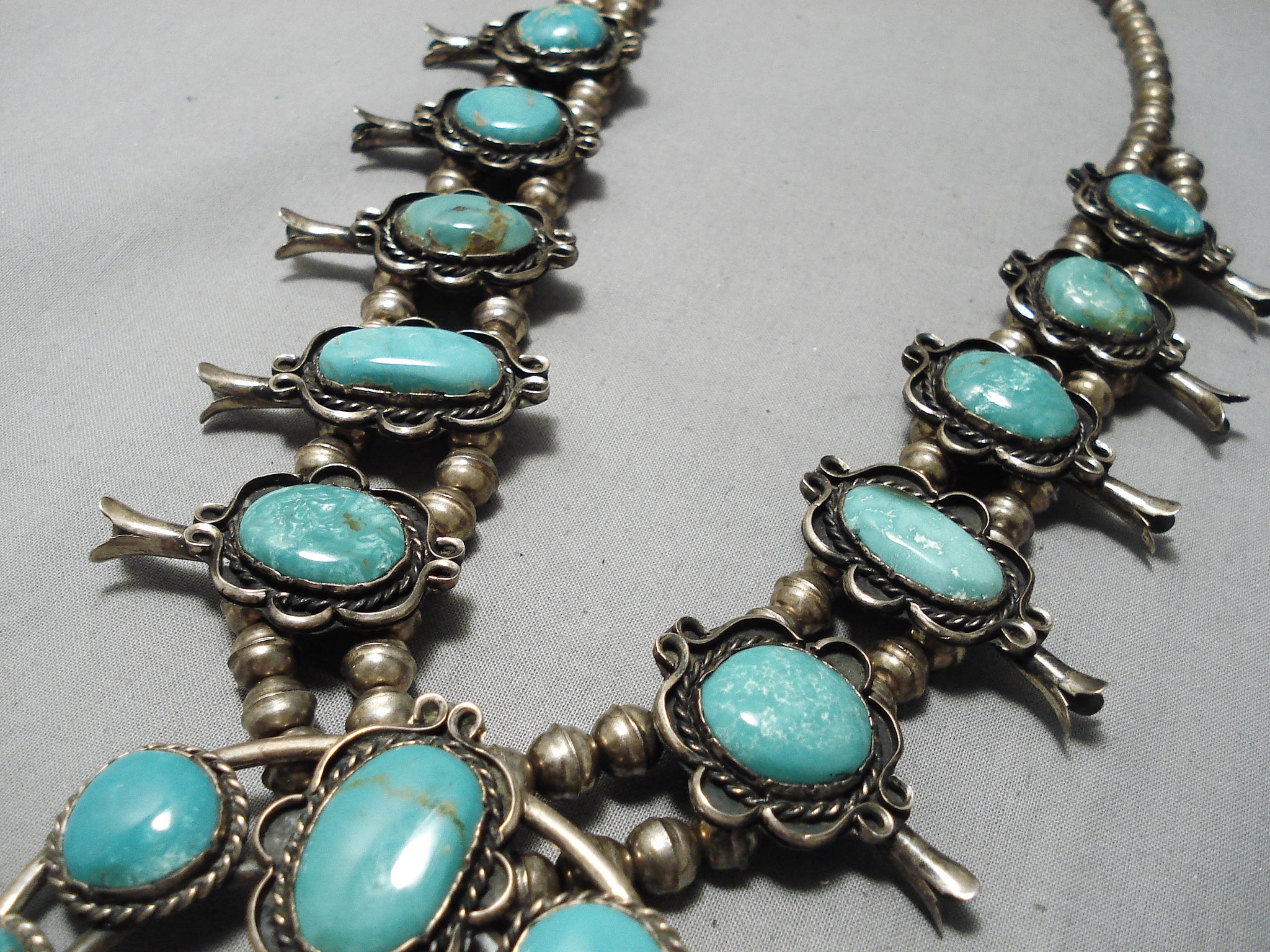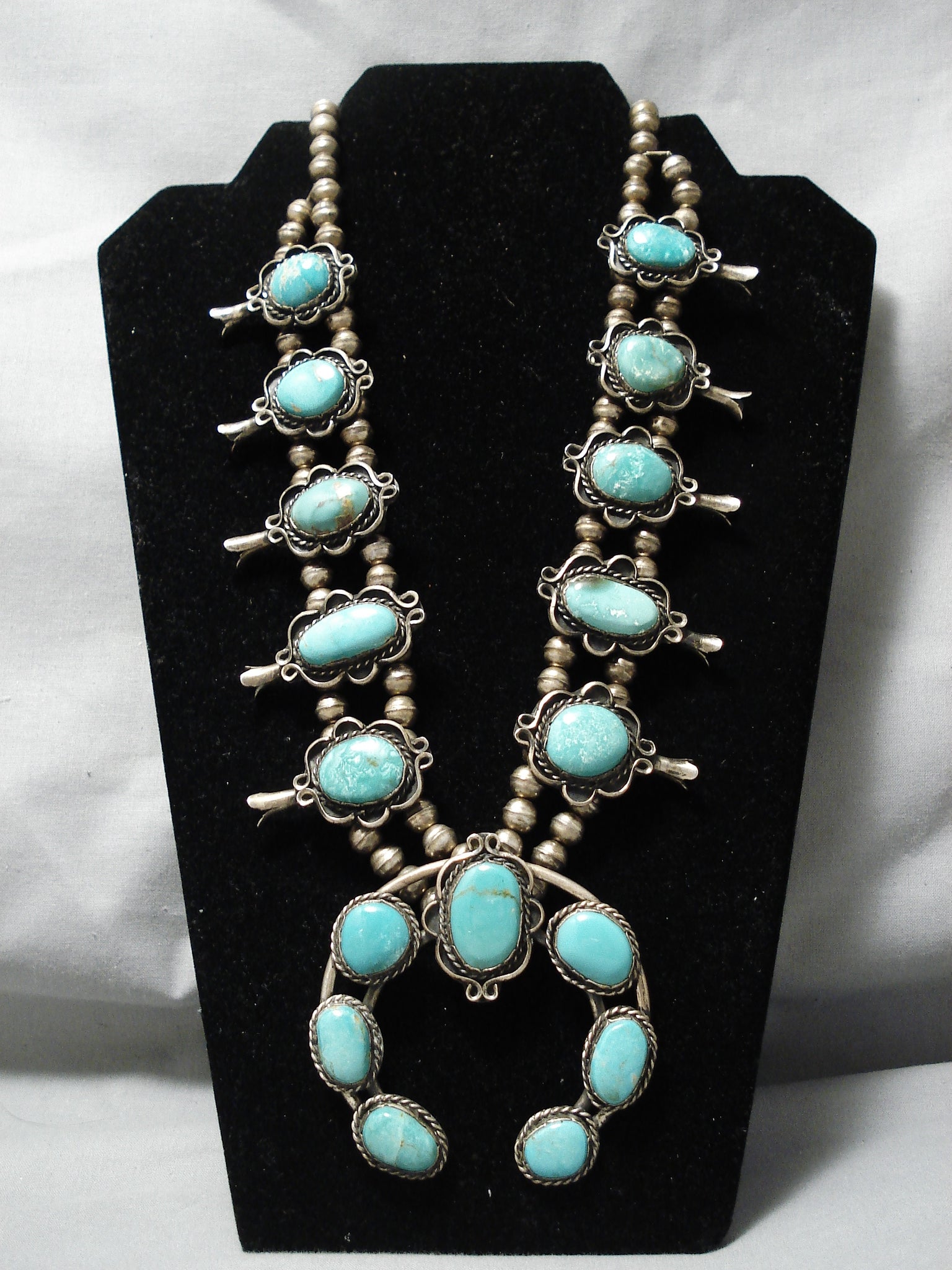 Authentic Vintage Native American Navajo Domed Turquoise Sterling Silver Squash Blossom Necklace