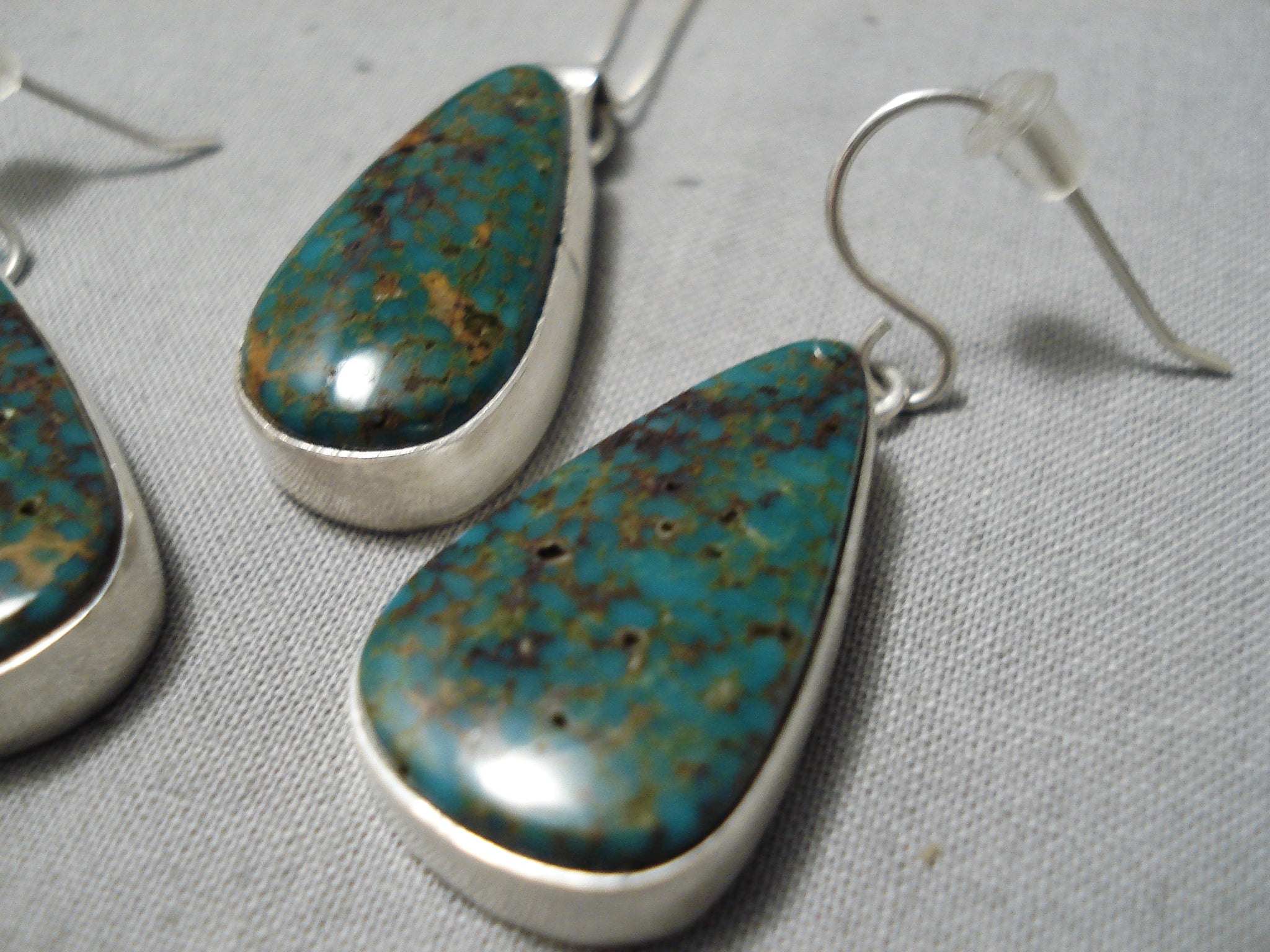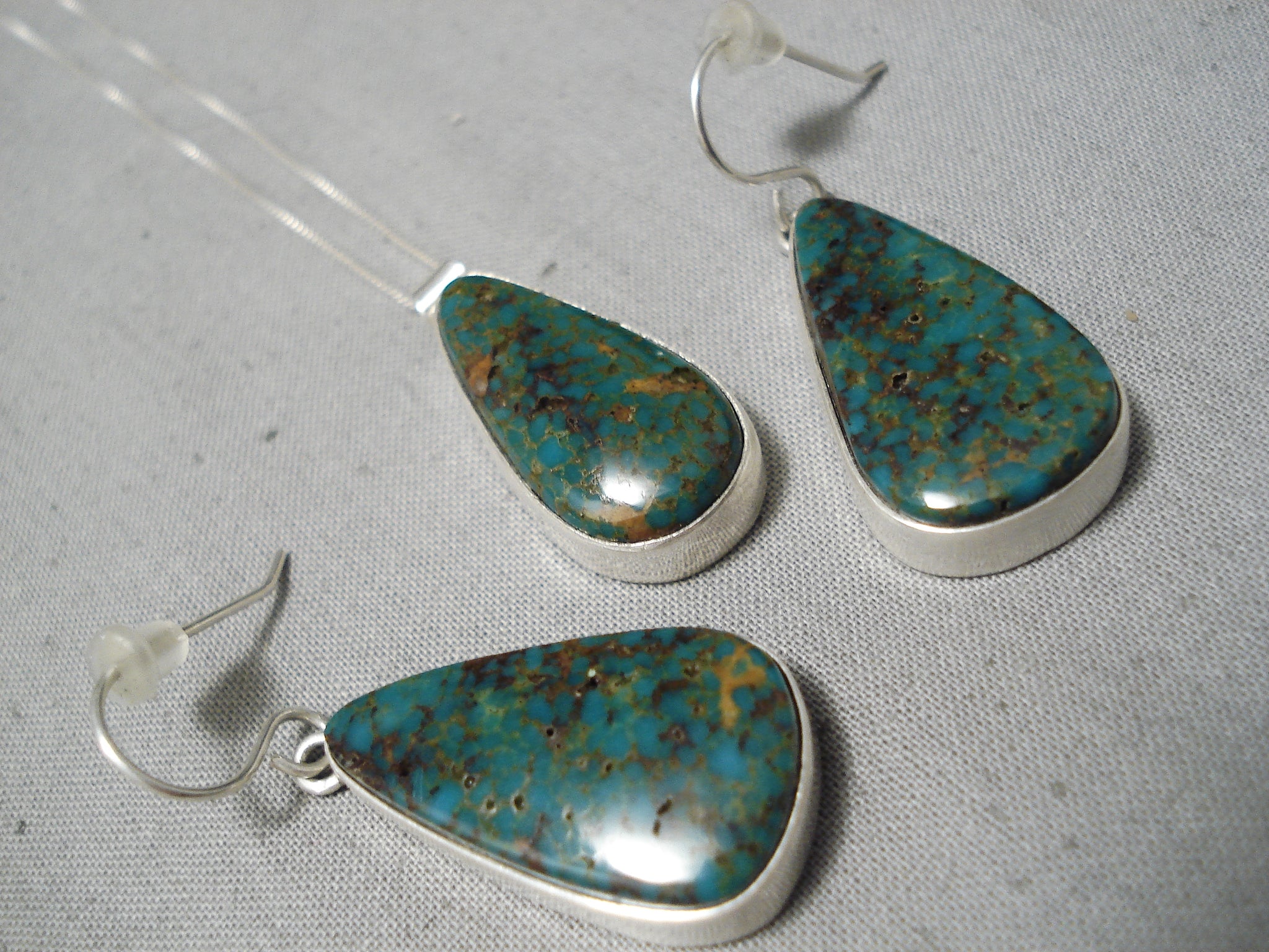 We are proud to offer this beautiful vintage Navajo silver necklace and earring set. What a beautiful deep green teardrop shape turquoise necklace and earring set we have here! The 1-1/4” x ½” turquoise pendant comes with its sweet 18” silver box chain. And the stones of the pierced wire earrings are slightly larger, creating earrings that measure about 1-3/4” x 5/8” from top to bottom. Sterling silver, marked. Signed by Navajo artist, H. Smith. Sturdy 18 grams.
