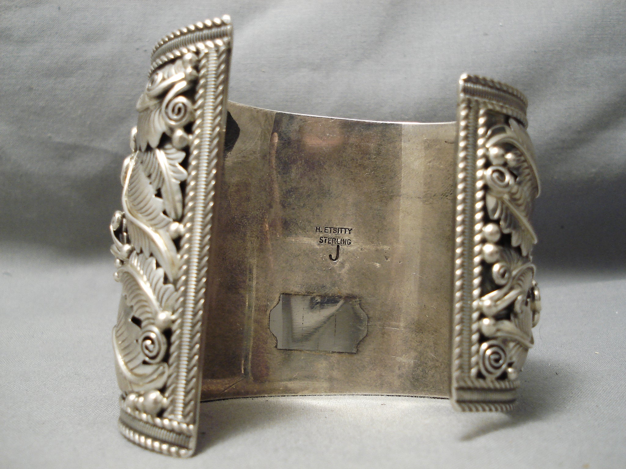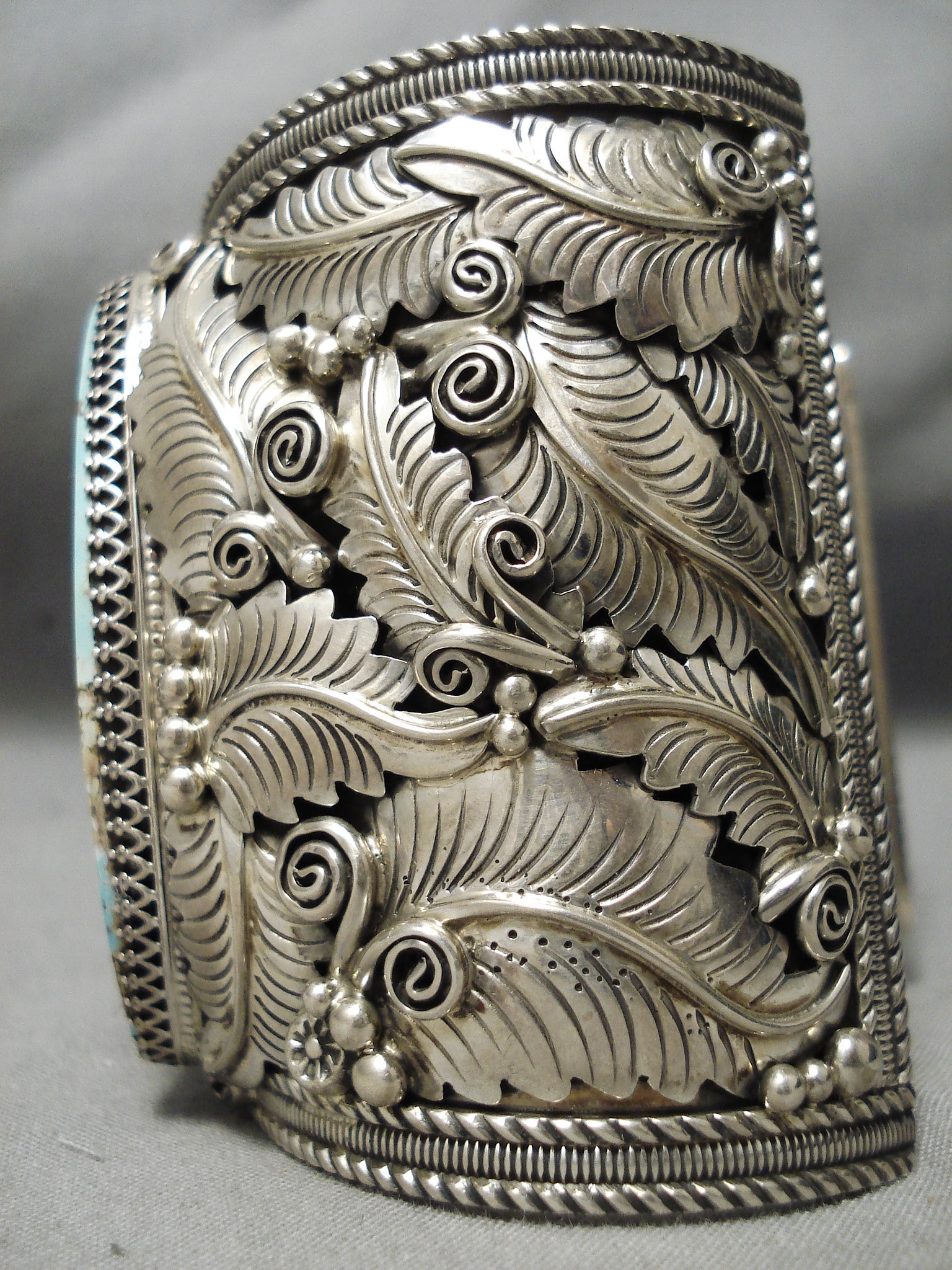 This is a tremendous vintage Navajo gigantic three stone silver bracelet. This bracelet consists of three large Number 8 turquoise stones being the biggest and best Number 8 turquoise piece we have recently collected. The turquoise stones beautifull graduate in size. Check out how the cuff wonderfully graduates in size from one end to the other with the widest part of the cuff measuring around 2-3/4". The bezels that surround each of the stones are phenomenal crown patterns. Just look at how many hand carved silver leaves this bracelet consists of, a mind blowing amount. Situated throughout the leaves are incredible silver stems, raindrops and shells. This is definitely an incredibly heavy and sturdy top notch bracelet. The largest stone measures around 2-1/8" x 7/8". The width of the bracelet measures around 2-3/8". Signed by Navajo artist, H. Etsitty. Sterling silver, marked. Cir. 1970's+. The inside end to end measures around 5-3/4" with an additional 1-1/4" gap. Sturdy 180 grams.