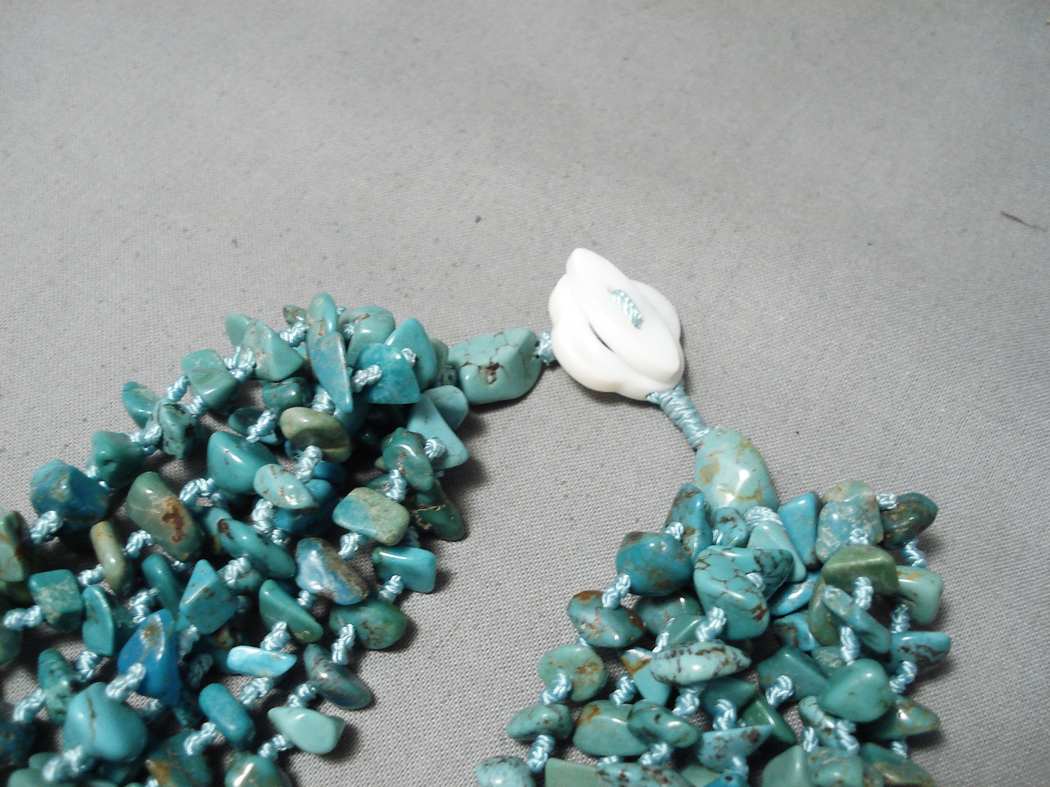 Here we have an exquisite vintage Navajo necklace. This is an absolutely stunning 8-strand layered choker-style necklace of mega amounts of vibrant turquoise stones! And the necklace has a really unique ¾” white shell toggle clasp! The largest stone near the clasp is about ½” x 3/8”. The length of the necklace measures around 24". Sturdy 177 grams.