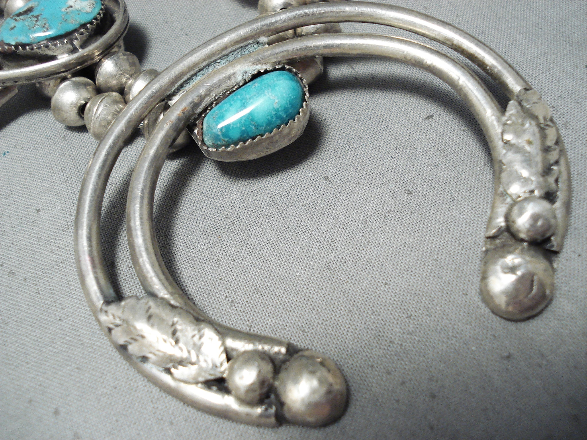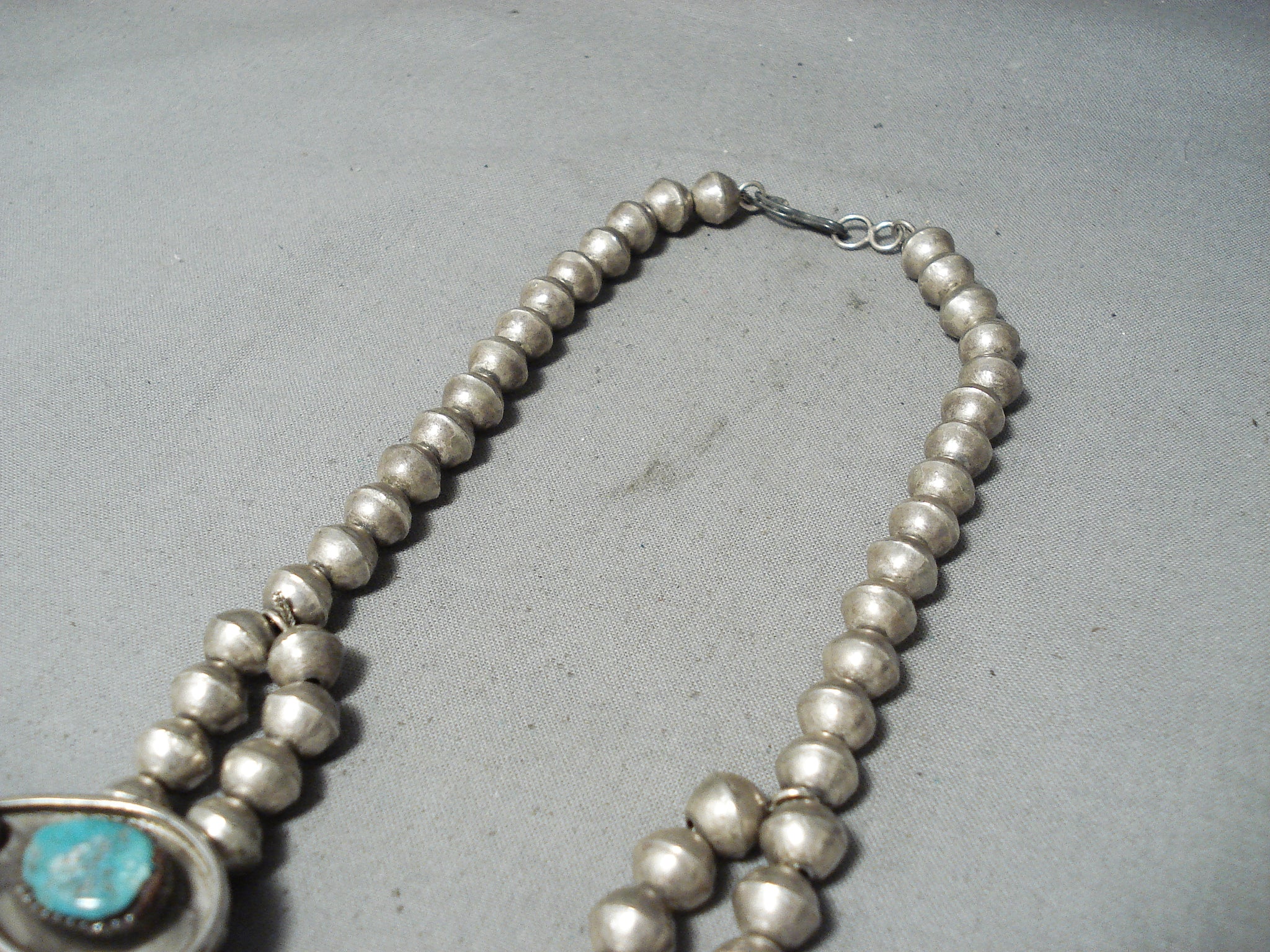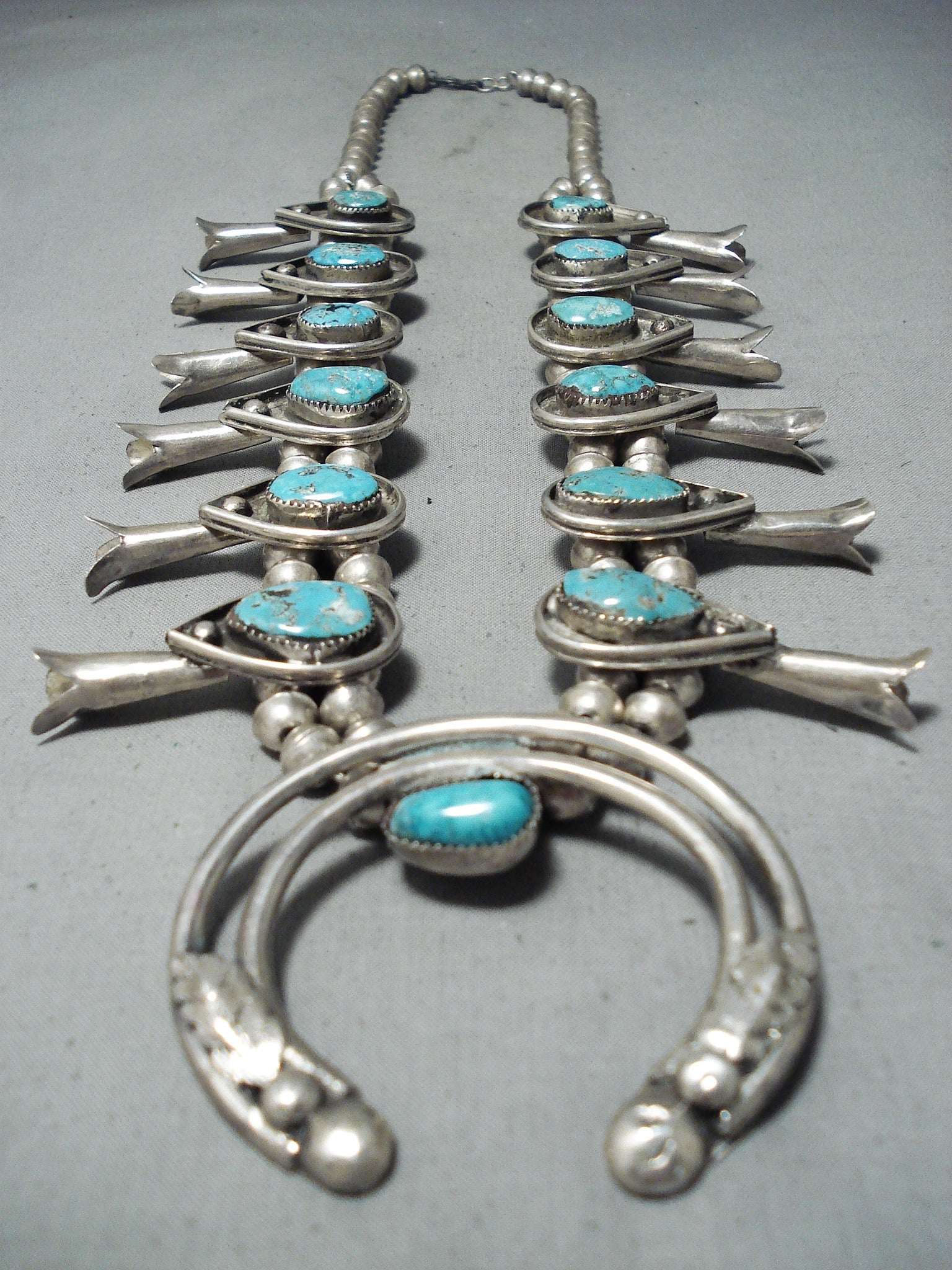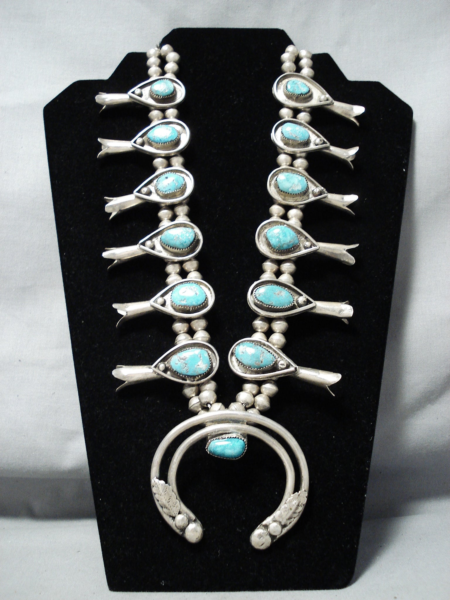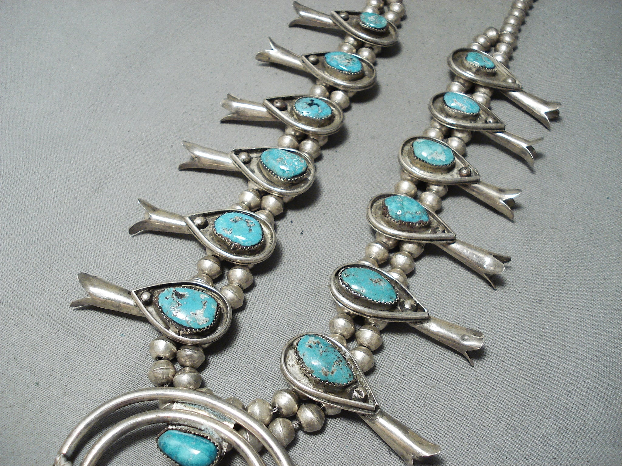 Carico Lake Vintage Native American Navajo Turquoise Sterling Silver Squash Blossom Necklace