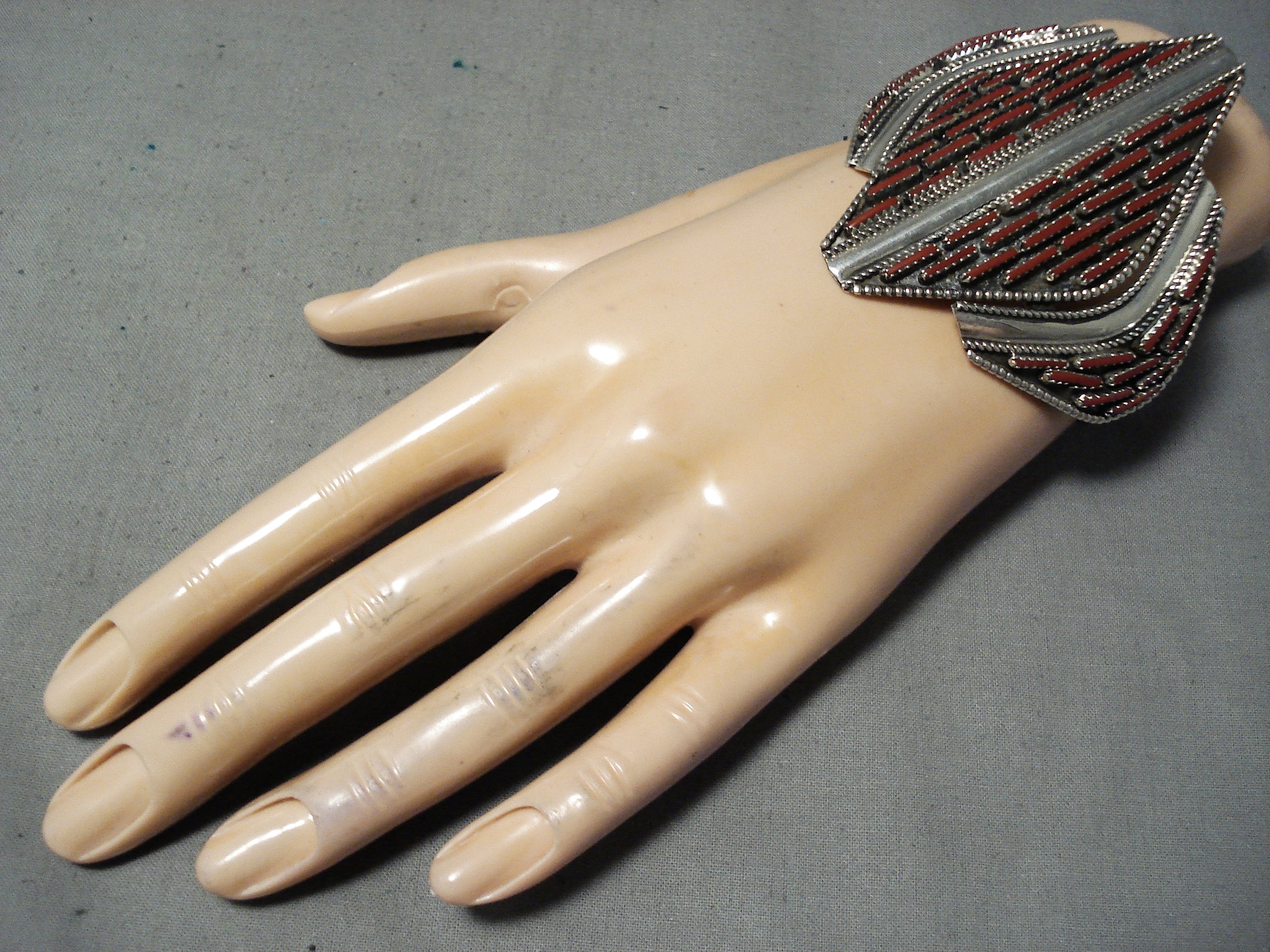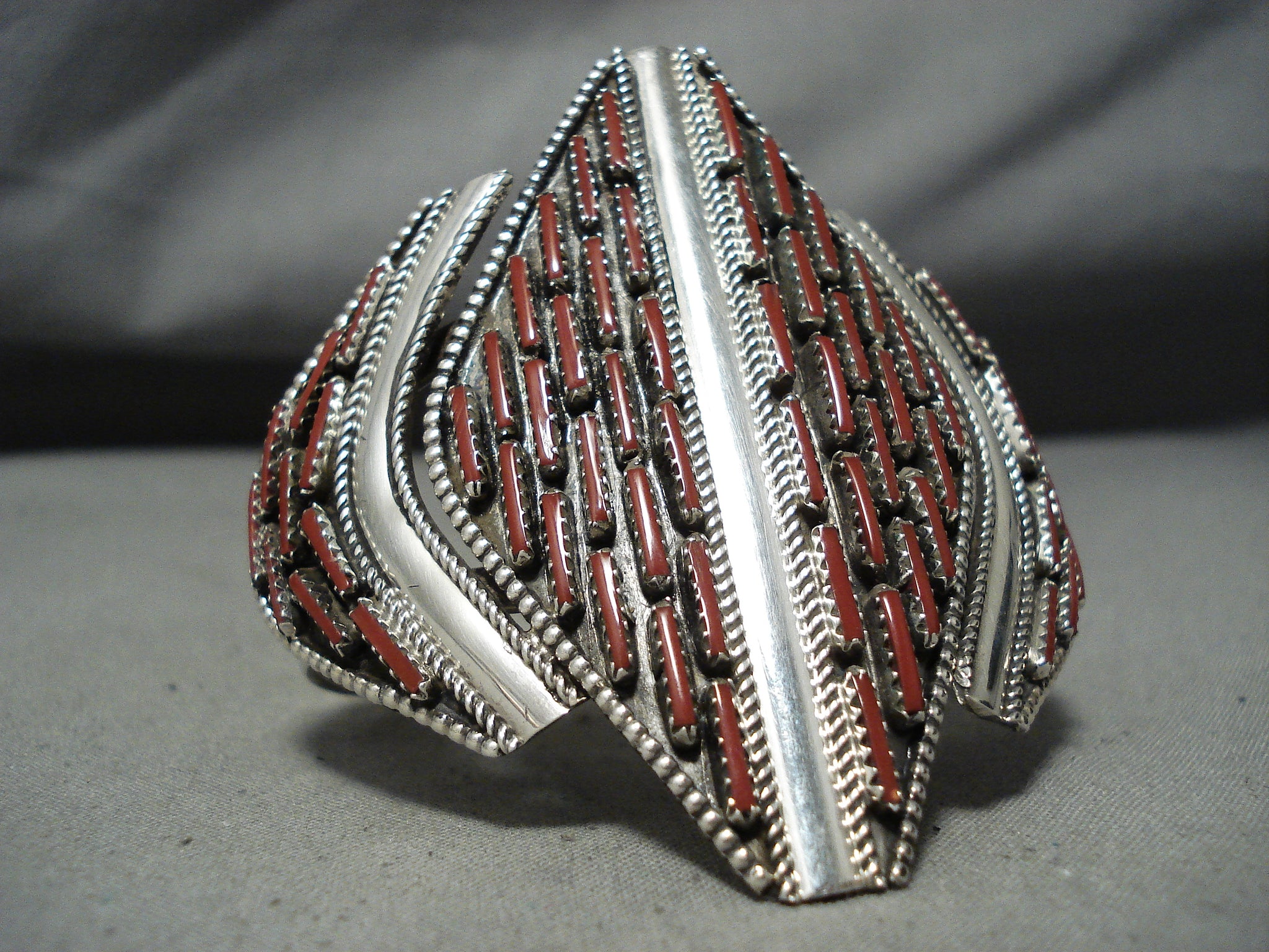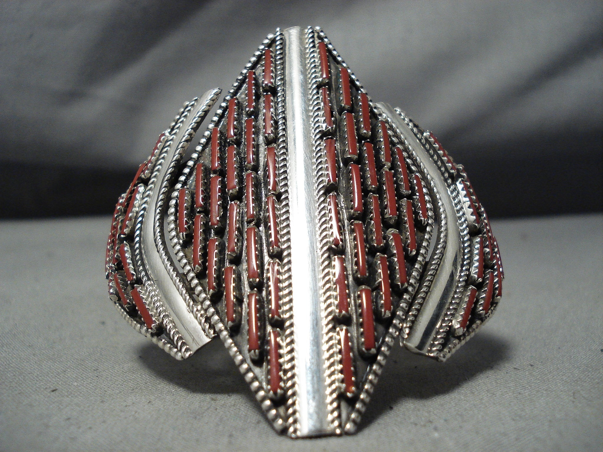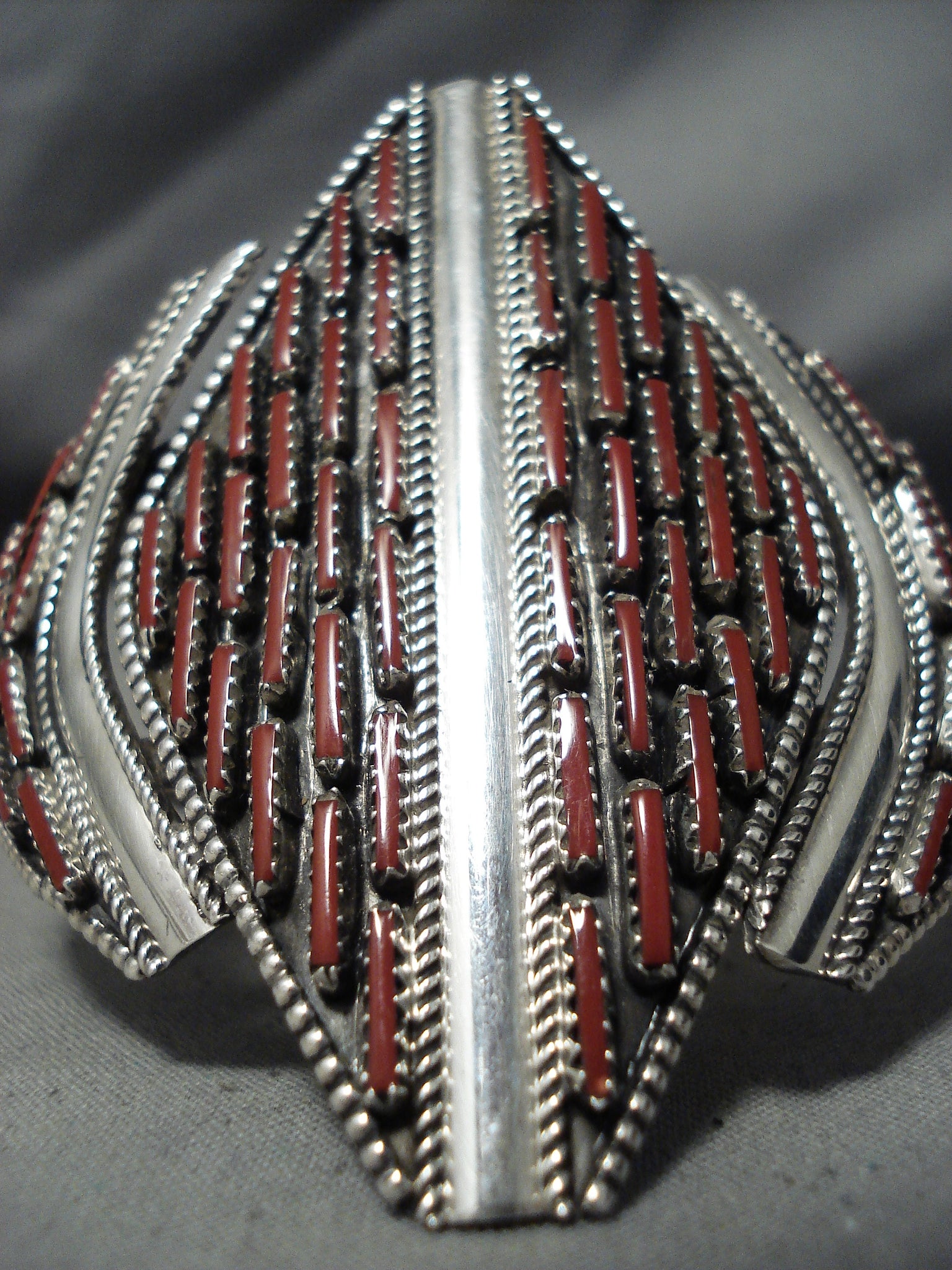 This is an impressive vintage Navajo coral silver bracelet. This remarkable piece contains a phenomenal plethora of needlepoint coral stones that are placed in a unique formation. Surrounding the sections of corals are beautiful silver ropes and raindrops with thick accenting long silver patterns. This bracelet contains a wonderful double silver shank cuff. The height at the center of the bracelet measures around 2-3/4" while the width at the center of the double silver shank cuff measures around 1-1/8". Signed by Navajo artist, Cel Yazzie . Sterling silver, marked. Cir. 1970's+. The inside end to end measures around 5-1/2" with an additional 1" gap. Sturdy 46 grams.