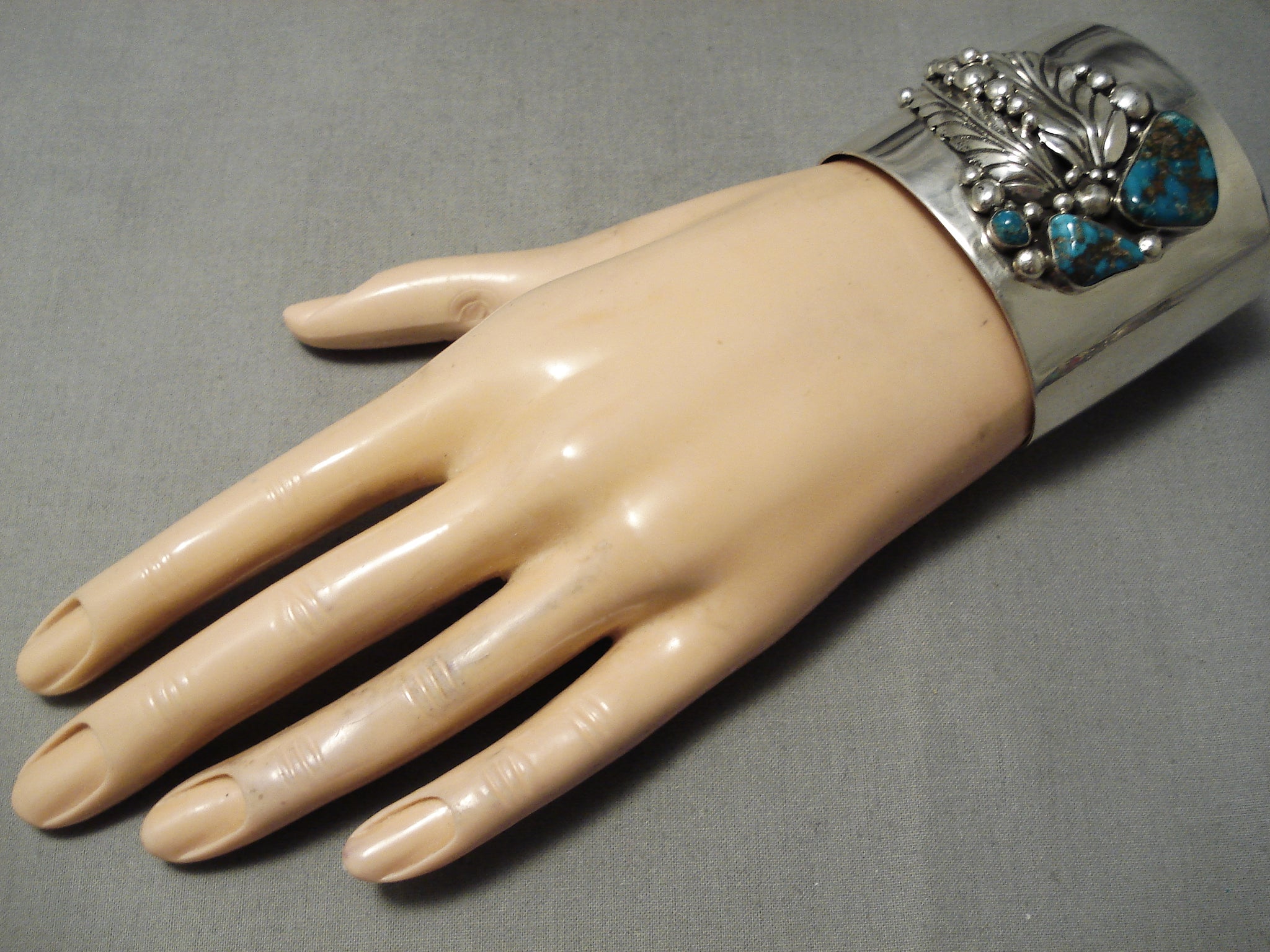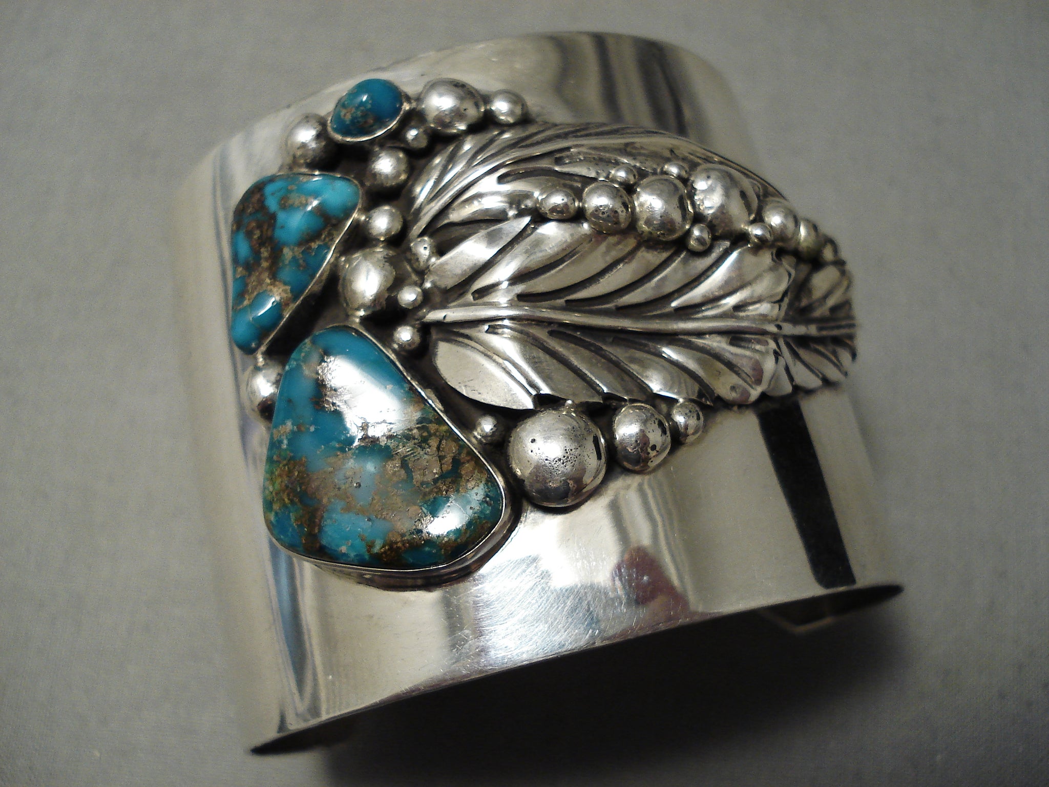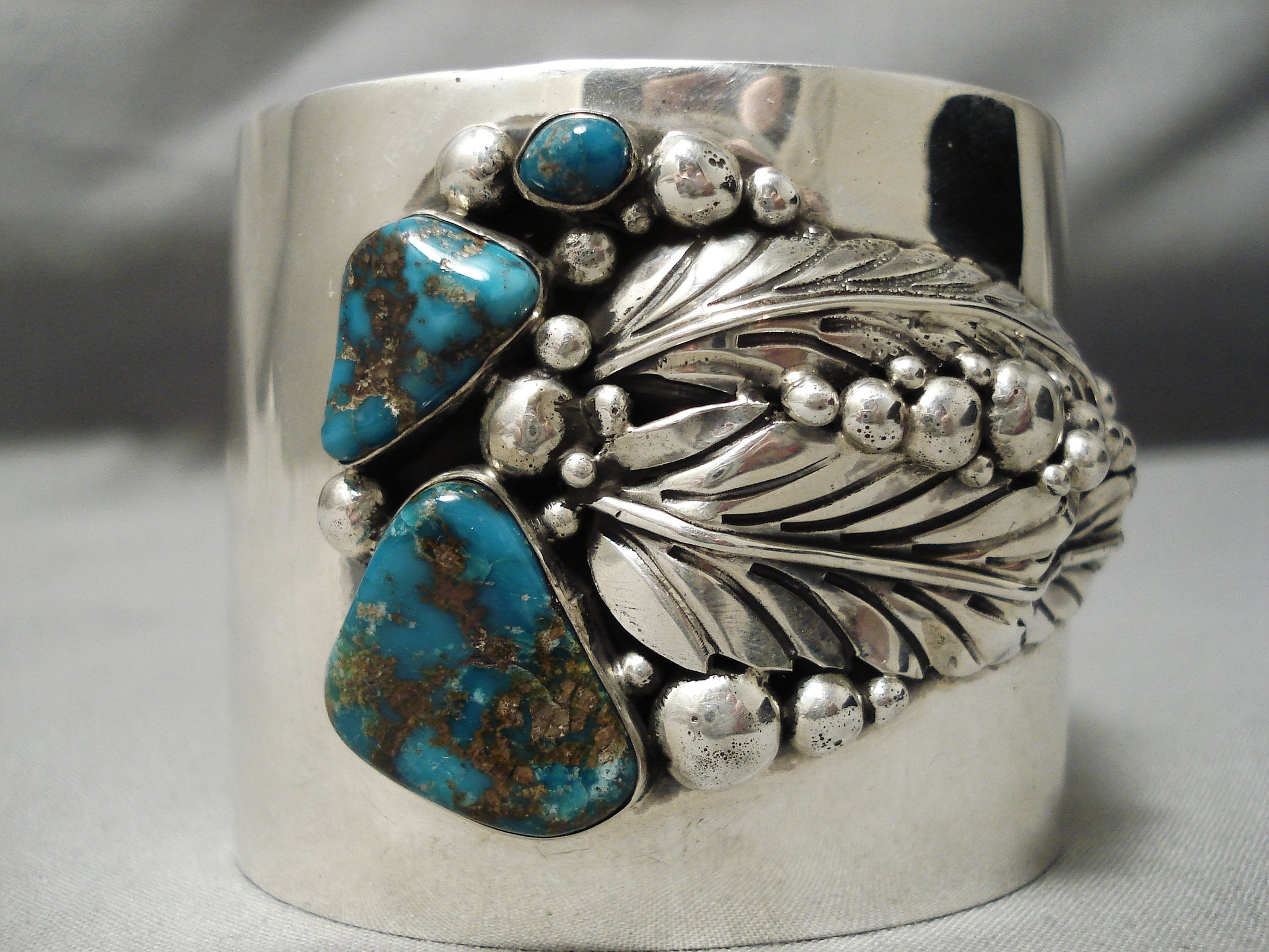 This is an impressive vintage Navajo very wide three stone silver bracelet. This amazing piece contains three extremely rare turquoise stones that appear to be from the old Blue Thunder turquoise mine. Accenting the stones are large and superior silver works that include graduating raindrops and a large hand carved silver leaf. The largest stone measures around 3/4" x 5/8". The width of the bracelet measures around 2". Signed by Navajo artist, DA. Sterling silver, marked. Cir. 1970's+. The inside end to end measures around 5-1/4" with an additional 1" gap. Sturdy 77 grams.