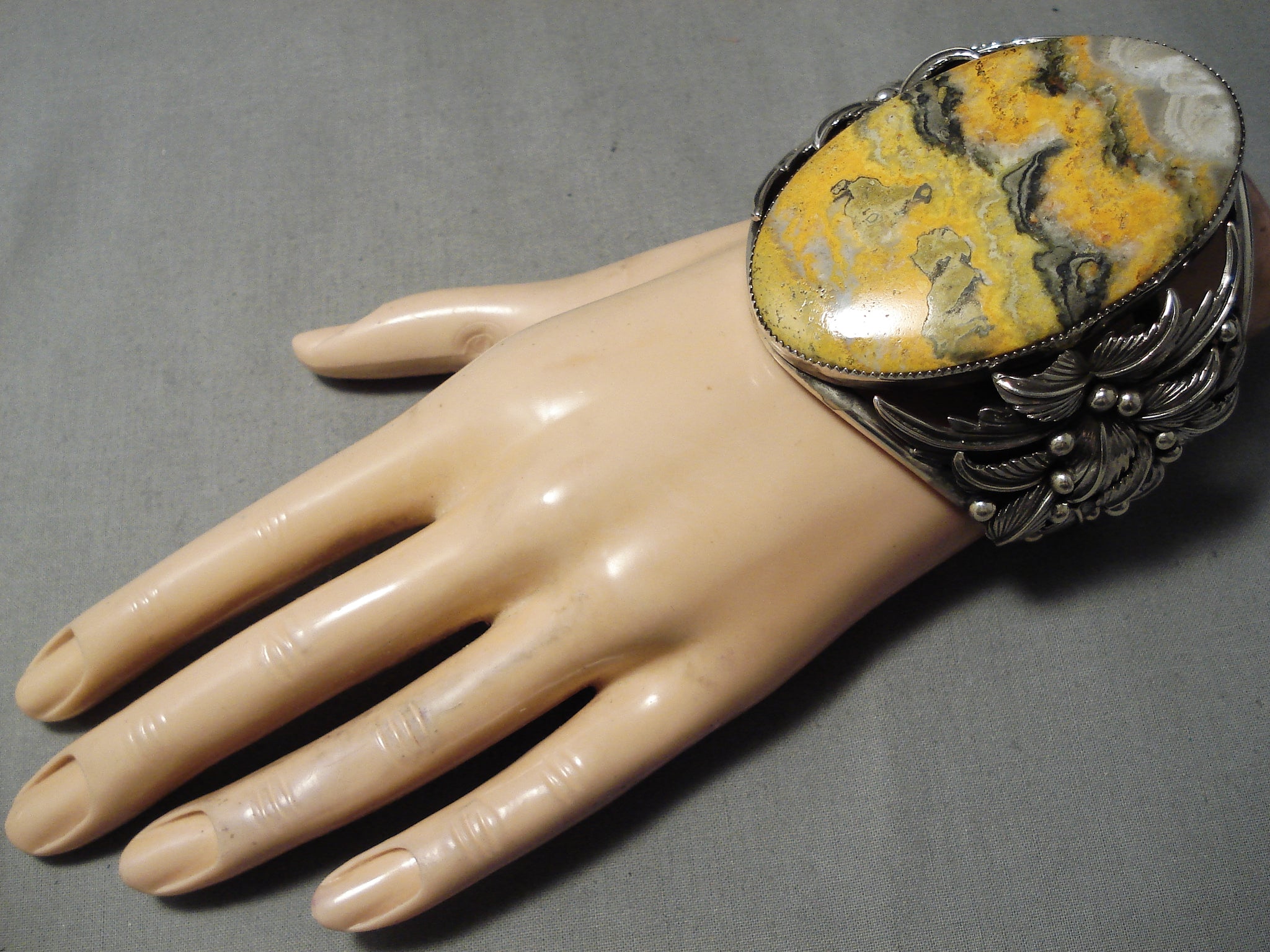 Colossal Bumble Bee Stone Native American Navajo Sterling Silver Leaves Bracelet Cuff