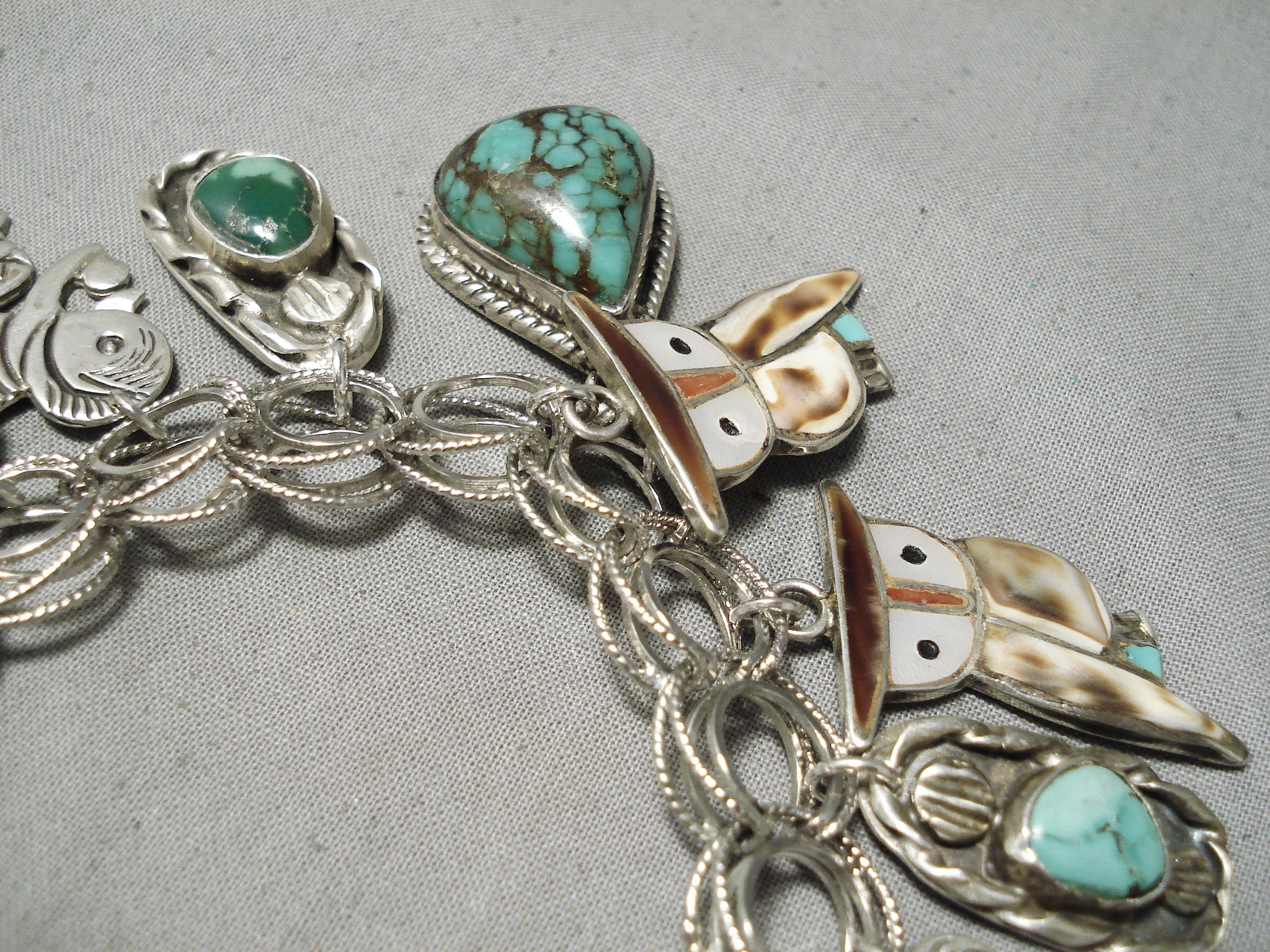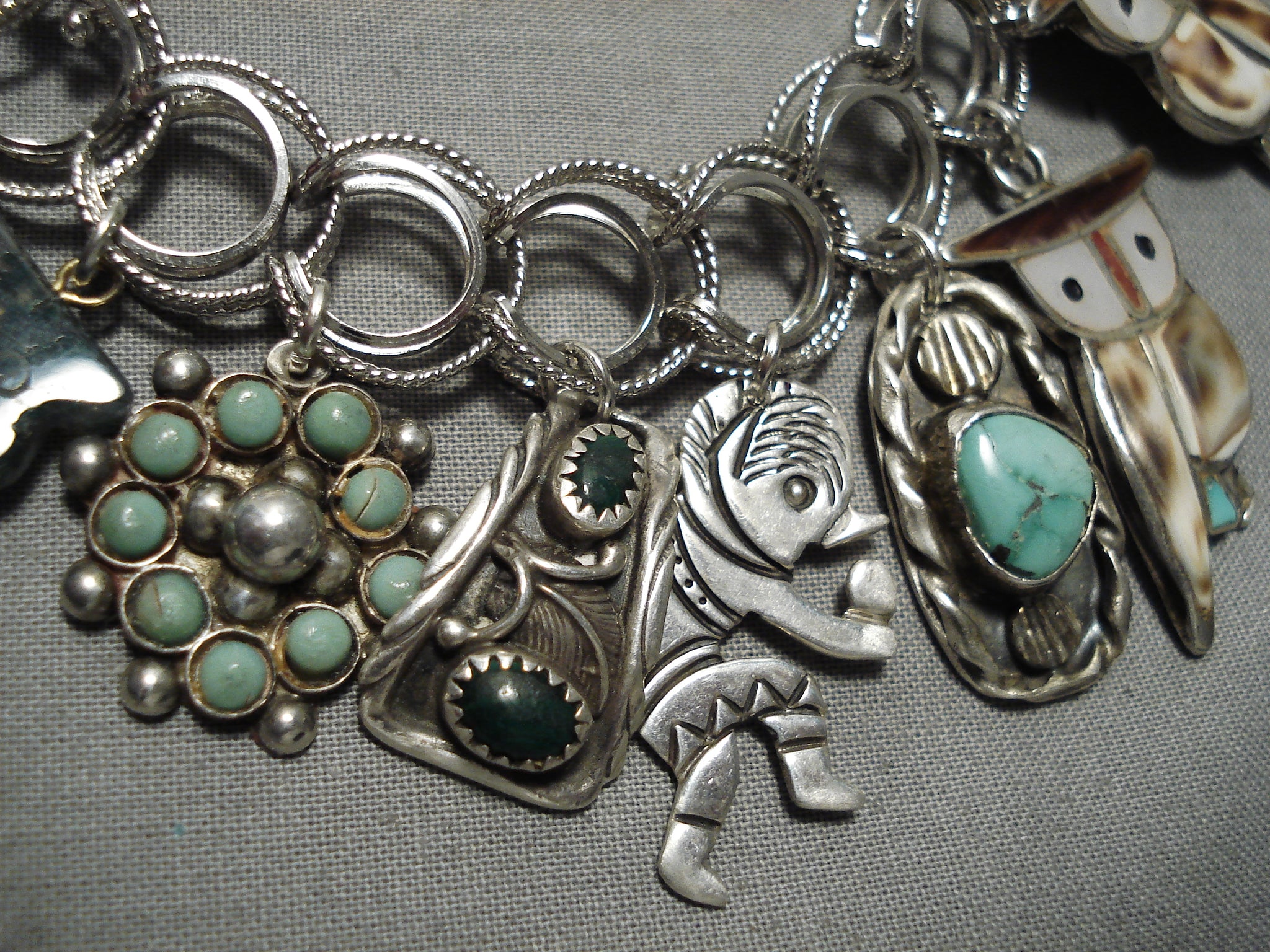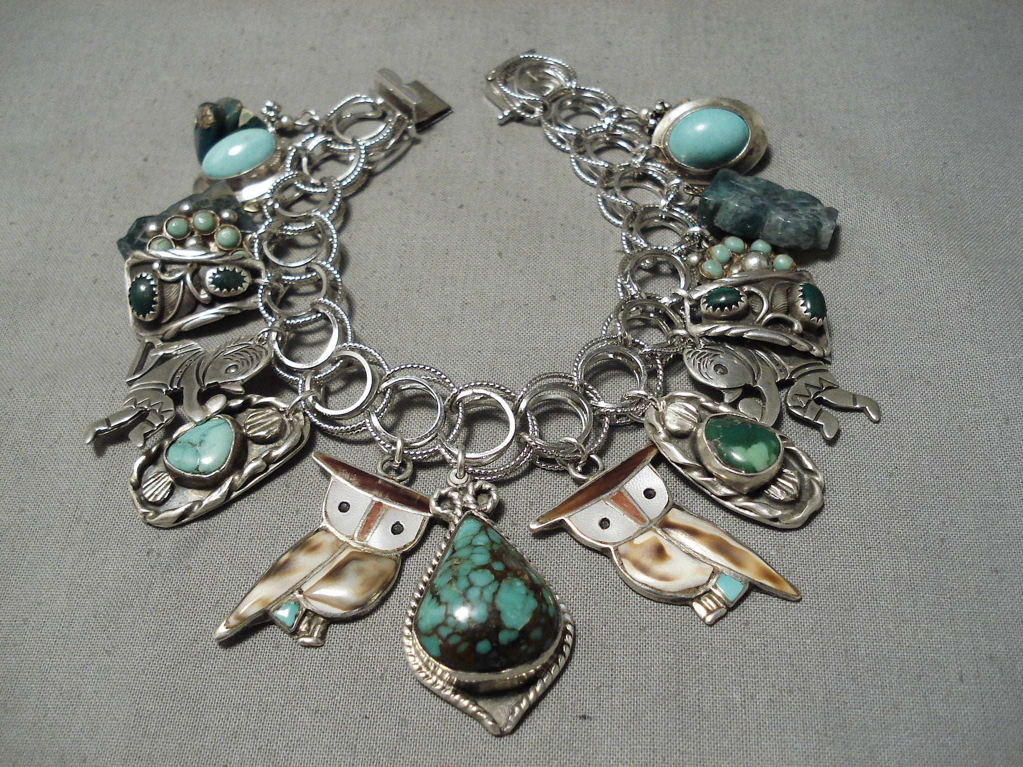 This is an astonishing vintage Zuni/ Navajo silver charm bracelet. This piece contains a beautiful plethora of inlaid pieces, turquoise and silver charms, and solid stones that are hand carved into owls. The bracelet consists of a total of 17 charms, WOW! This bracelet measures to be a size 8". The largest stone measures around 7/8" x 3/4". Signed by Zuni/ Navajo artist, CB. Sterling silver, marked. Cir. 1970's+. Sturdy 79 grams.