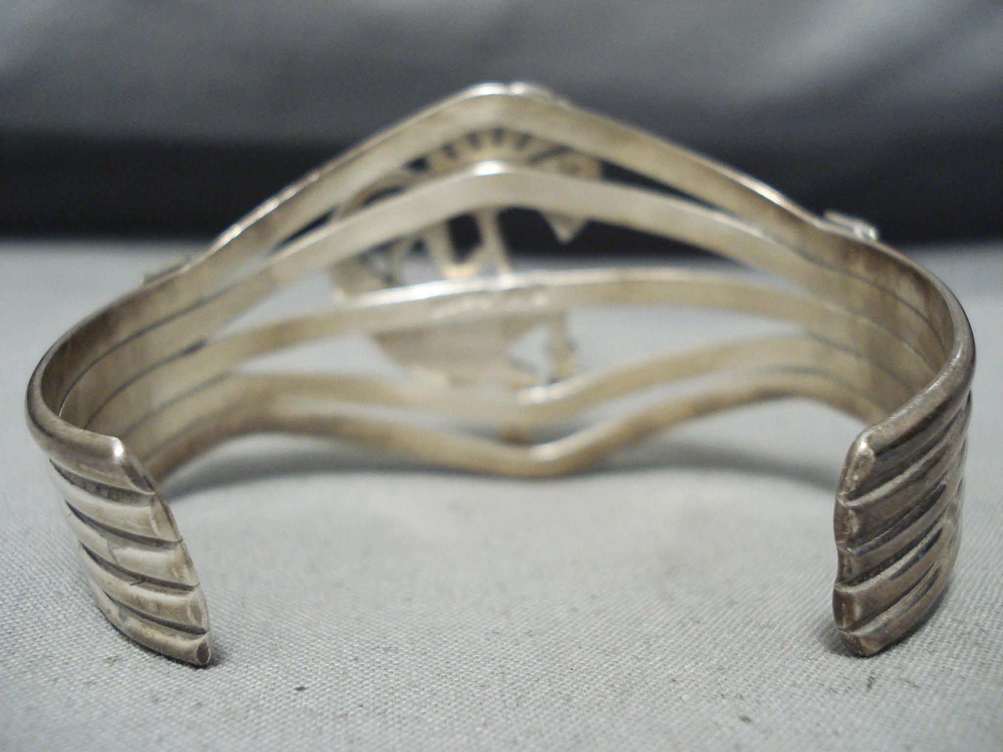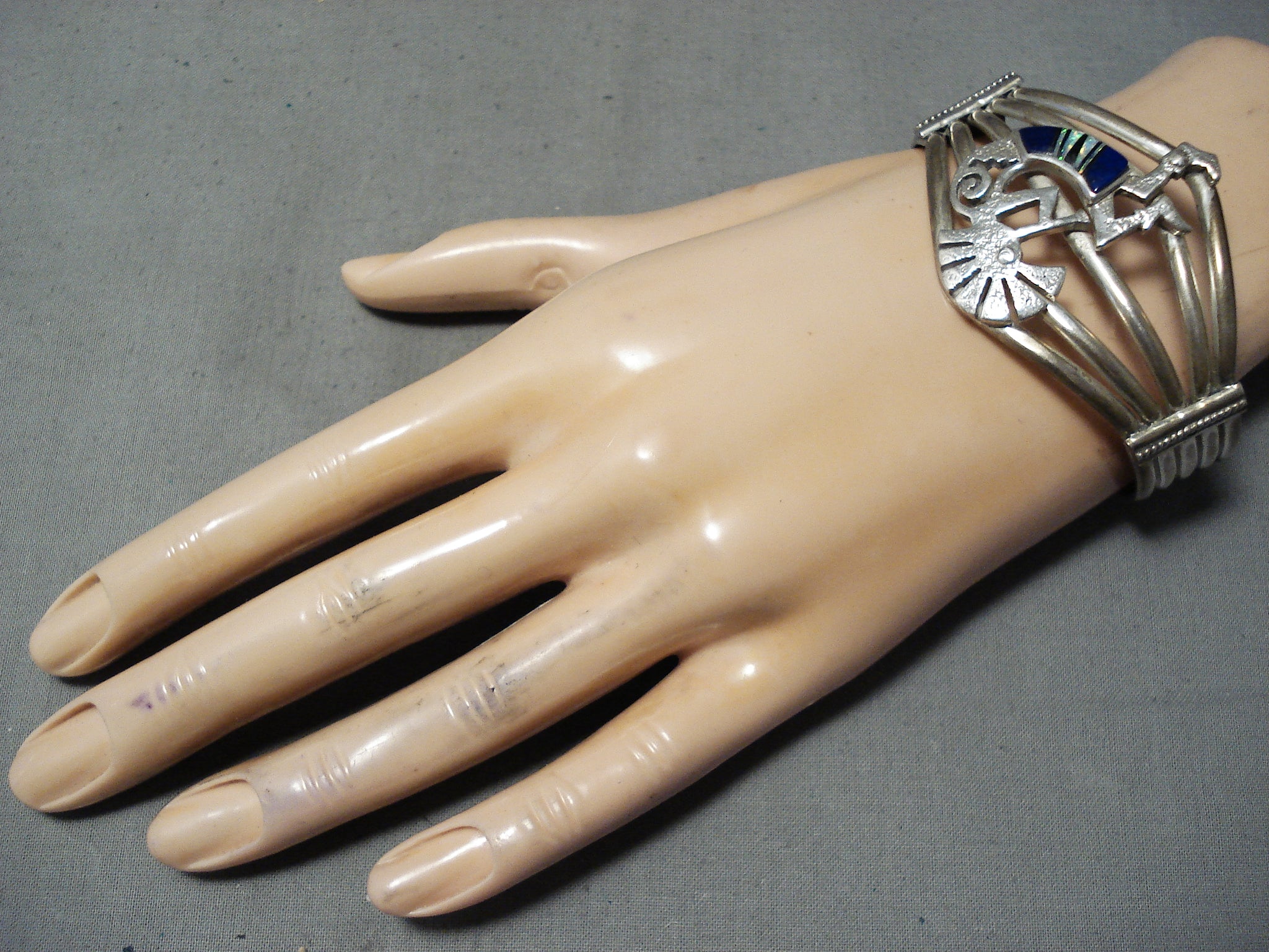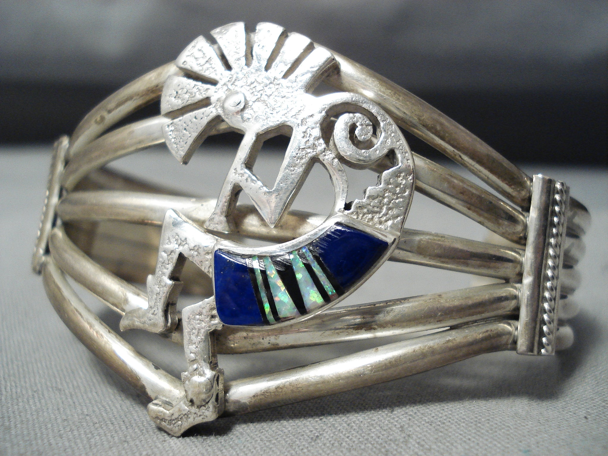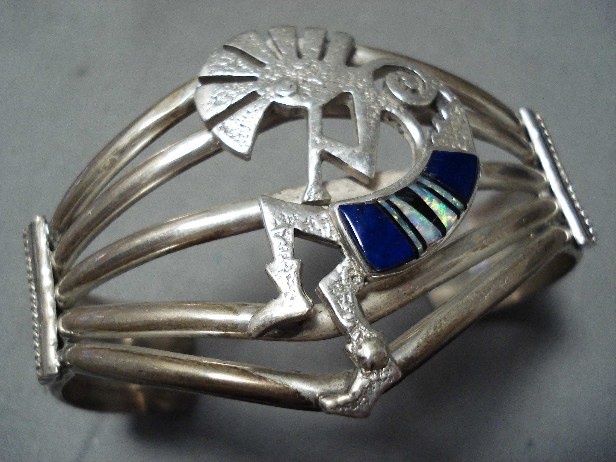 This is a breathtaking vintage Navajo inalid kokopelli silver bracelet. This remarkable piece contains a phenomenal hand carved silver kokopelli that contains incredible inlay. The inlay contains opal and lapis and the kokopelli measures around 1-5/8" X 1". This bracelet contains a wonderful five silver shank cuff with side silver flanks. The width of the bracelet measures around 1-1/2". Signed by Navajo artist, Matilda Benally . Sterling silver, marked. Cir. 1970's+. The inside end to end measures around 5-1/4" with an additional 1-1/2" gap. Sturdy 42 grams.
