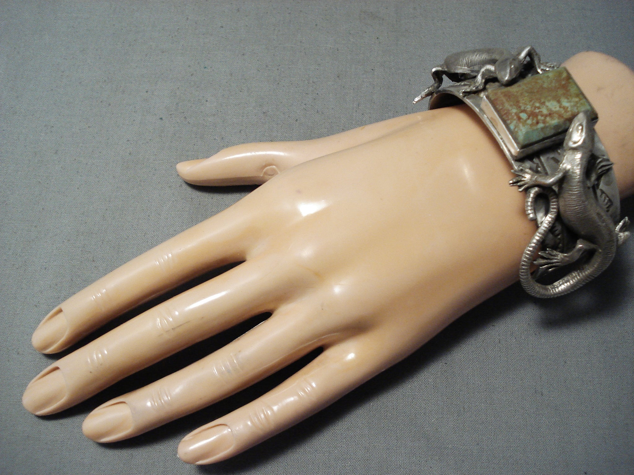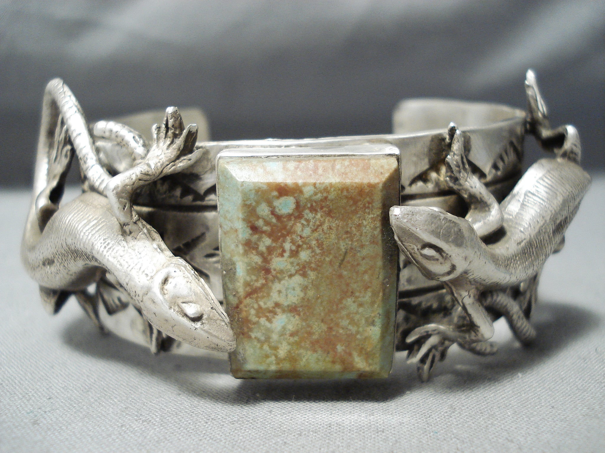 Detailed Gecko Native American Navajo Royston Turquoise Sterling Silver Gekkos Bracelet