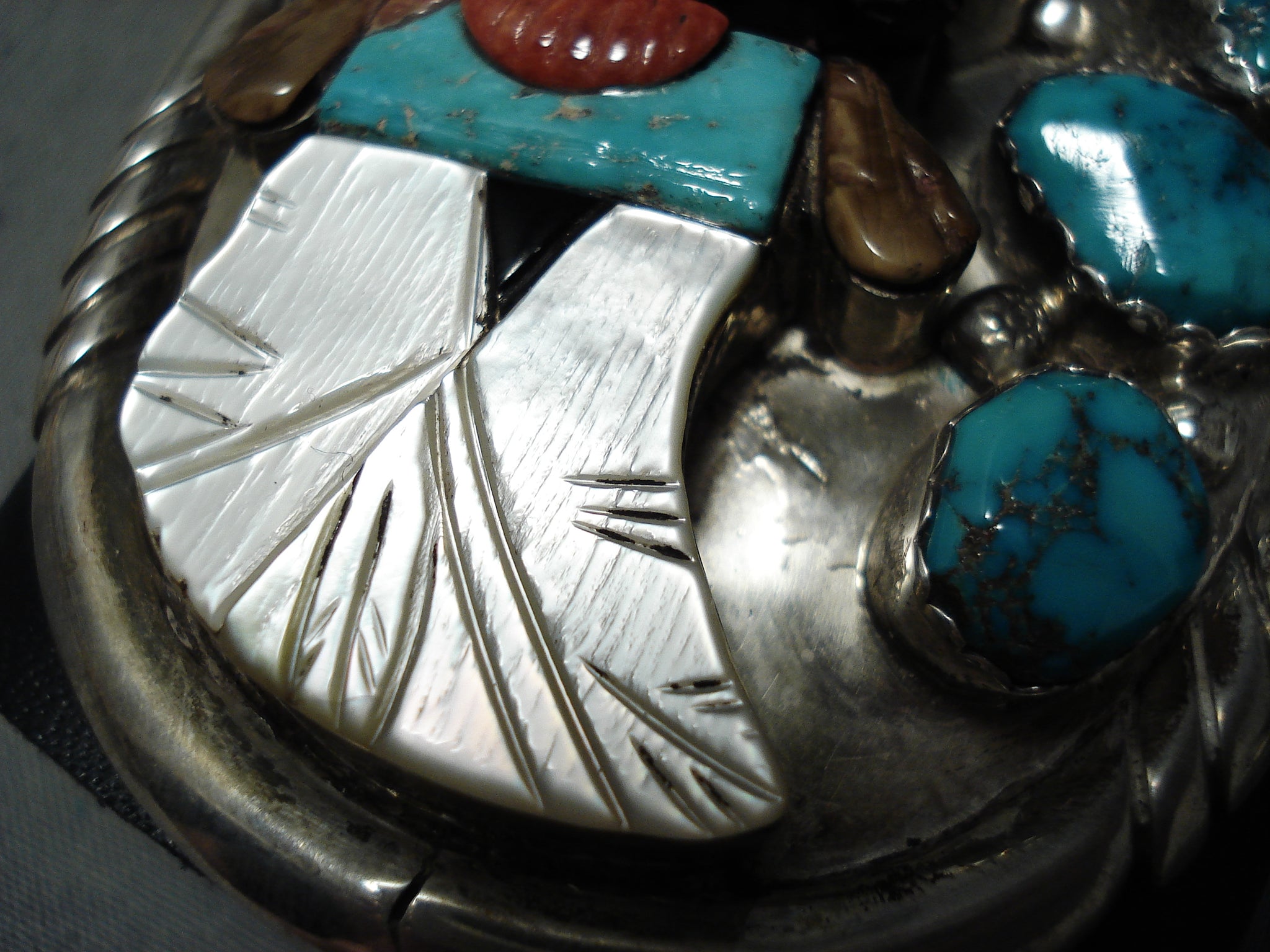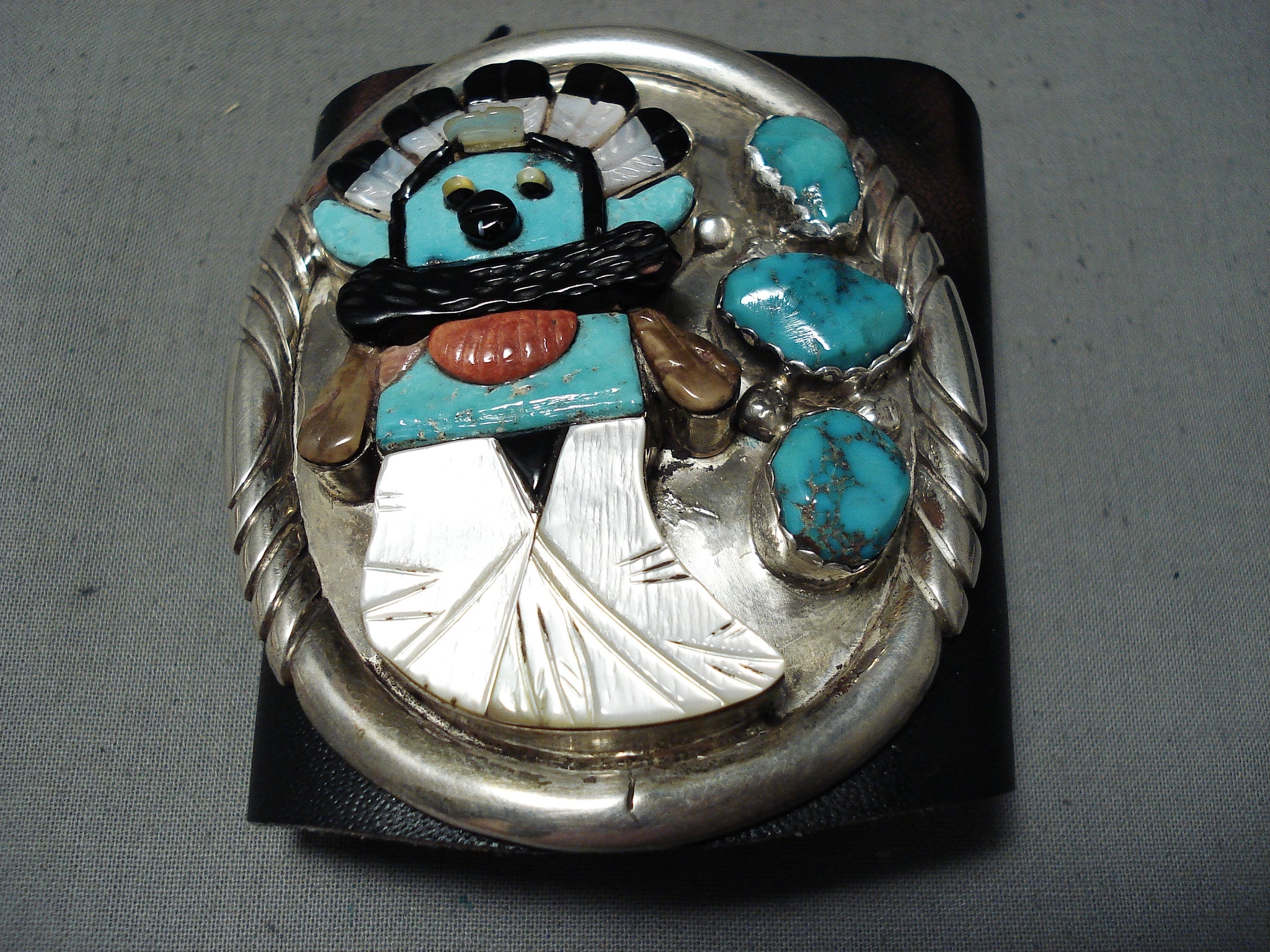 Detailed Huge Vintage Native American Navajo Turquoise Kachina Sterling Silver Ketoh Bracelet