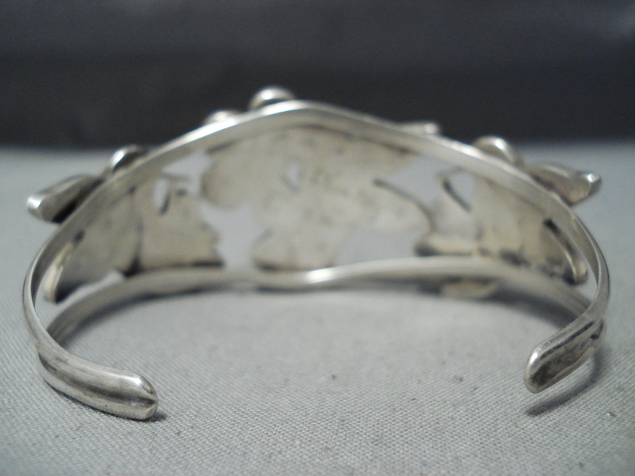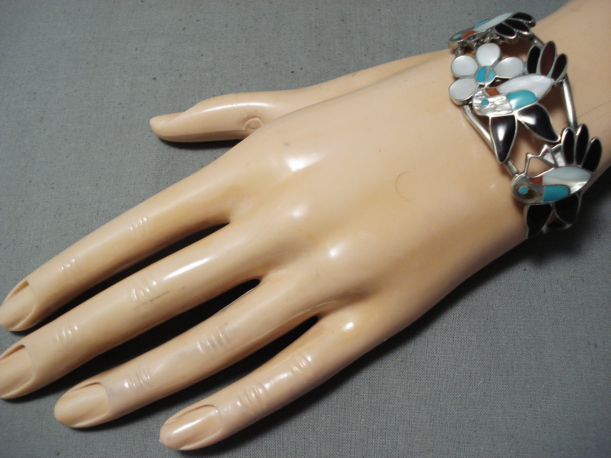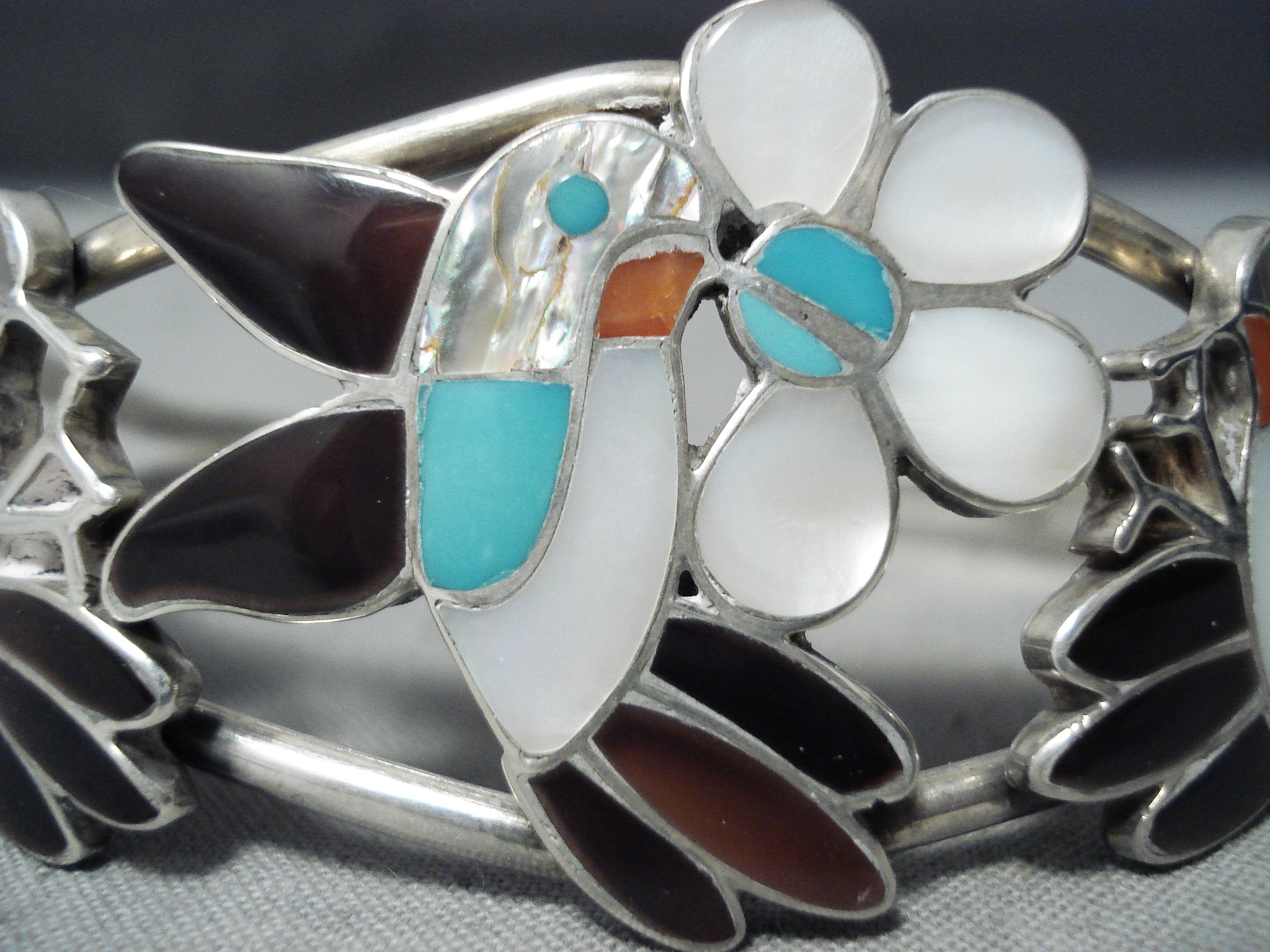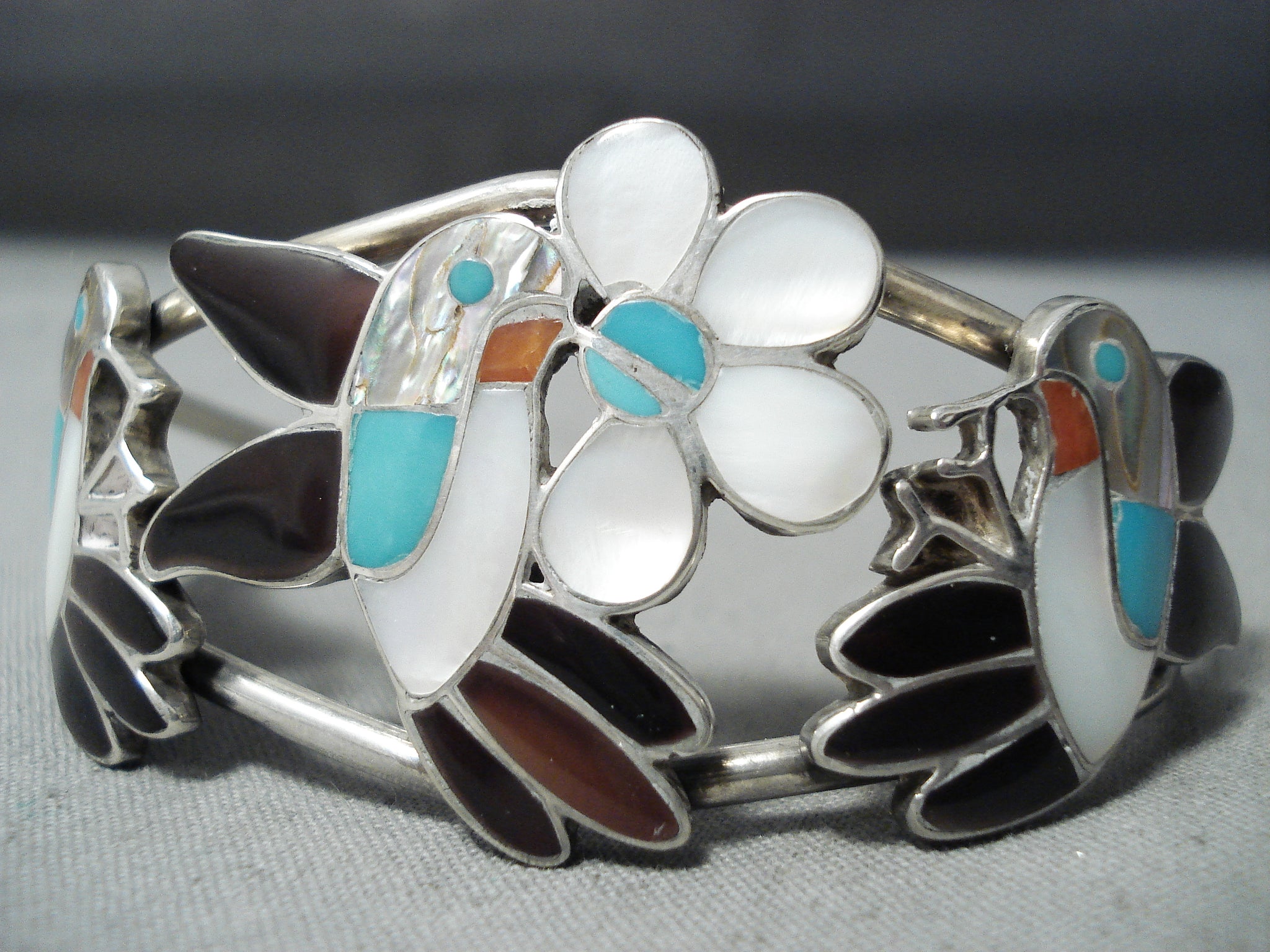 Detailed Intricate Vintage Native American Zuni Hummingbird Turquoise Sterling Silver Bracelet