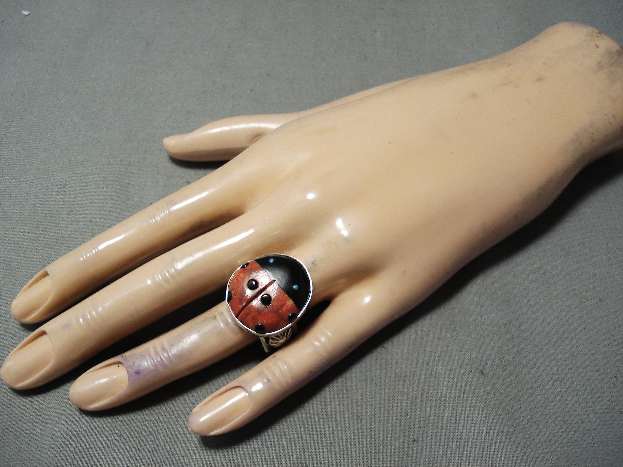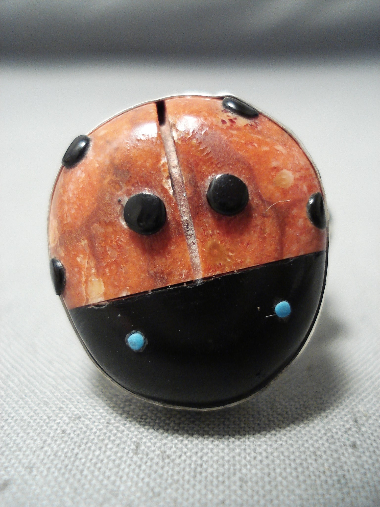 Detailed Ladybug Bulbous Native American Navajo Coral Turquoise Sterling Silver Ring