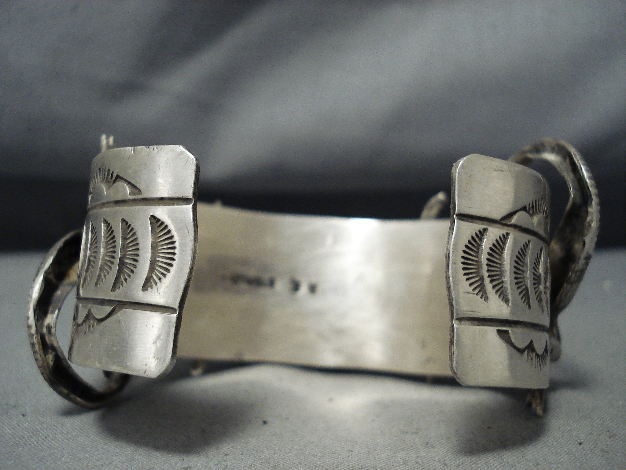 Up for sale is this marvelous Navajo silver bracelet having 2 huge intricately handcarved silver gekkos flanking a large Royston turquoise center square on a solid handcarved silver cuff with silver handstampings! Absolutely Amazing Piece! Gekkos measure about 2-1/4" x 1-3/4". The center stone measures around 1" x 3/4". The width of the bracelet measures around 1-3/4". Signed by Navajo artist, R. E. Sterling silver, marked. The inside end to end measures around 5-7/8" with an additional 1-1/8" gap. Sturdy 98 grams.