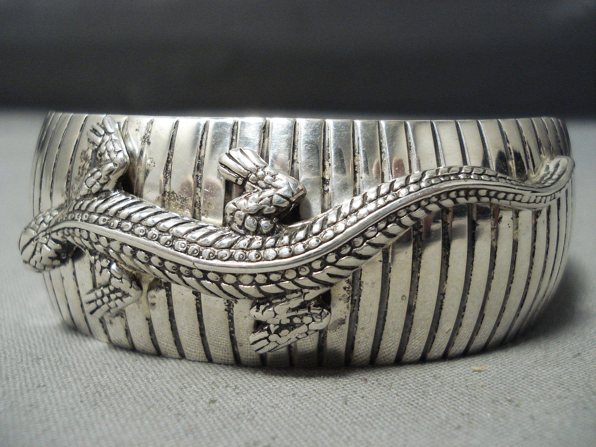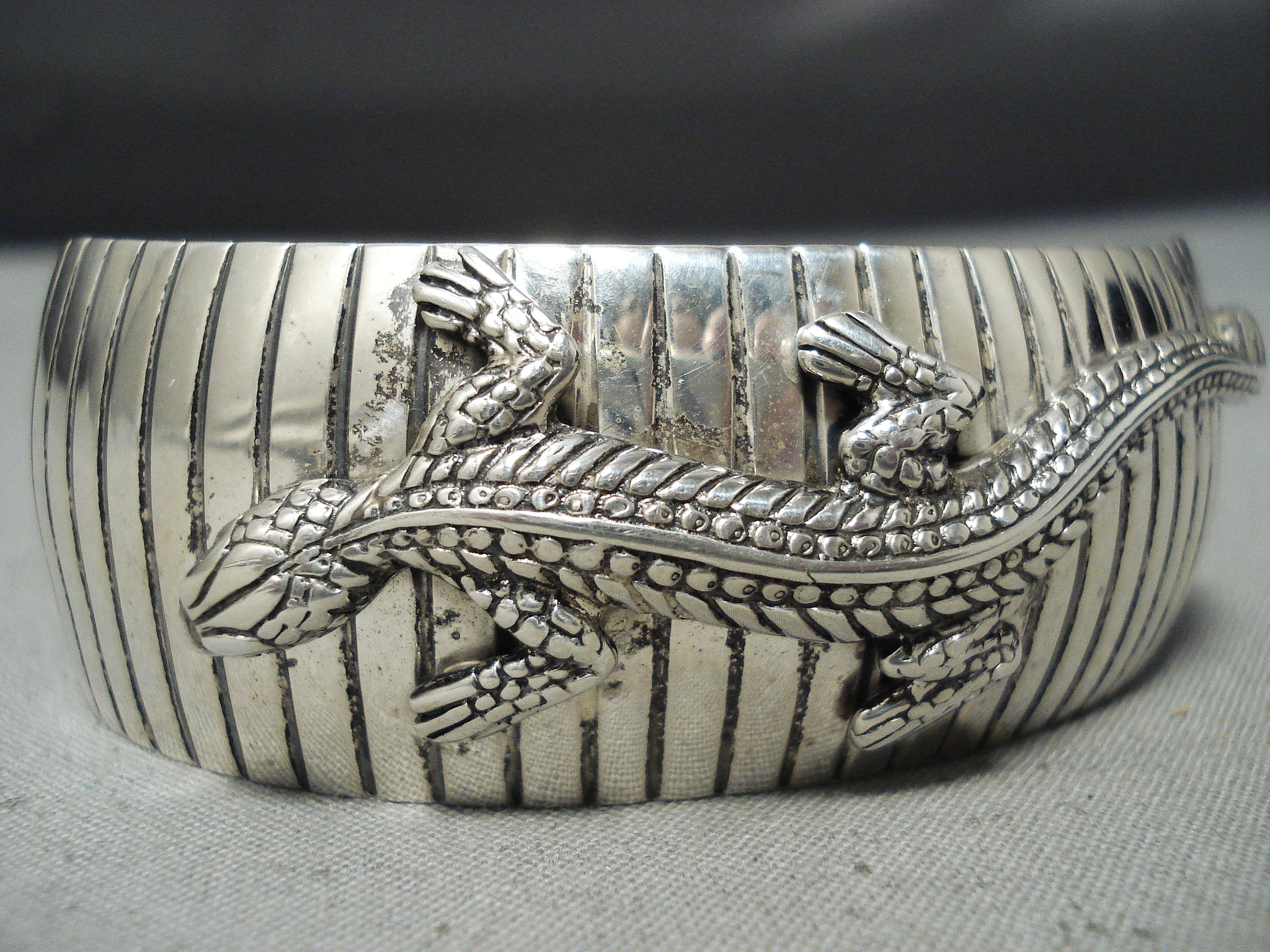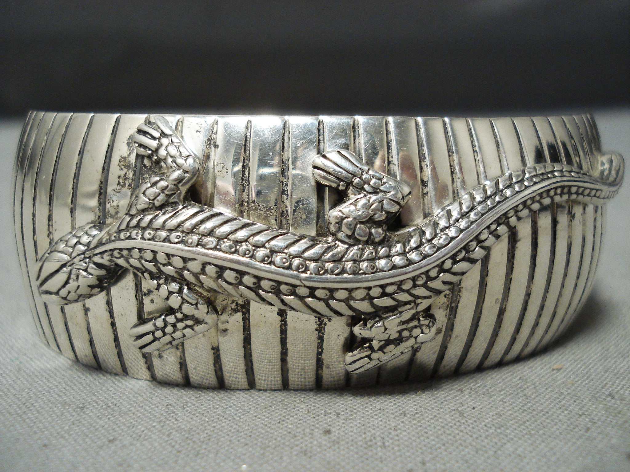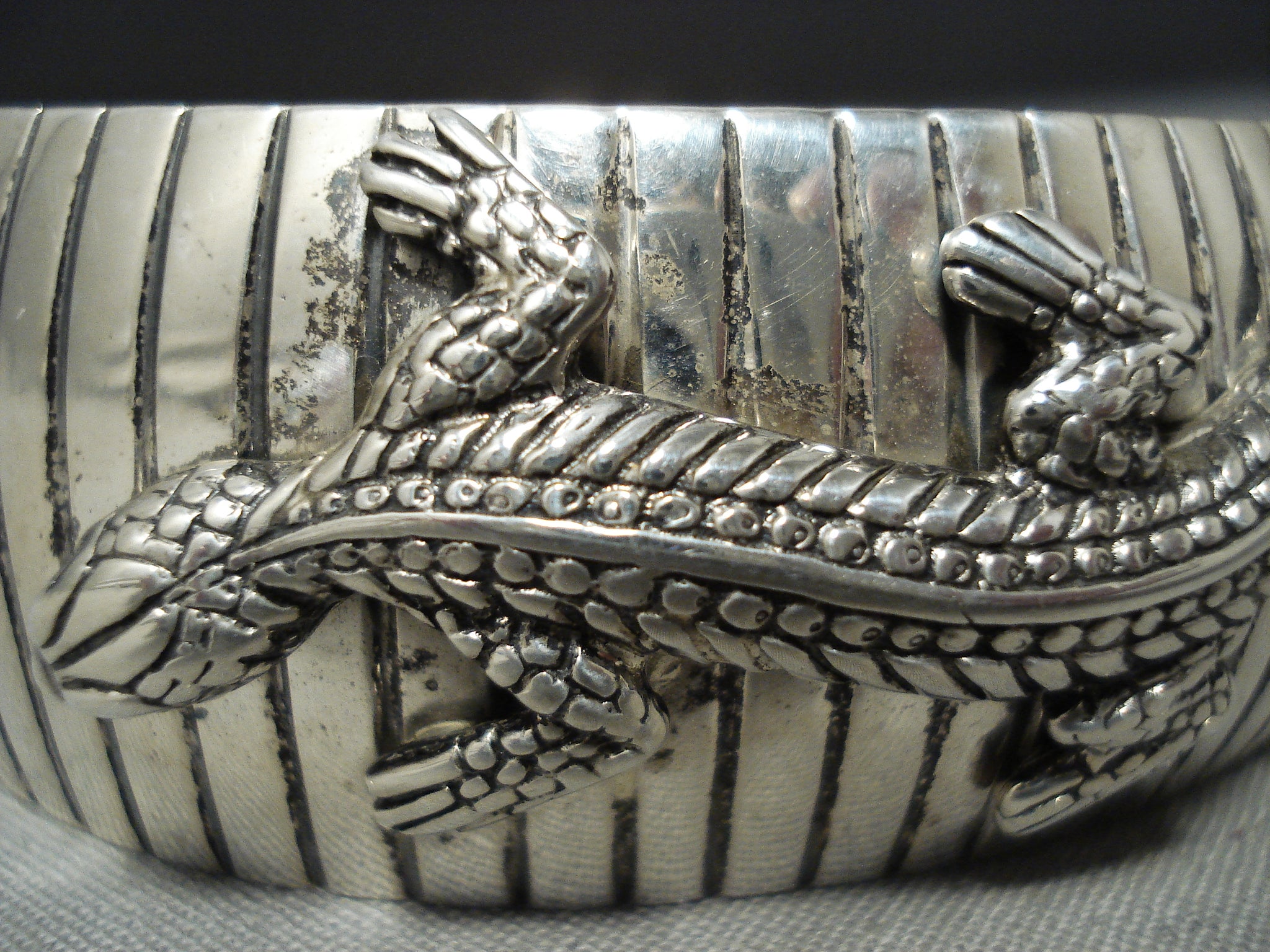 Detailed Lizard Vintage Native American Navajo Sterling Silver Channeled Bracelet Cuff