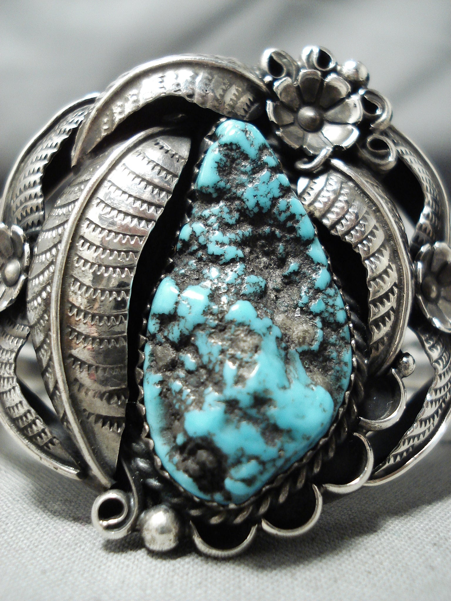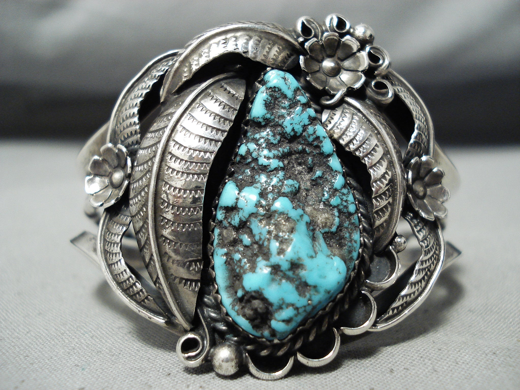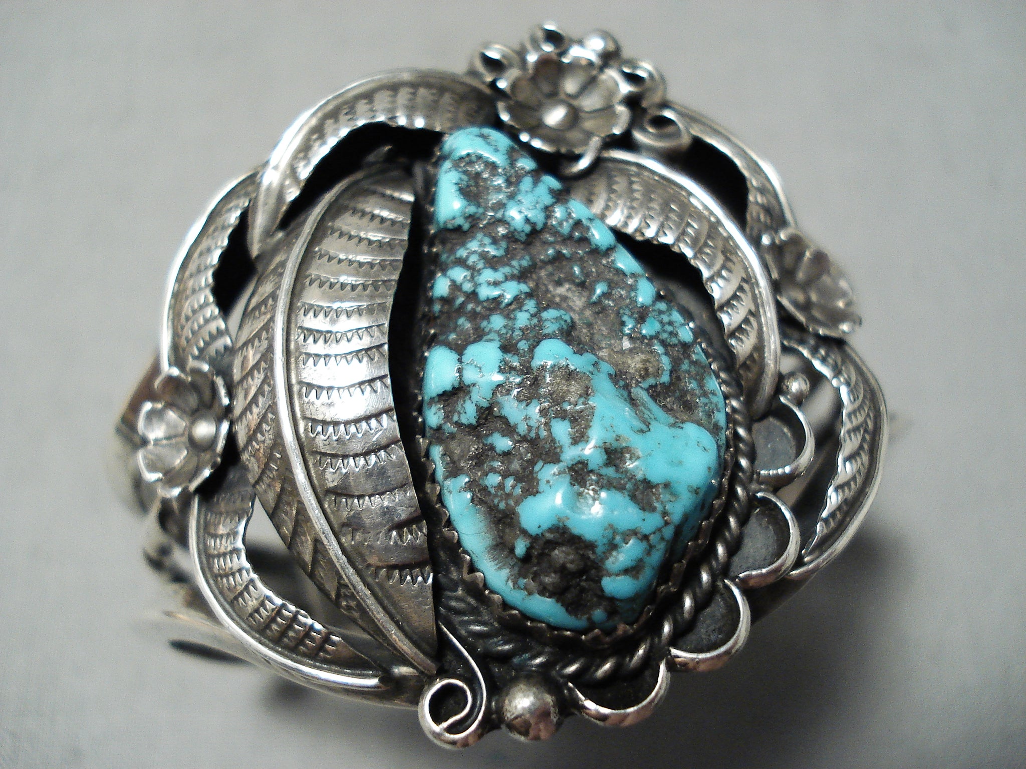 Detailed Rare Turquoise Vintage Native American Navajo Sterling Silver Bracelet Old