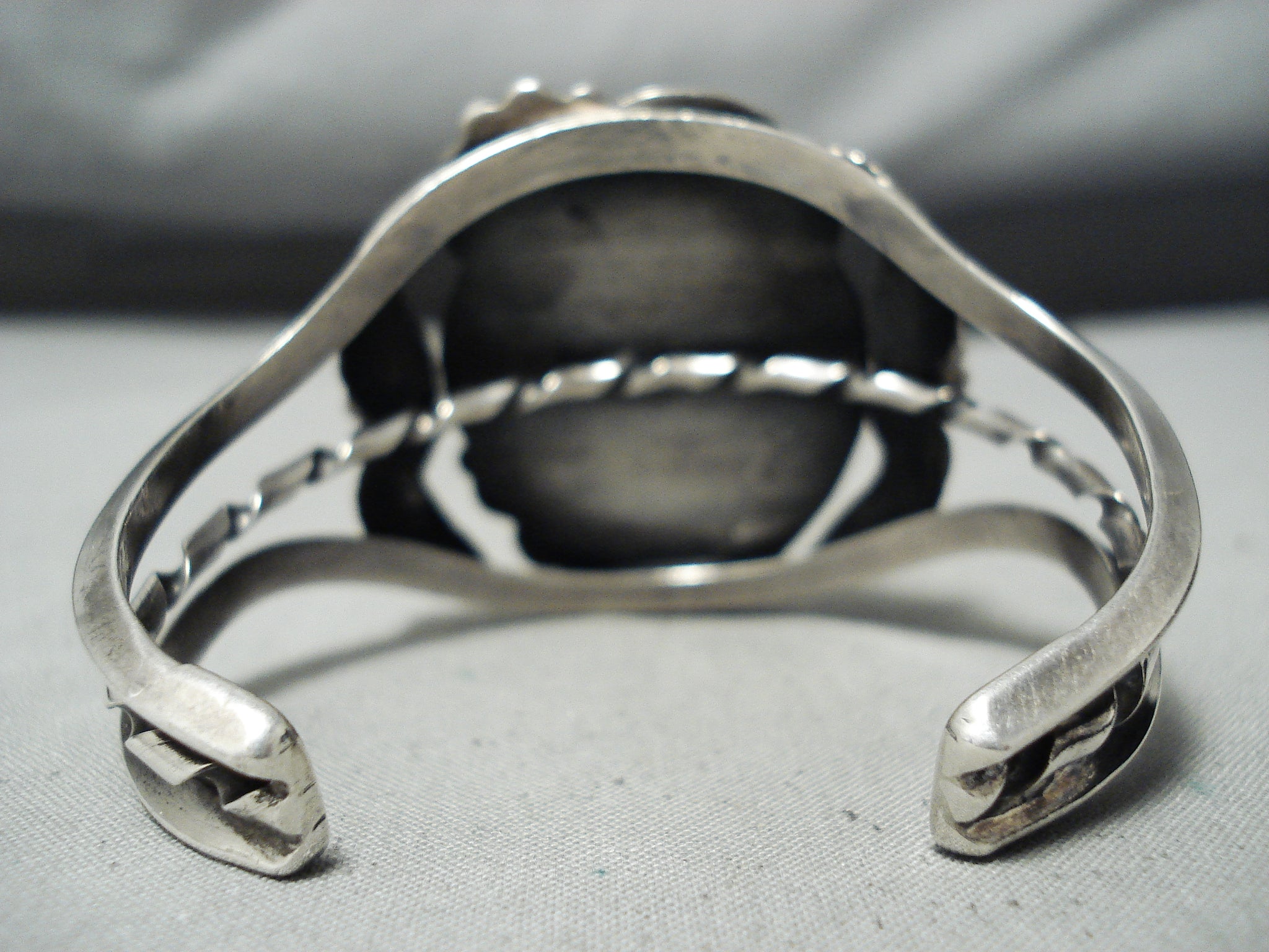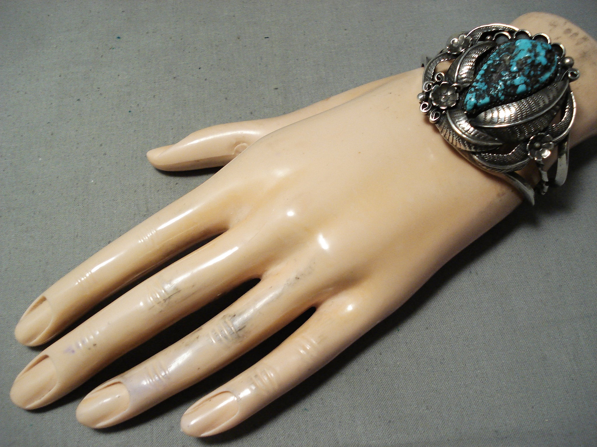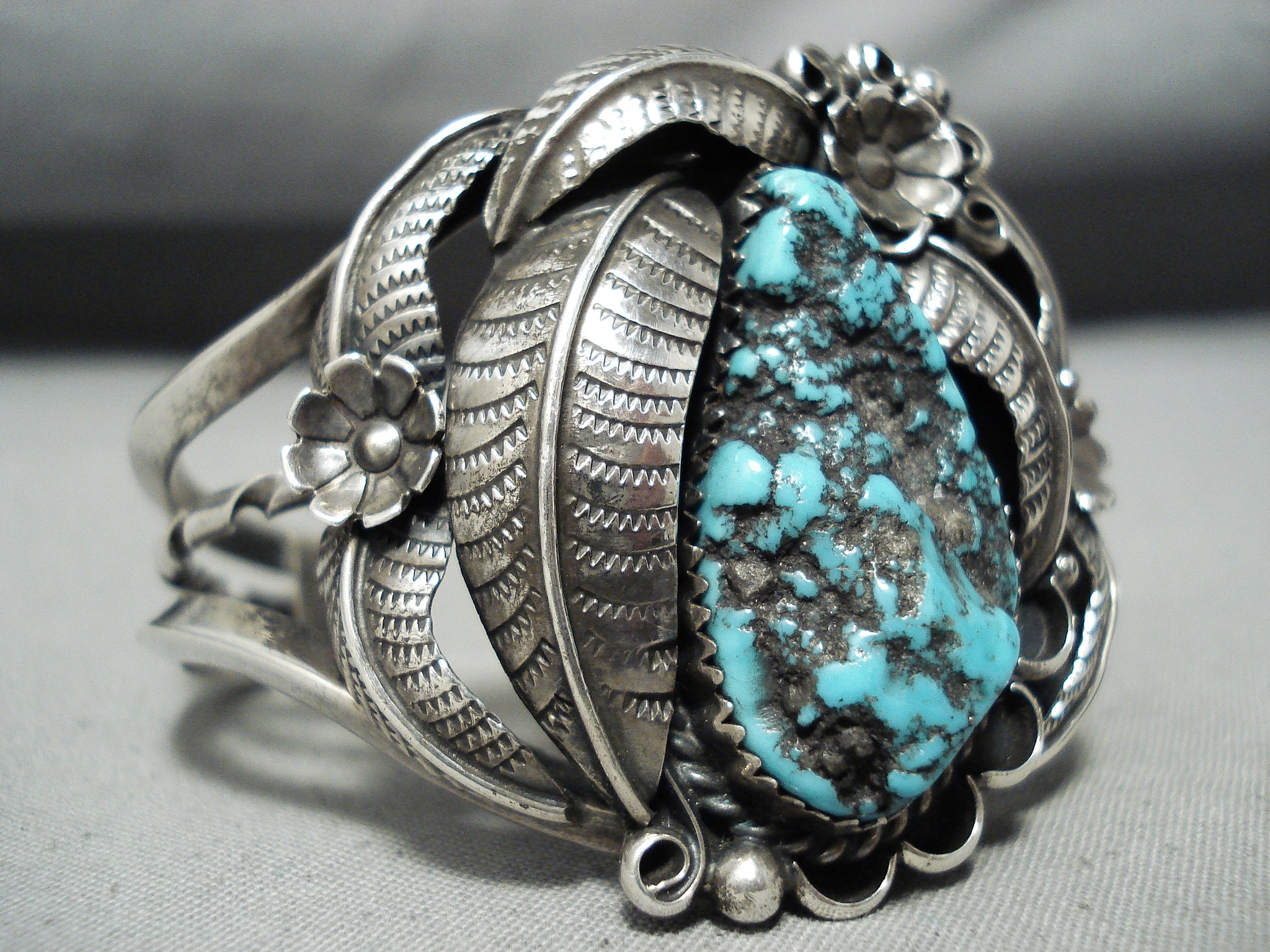 Detailed Rare Turquoise Vintage Native American Navajo Sterling Silver Bracelet Old