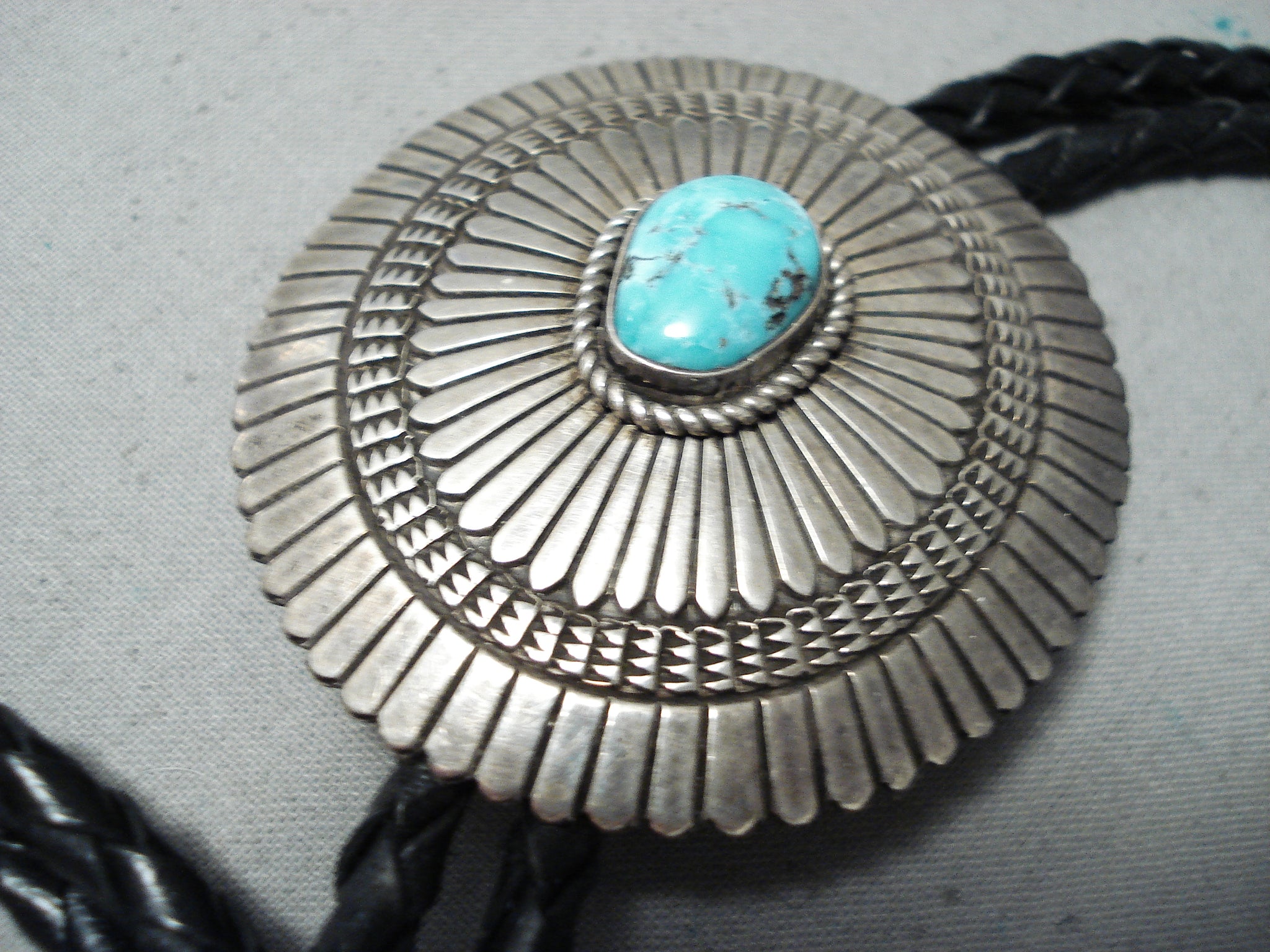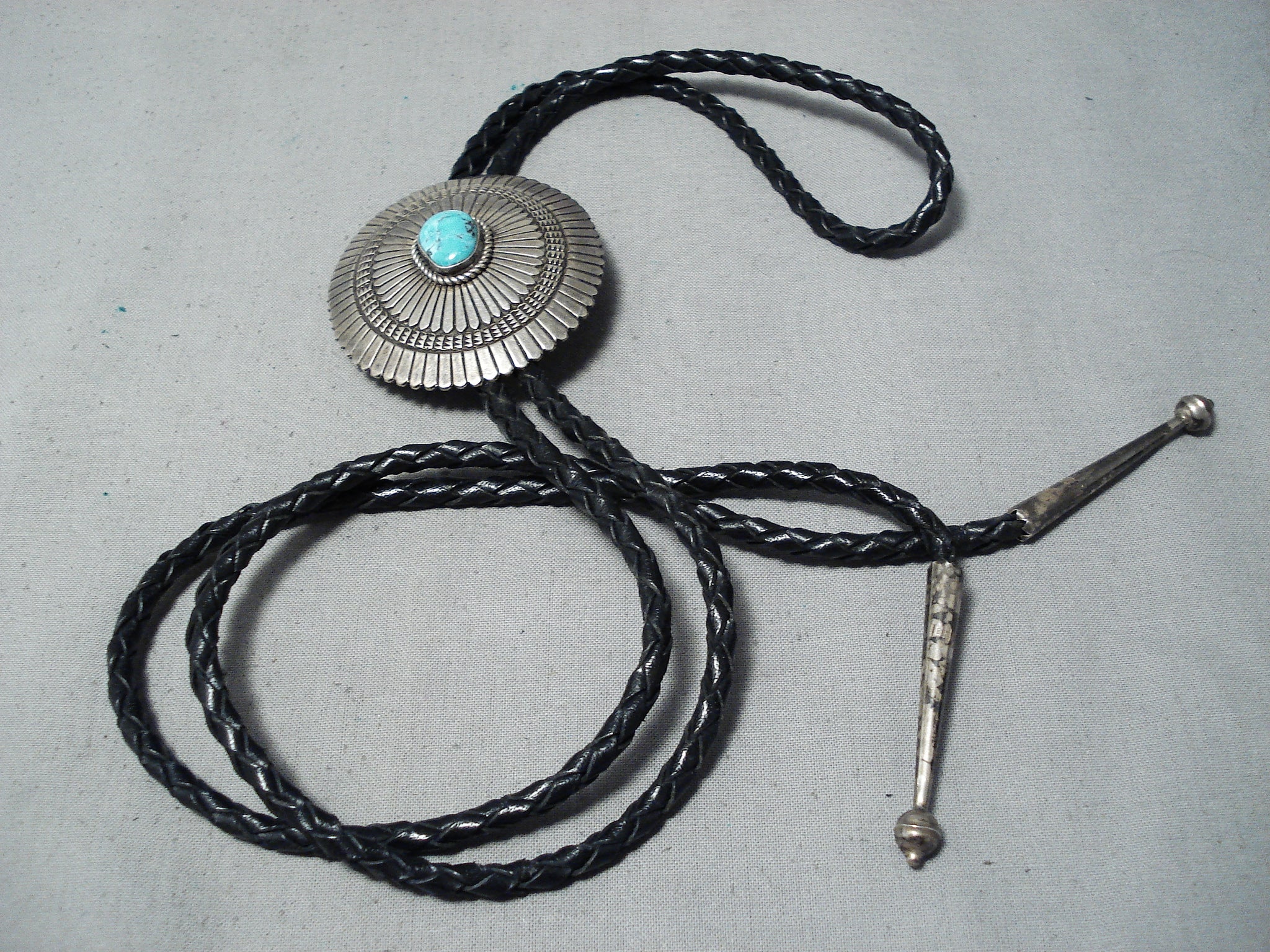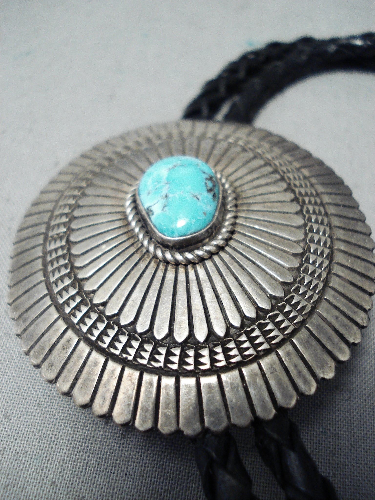 Detailed Vintage Native American Navajo Old Kingman Turquoise Sterling Silver Bolo Tie Old