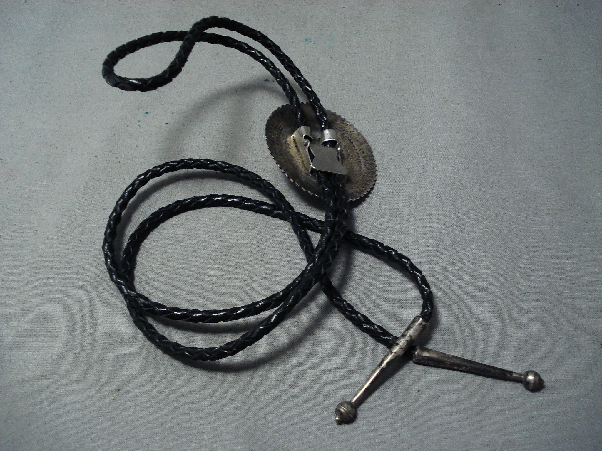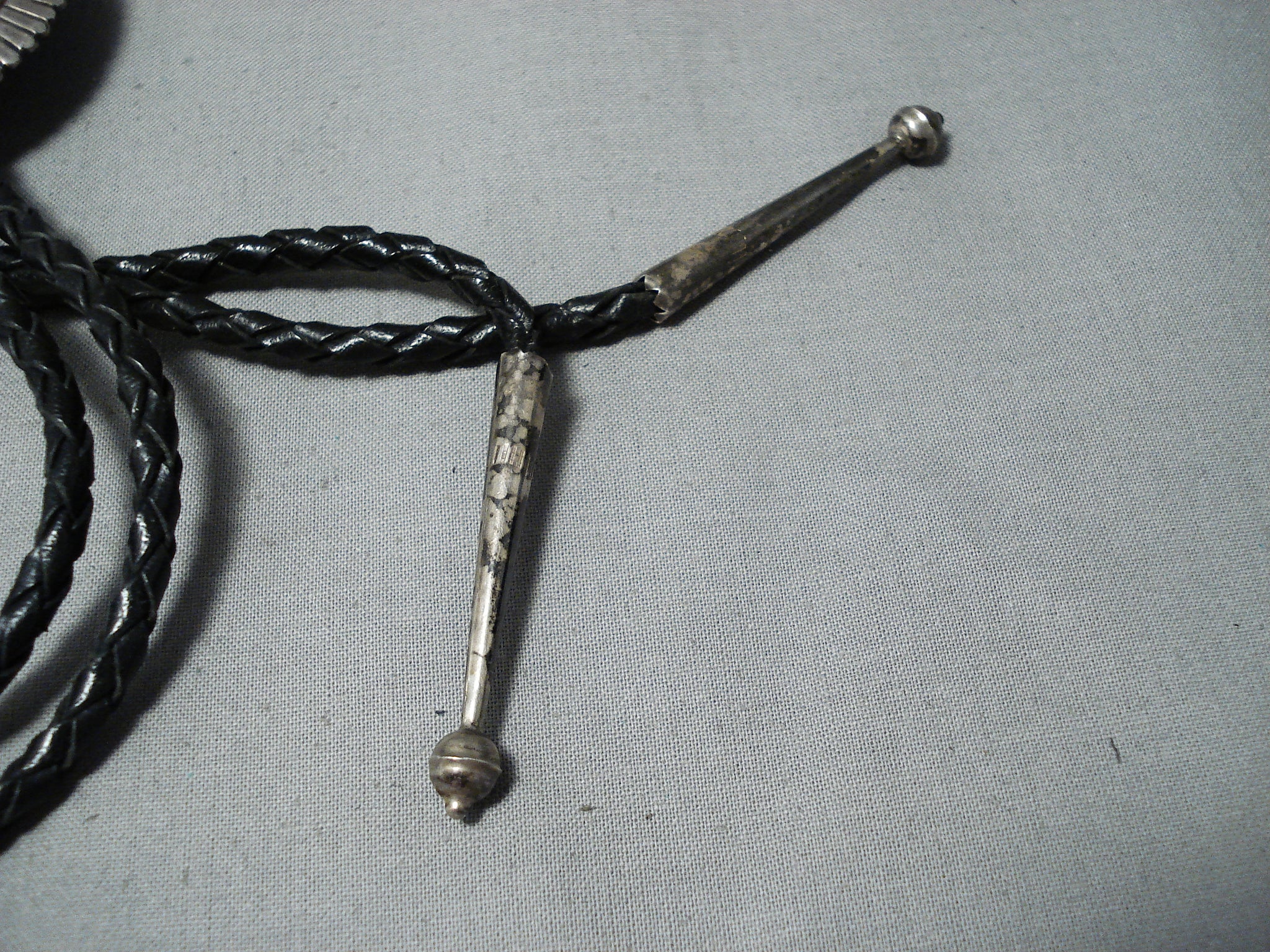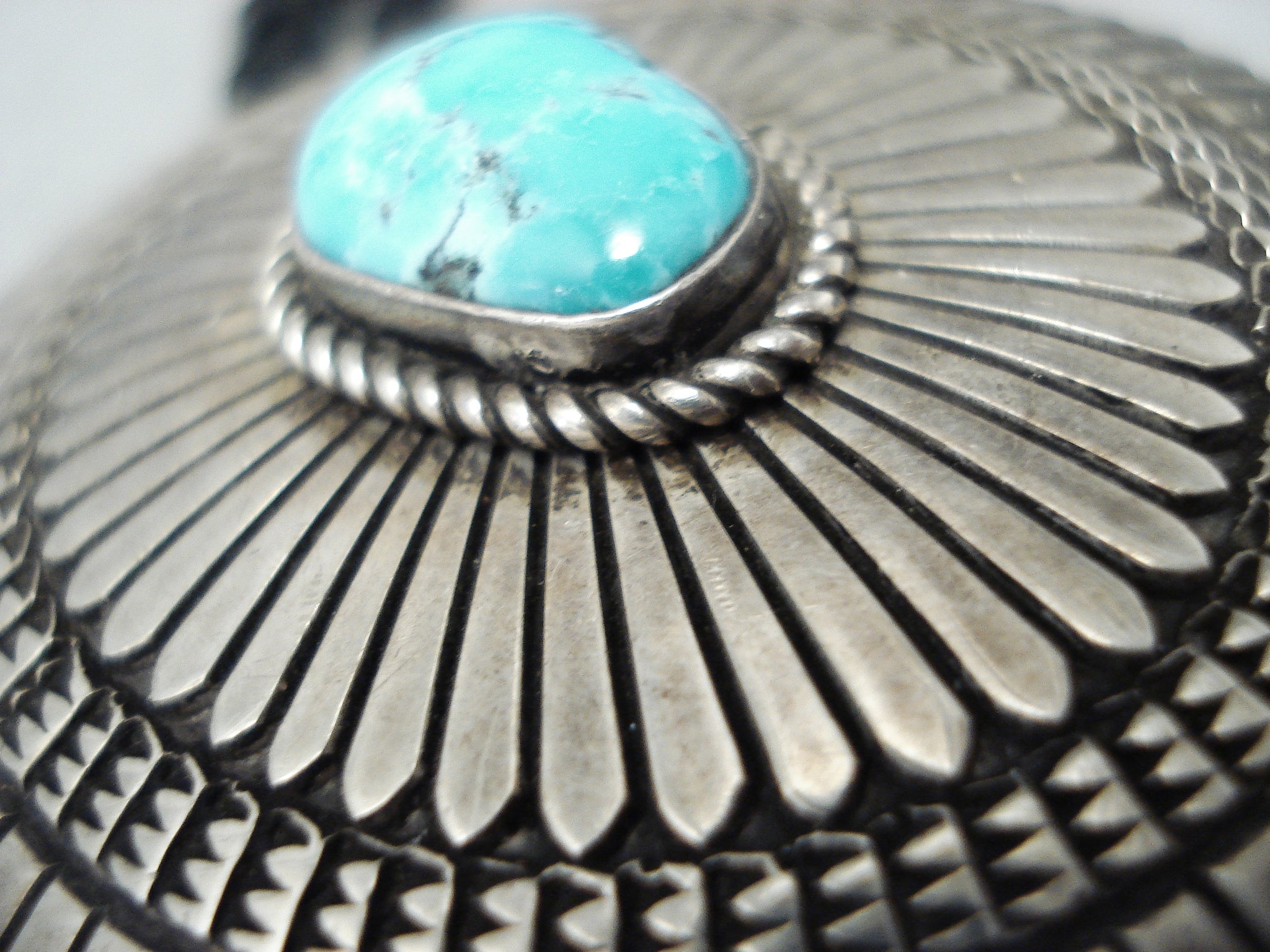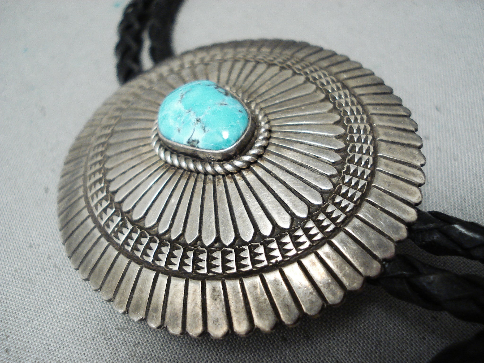 Detailed Vintage Native American Navajo Old Kingman Turquoise Sterling Silver Bolo Tie Old