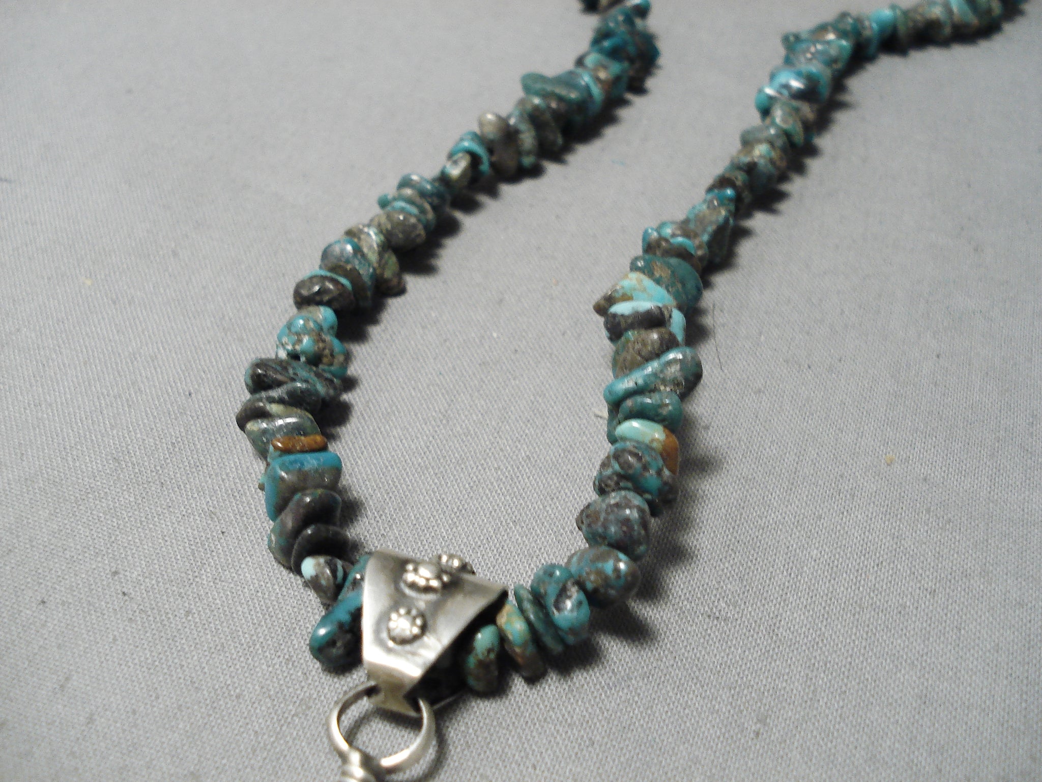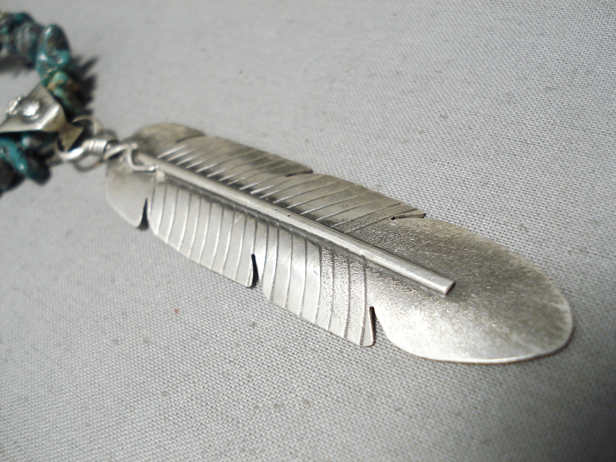Detailed!! Vintage Native American Navajo Sterling Silver Green Turquoise Feather Necklace